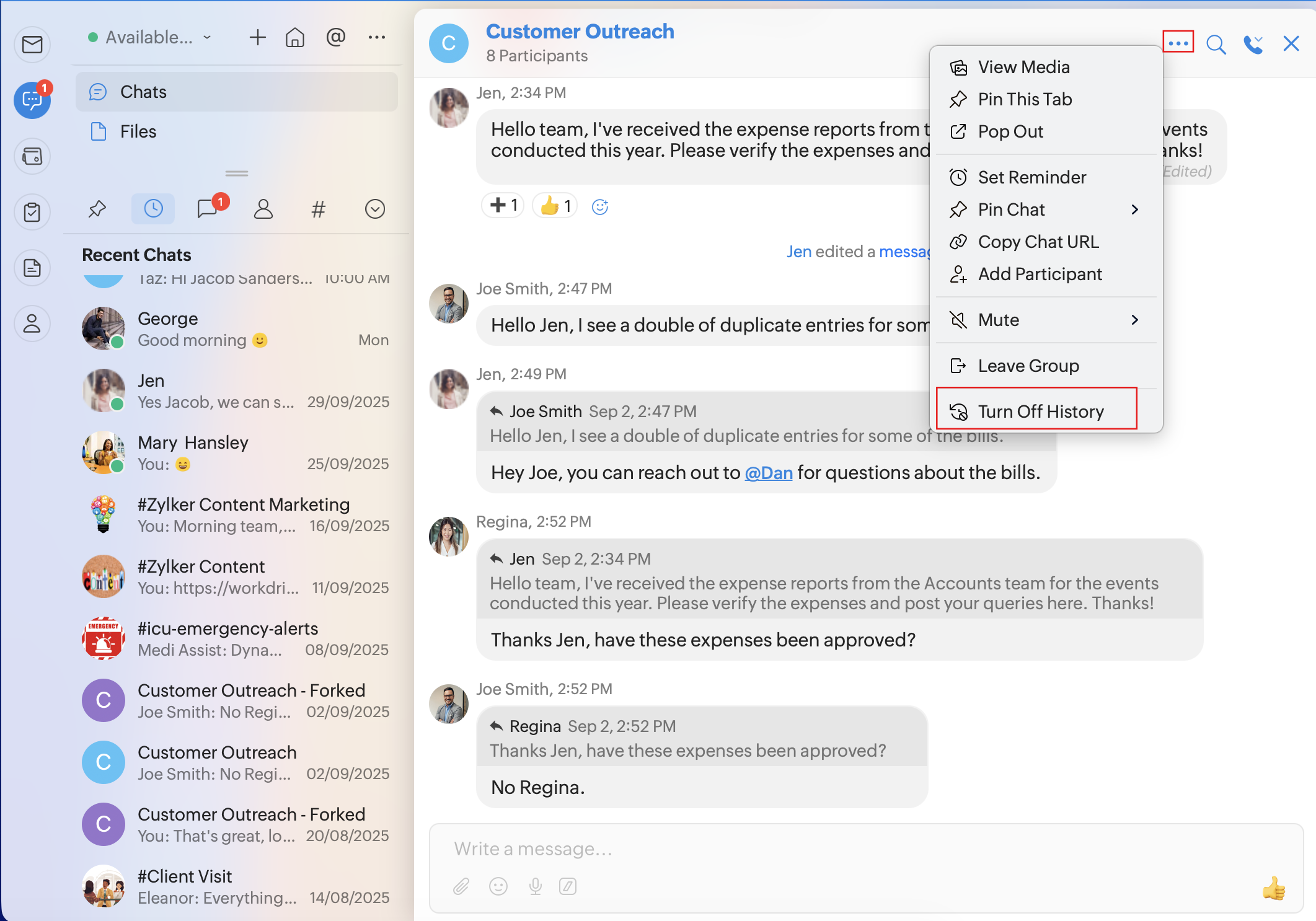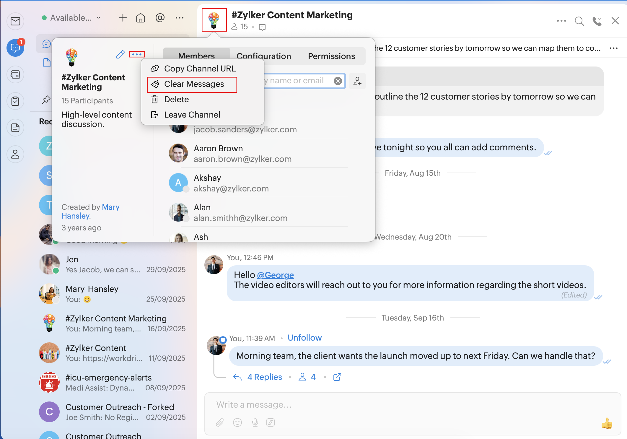 Clear Messages: To clear the entire conversation from a channel. The complete chat history will be lost and cannot be restored. This option is available only for channels.