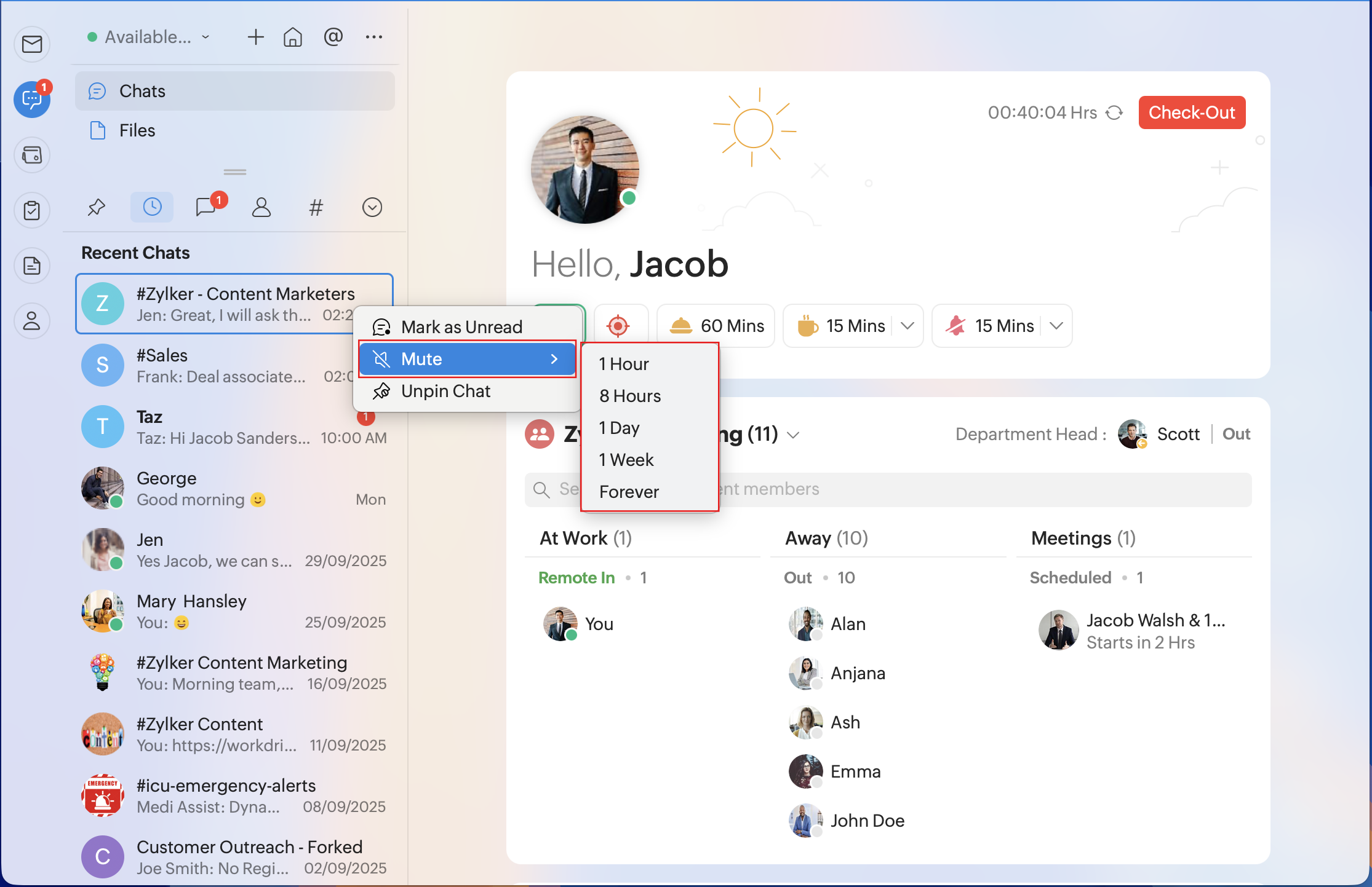 Mute: To silence messages and notifications. However, if a user @mentions you, you will be notified. You can mute a channel for one hour, eight hours, one day, one week, or forever.