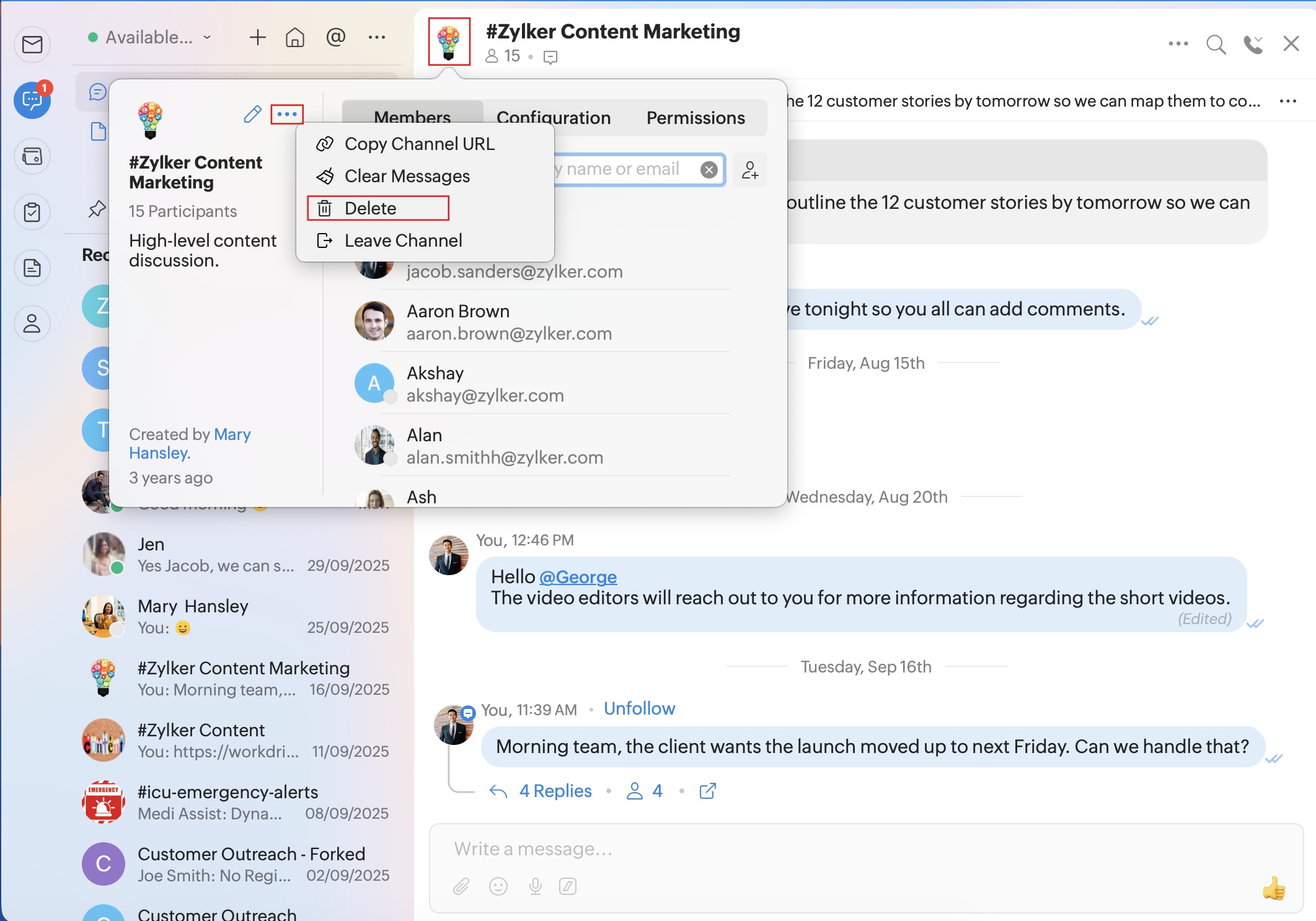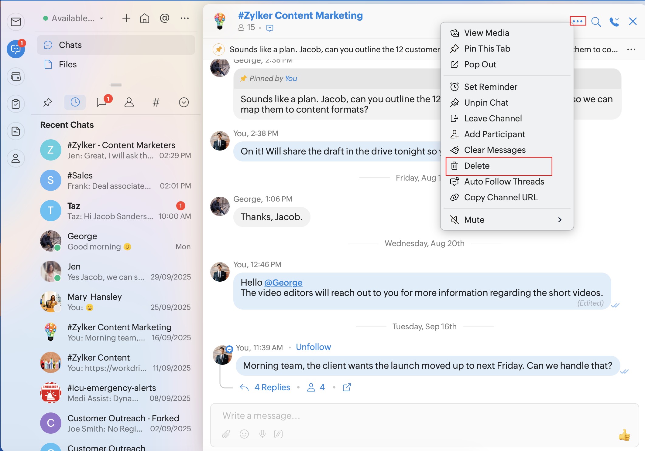 Delete: To delete a channel. This option applies only for channels. You cannot delete one-on-one chats, groups, or forked conversations.