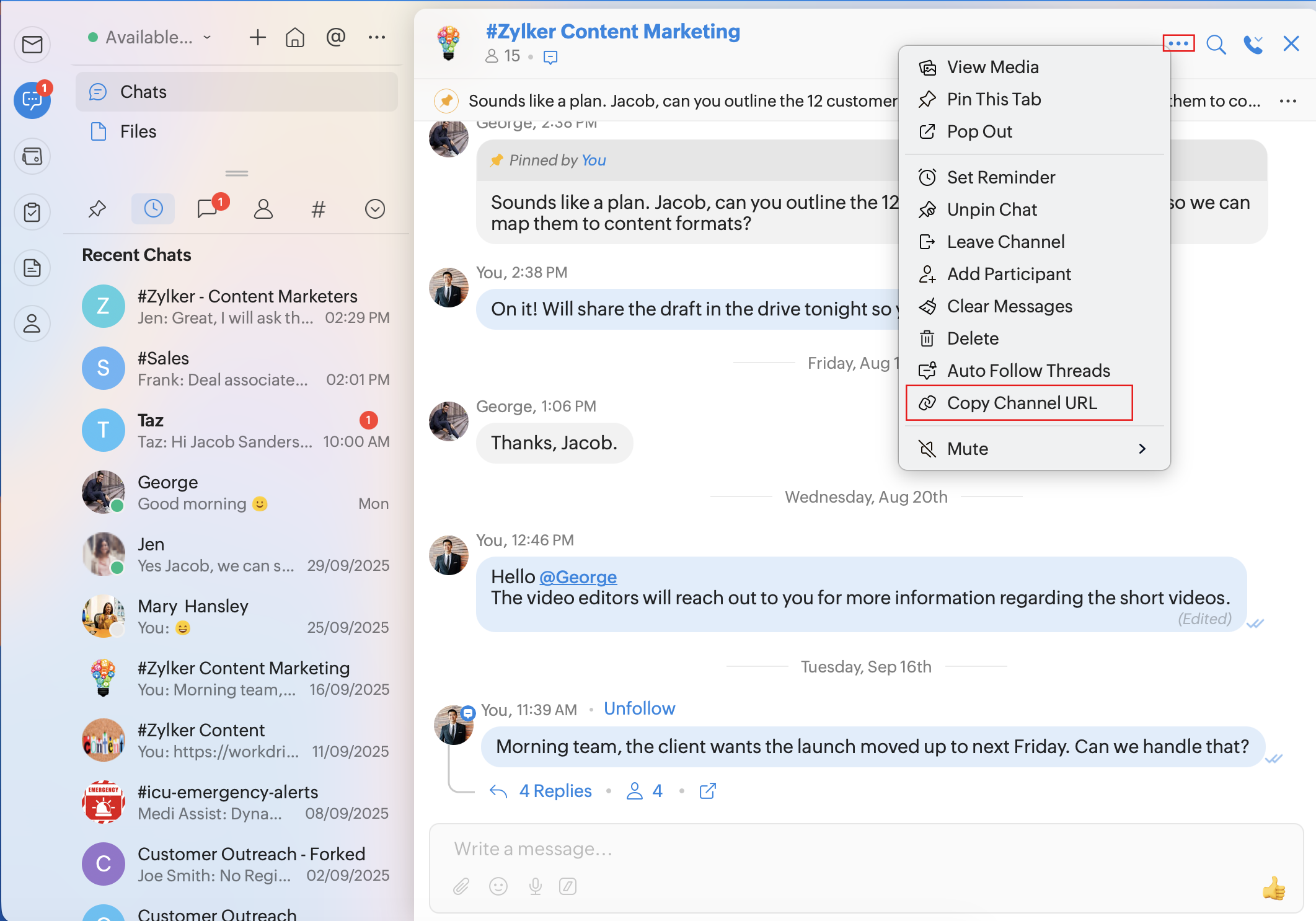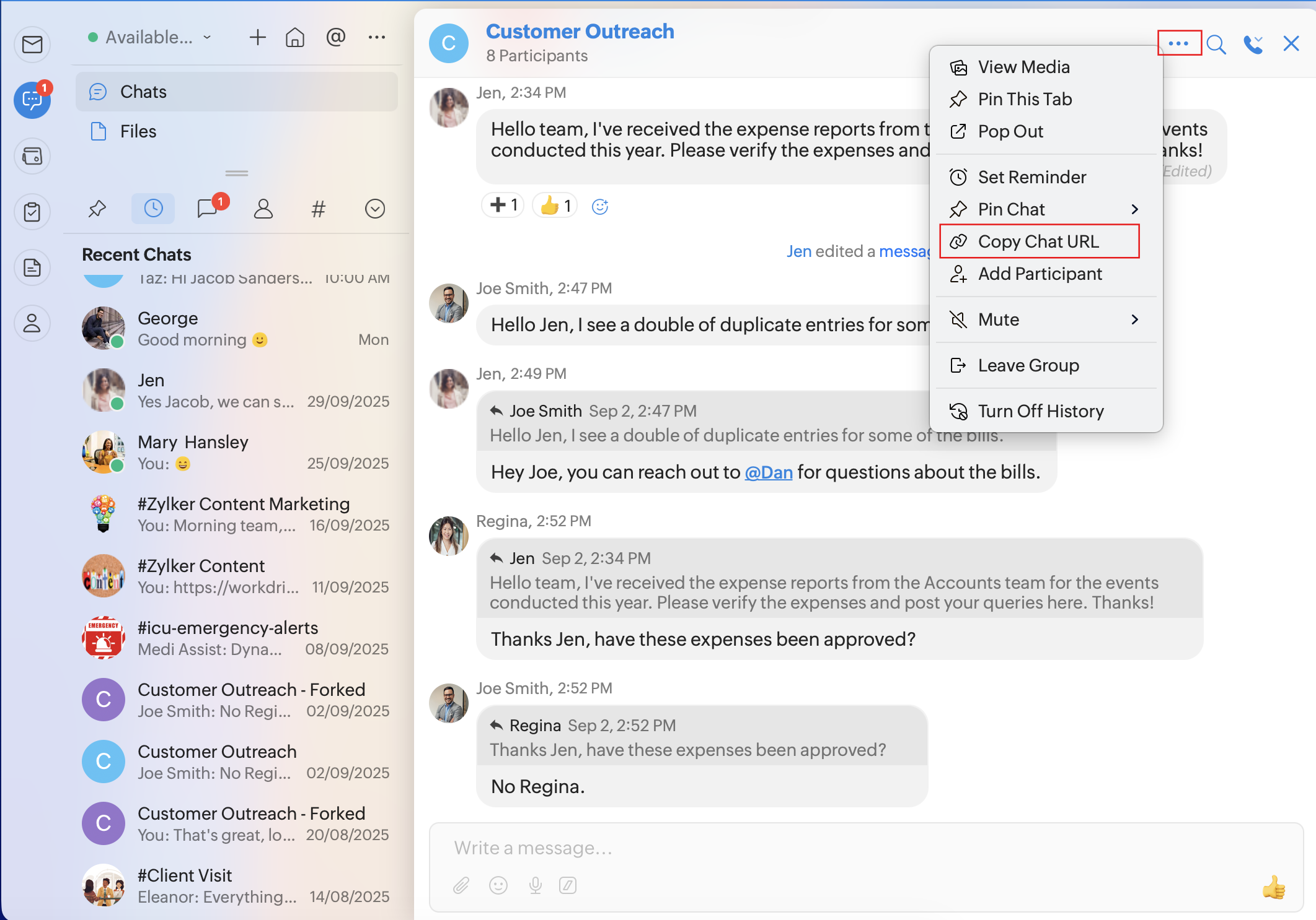 Copy Chat URL: To copy a chat's URL and share with other users.