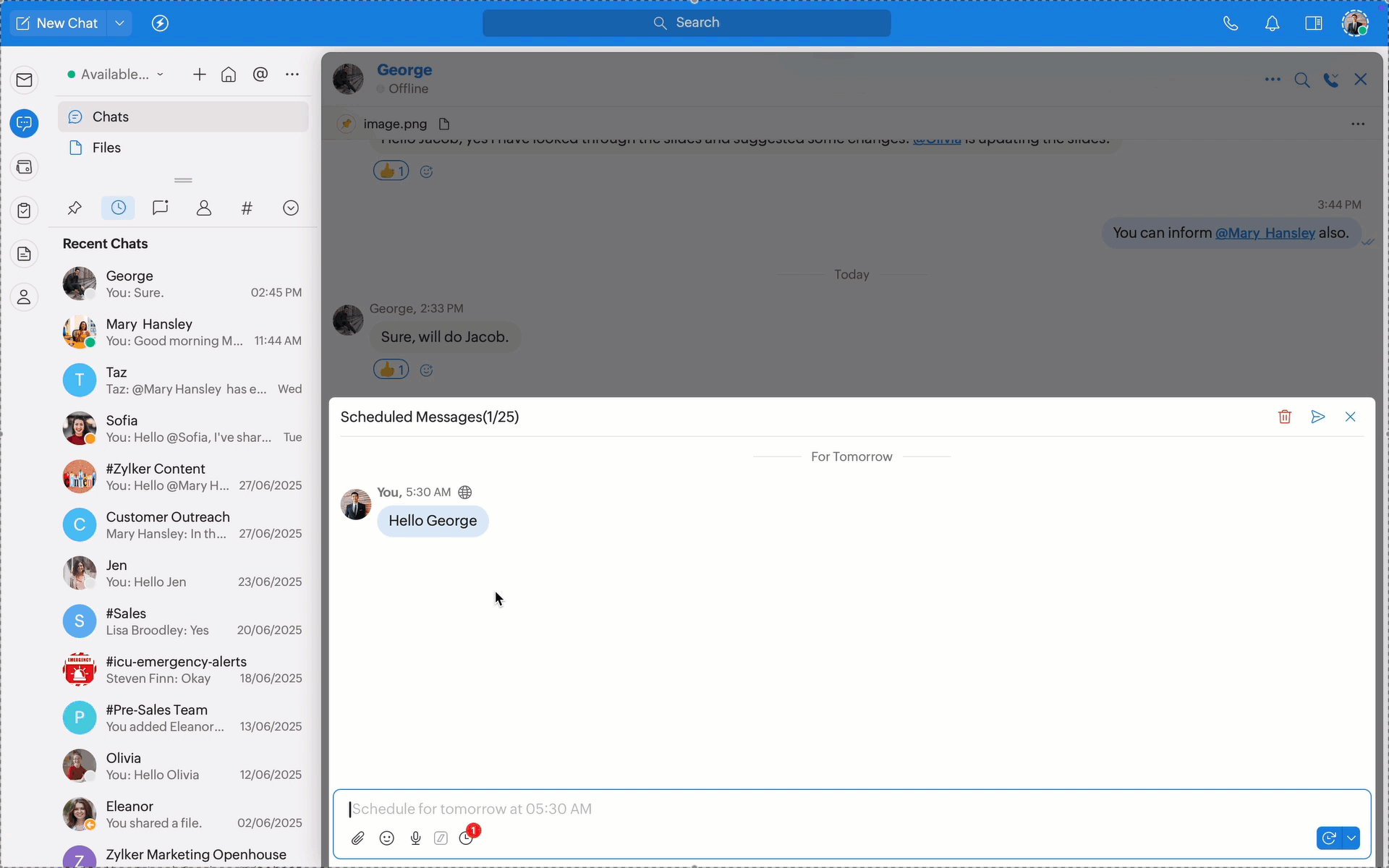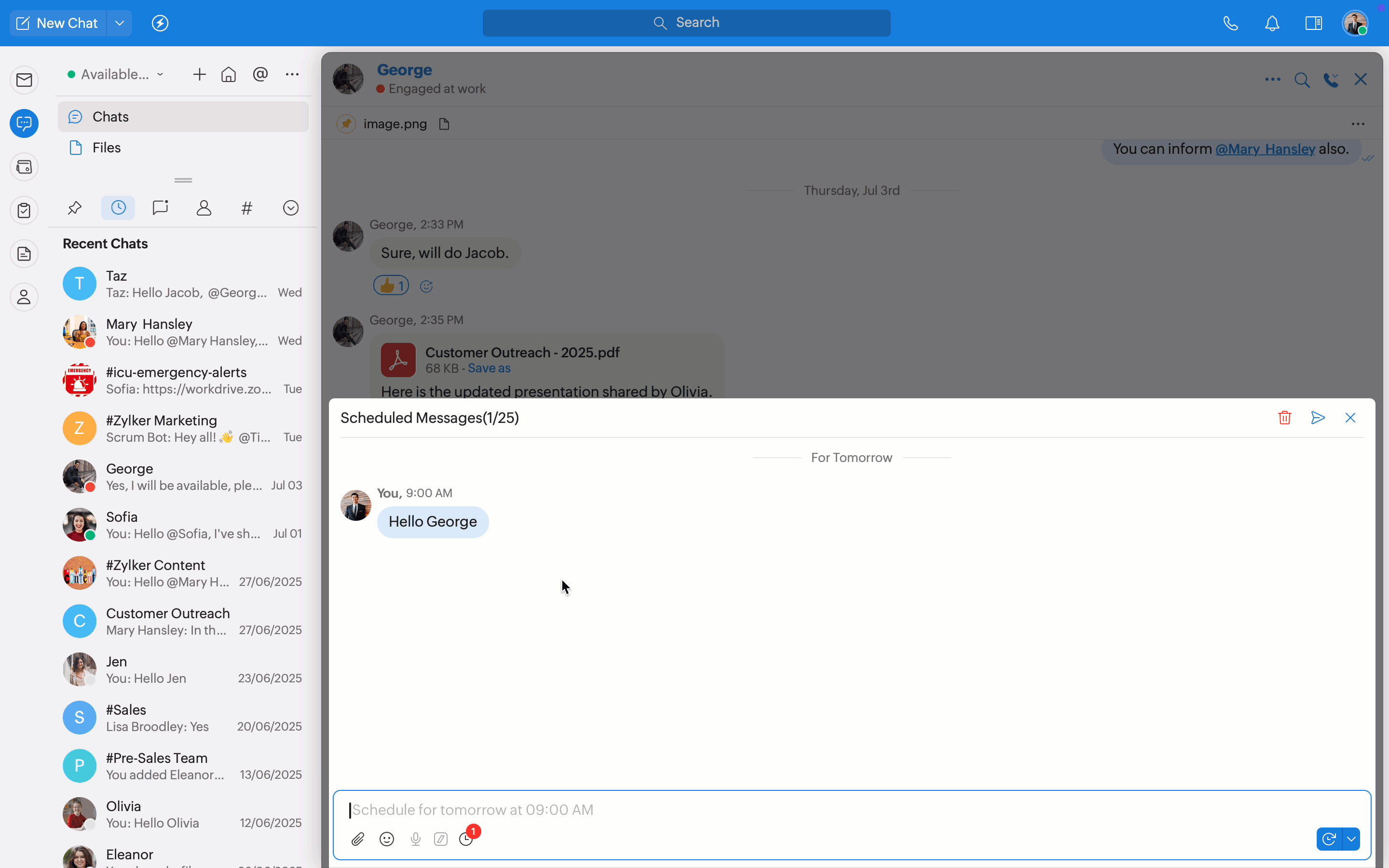 You can schedule messages in groups and channels with the options Tomorrow at 9:00 AM and Custom Date and Time.