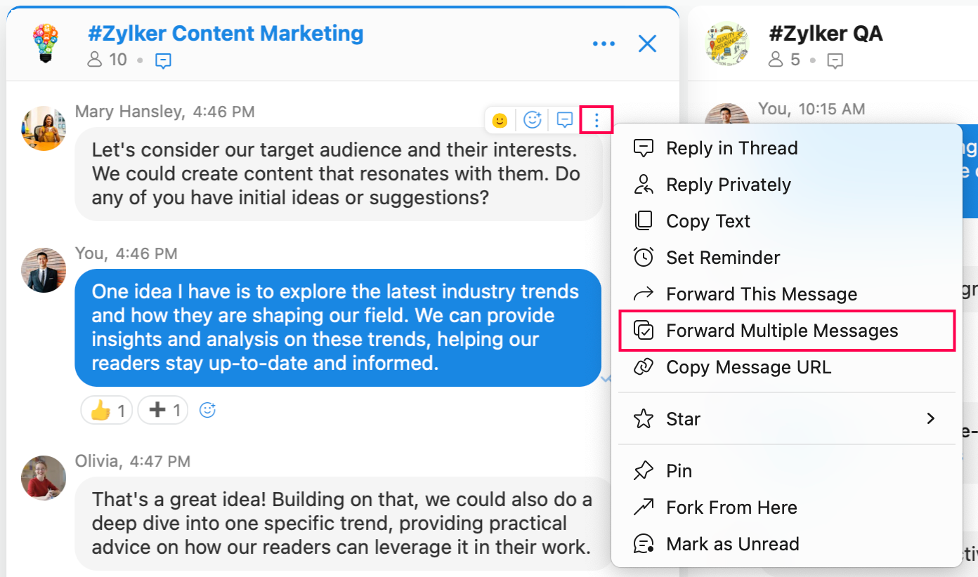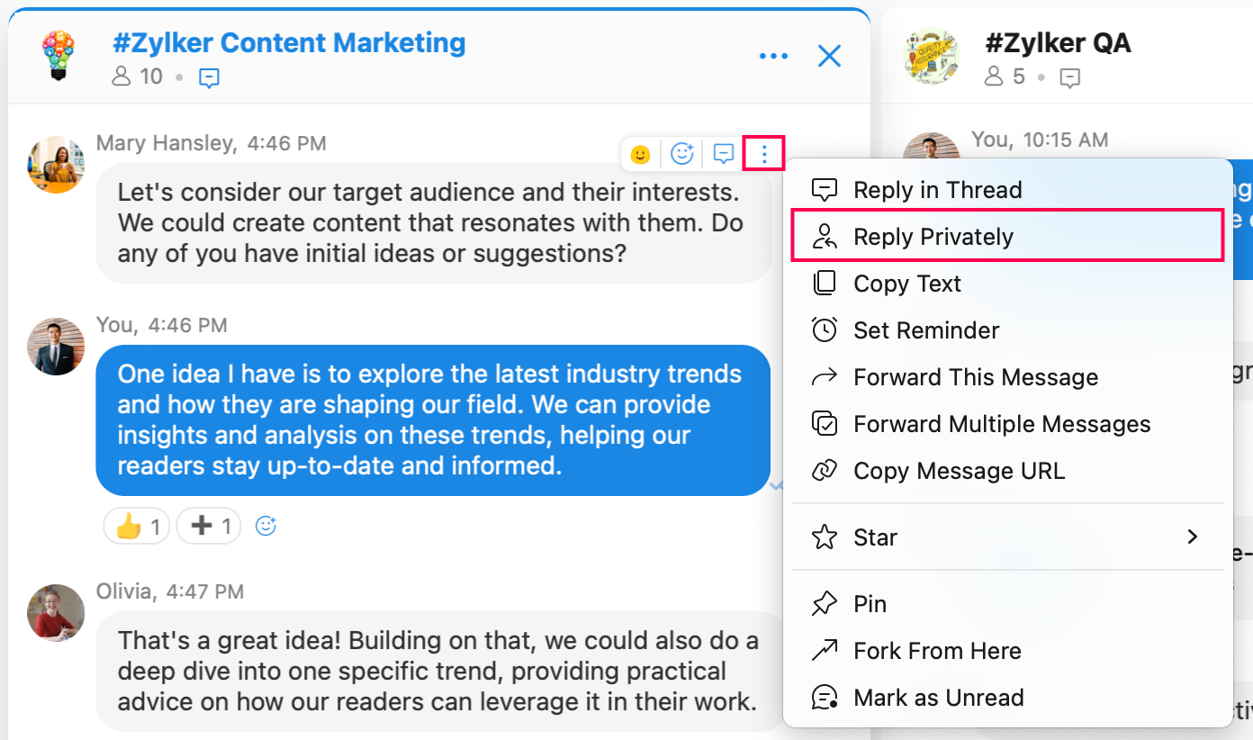 You can reply privately to messages in Cliq channels, threaded conversations, and group chats. To do so: