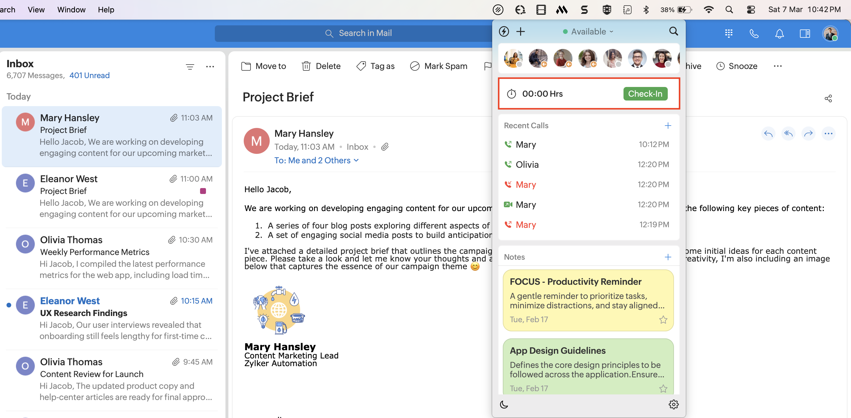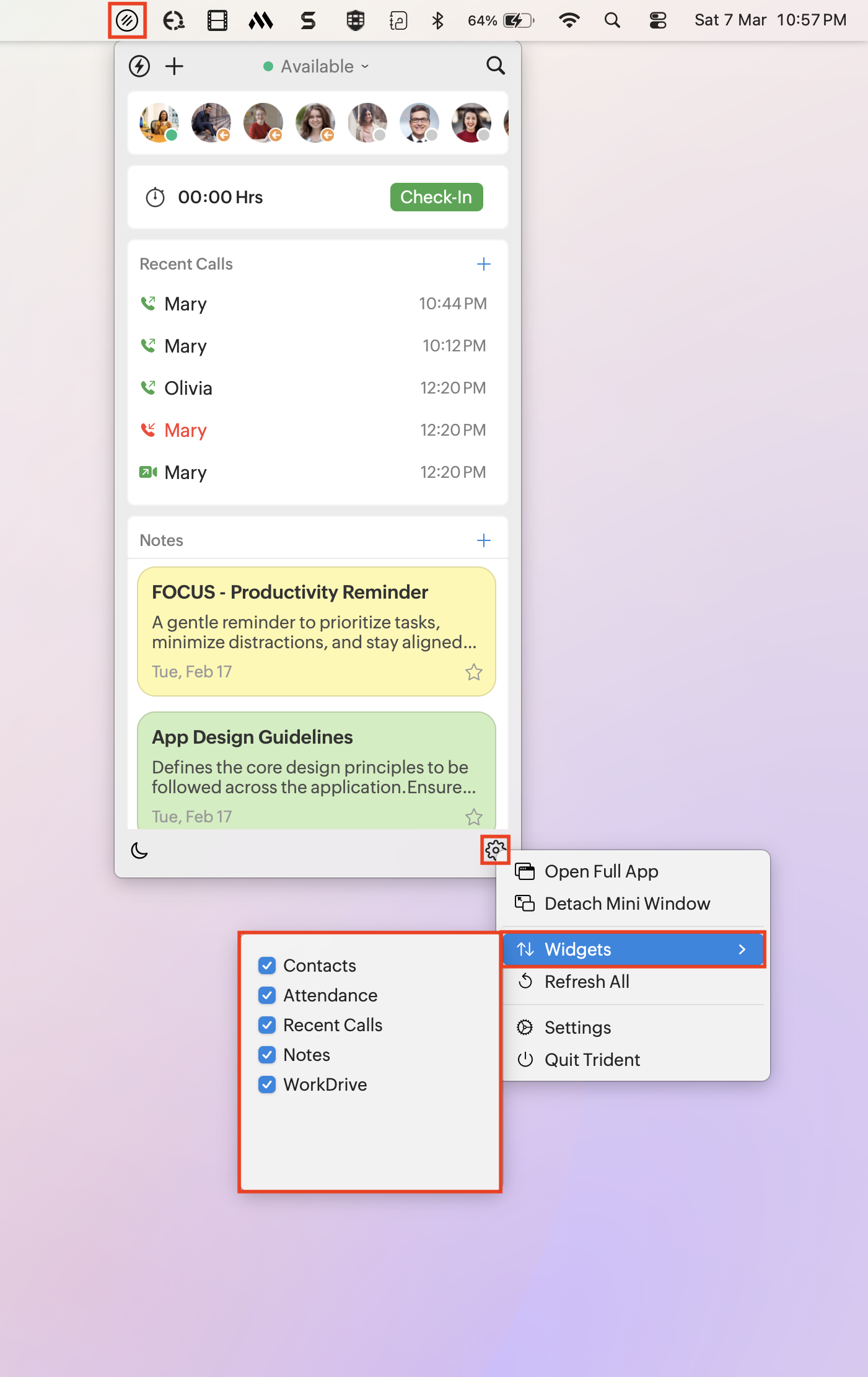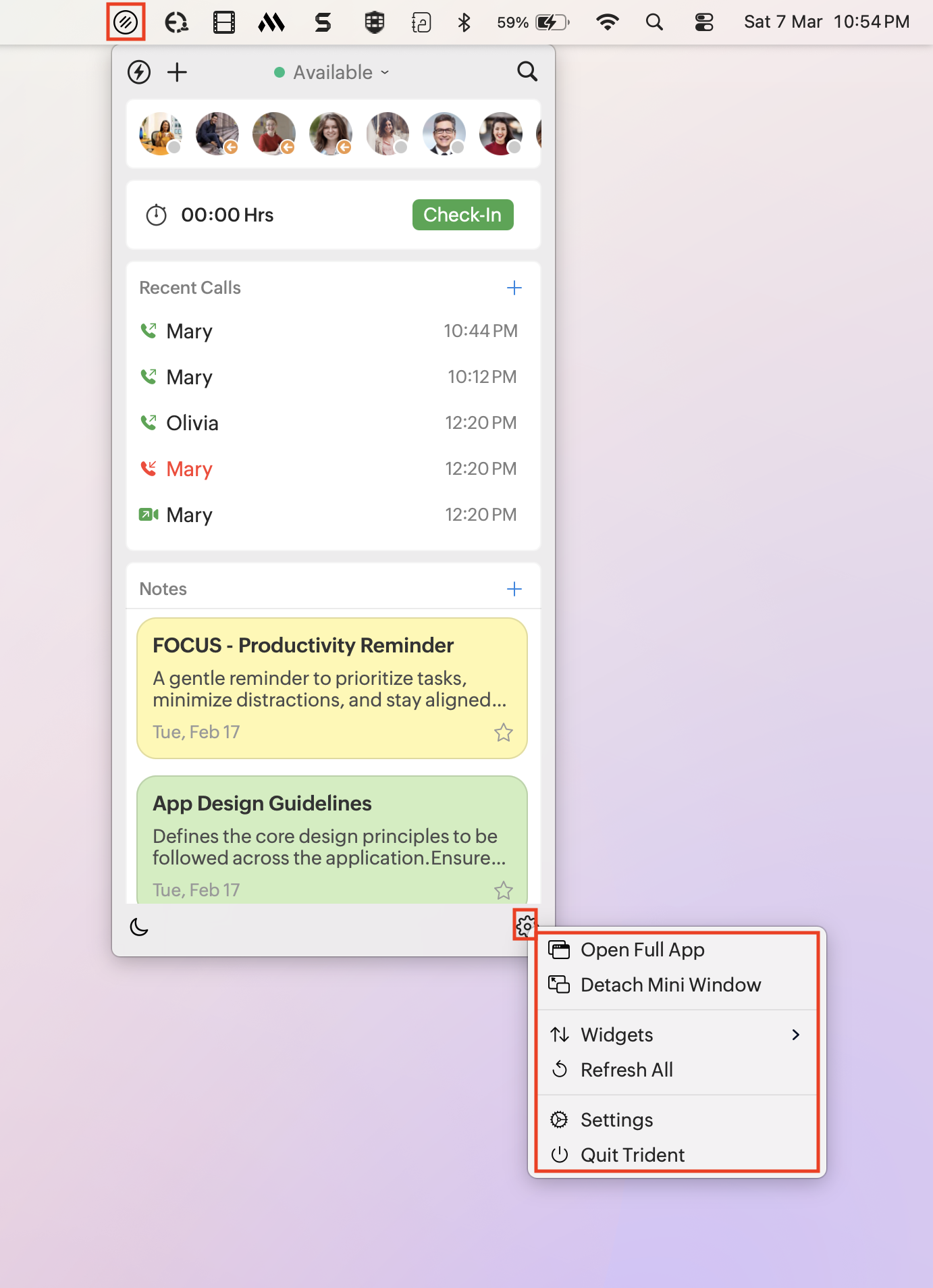 Learn more about the Mail module in Trident.Trident's menu bar app for Cliq enables you to change your Cliq status, chat with frequent contacts, and make calls. It also displays the recent call history.