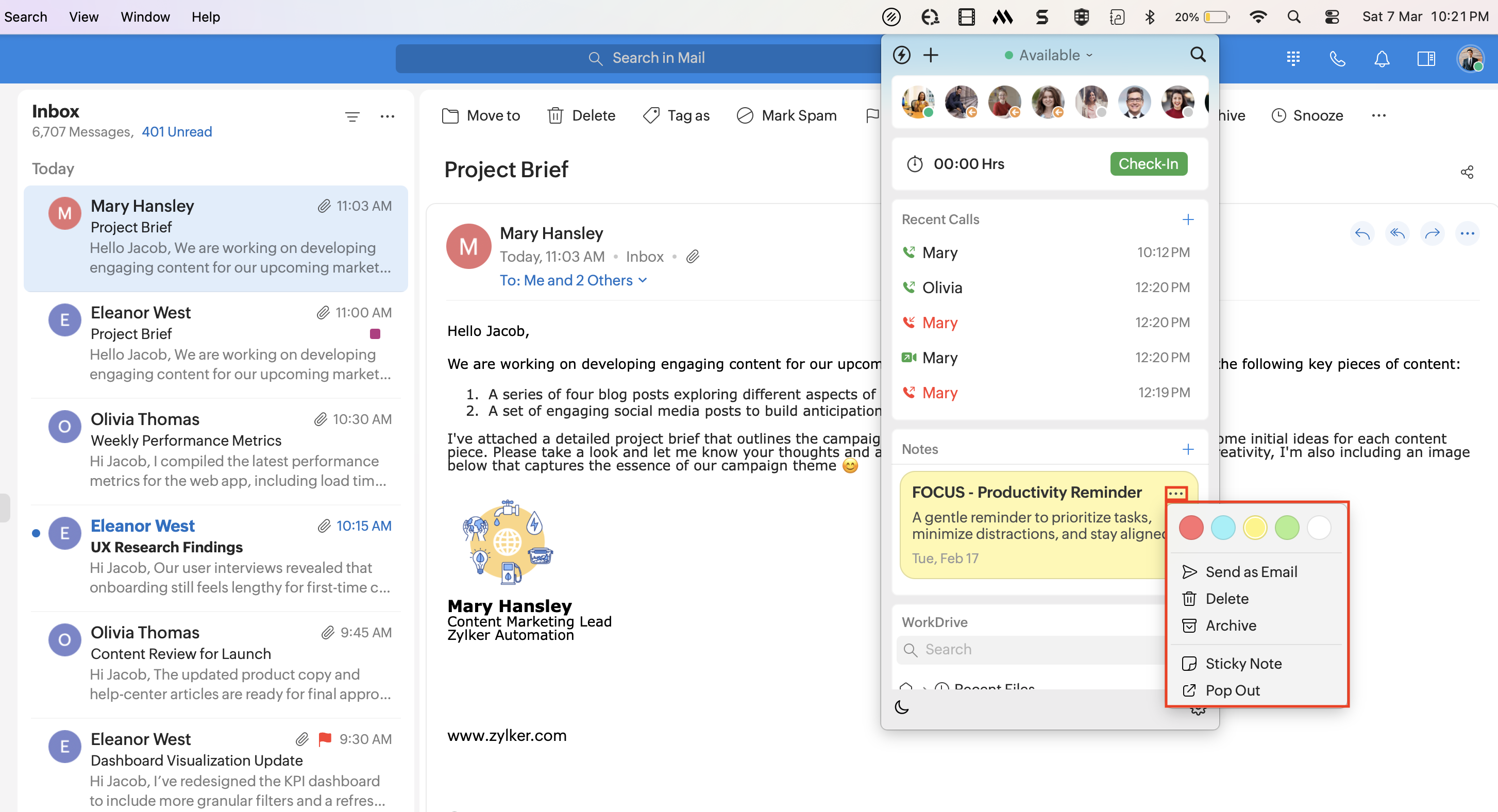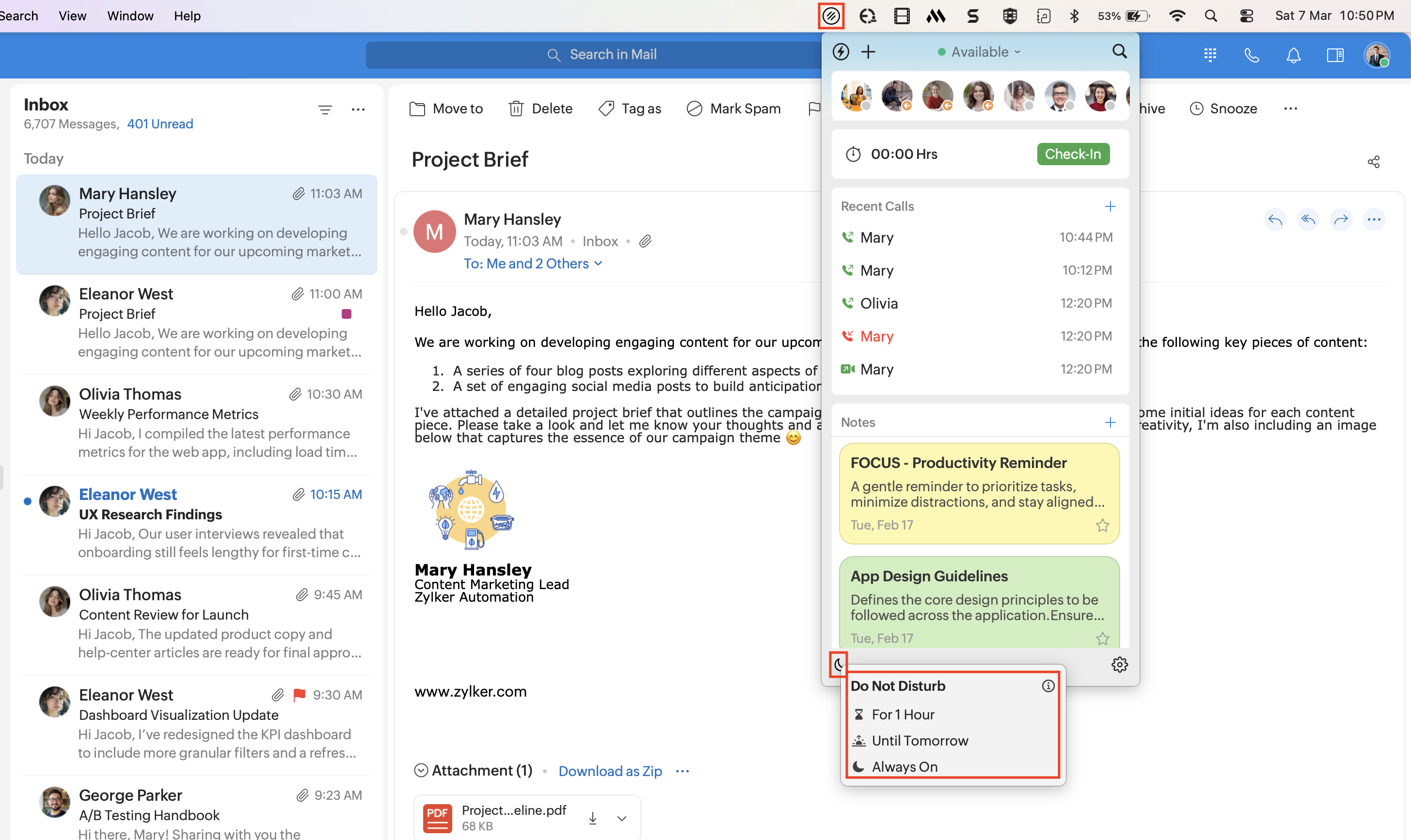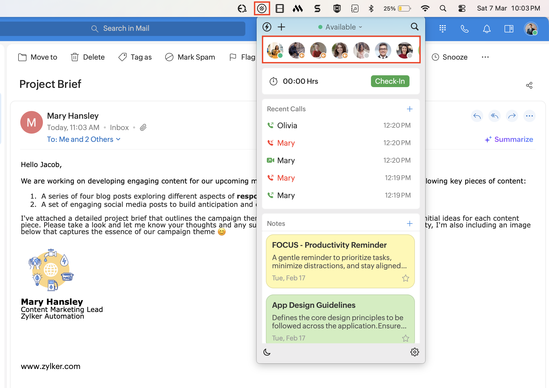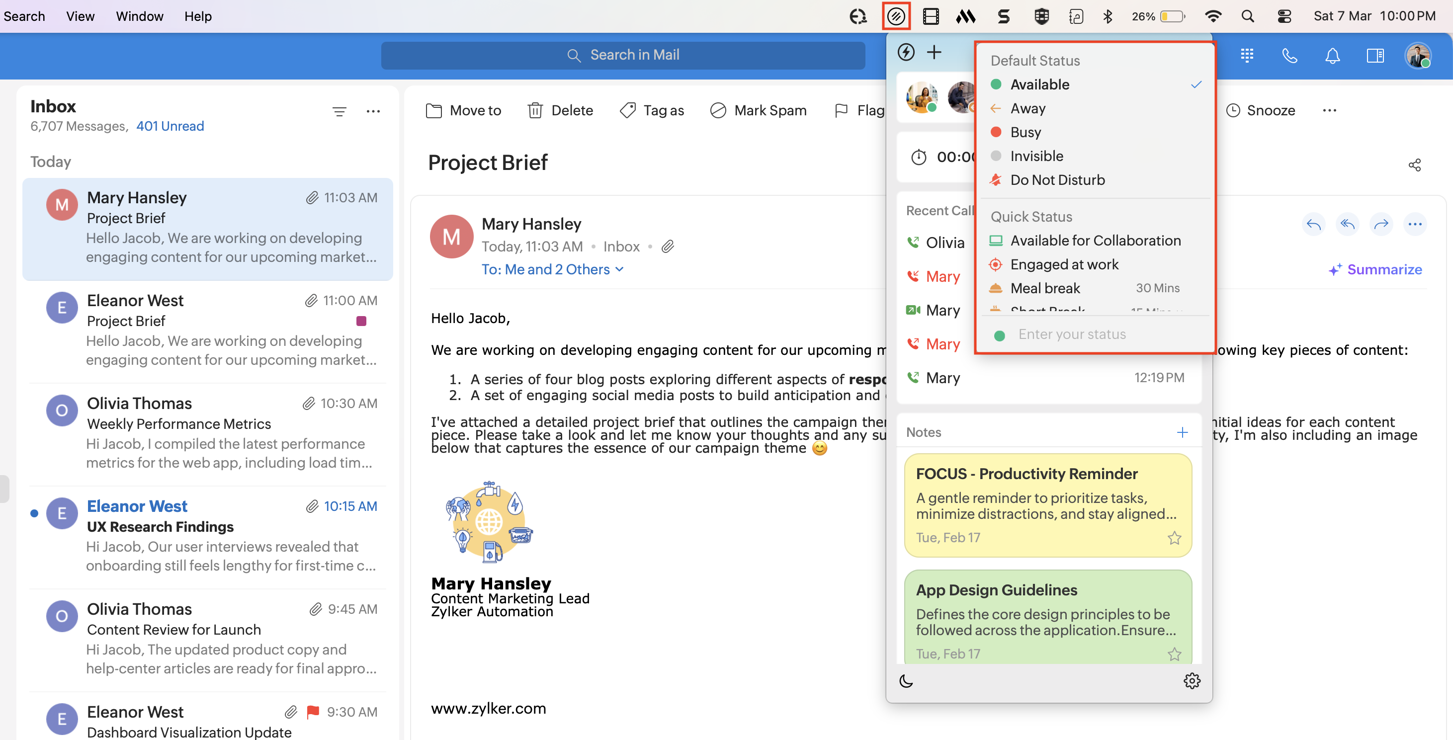 Learn more about the Mail module in Trident.Trident's menu bar app for Cliq enables you to change your Cliq status, chat with frequent contacts, and make calls. It also displays the recent call history.
