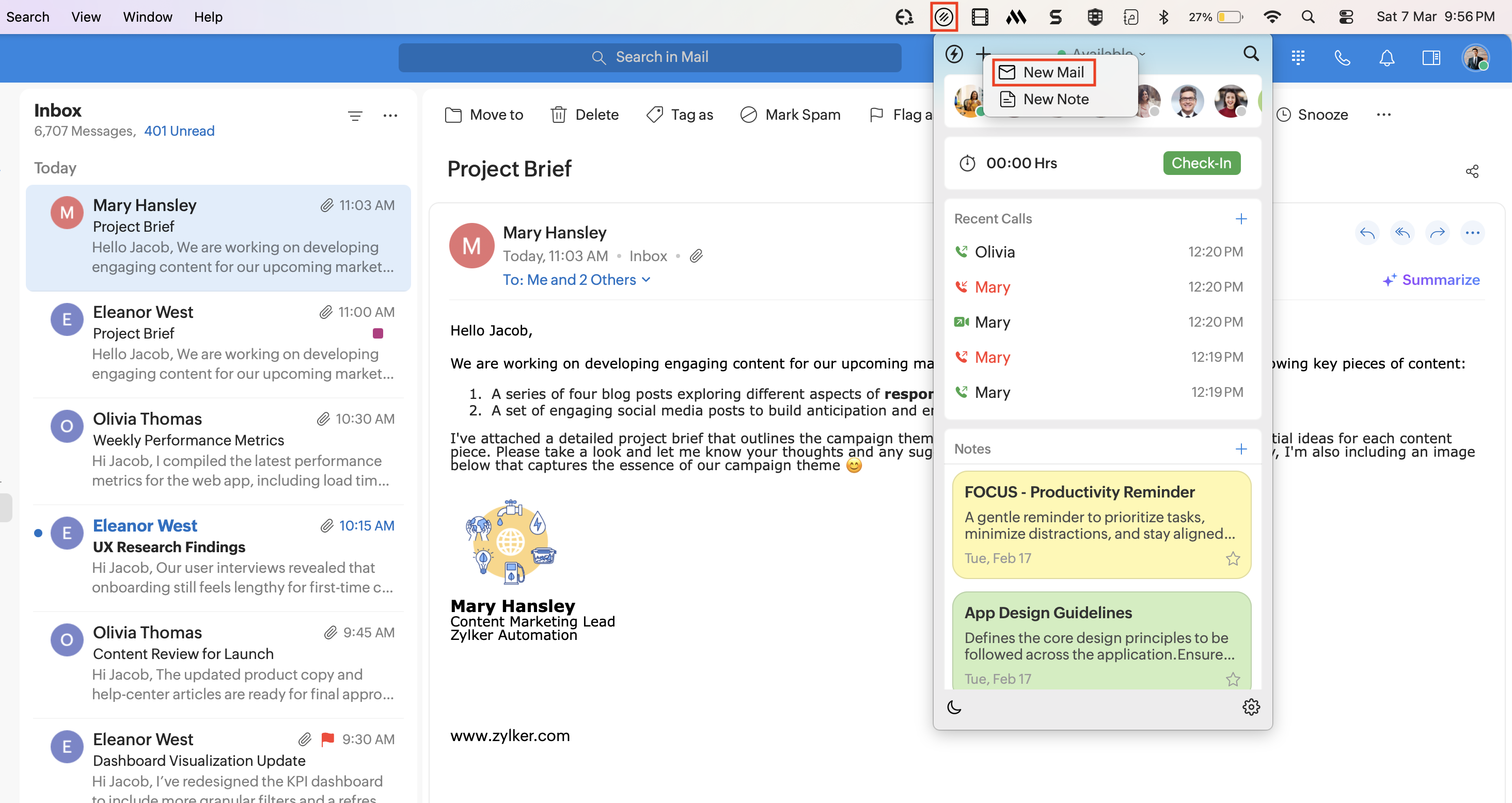 When the Attendance menu bar widget (Zoho People) is enabled, you can use its options to check in and check out, as well as view the working hour timer.