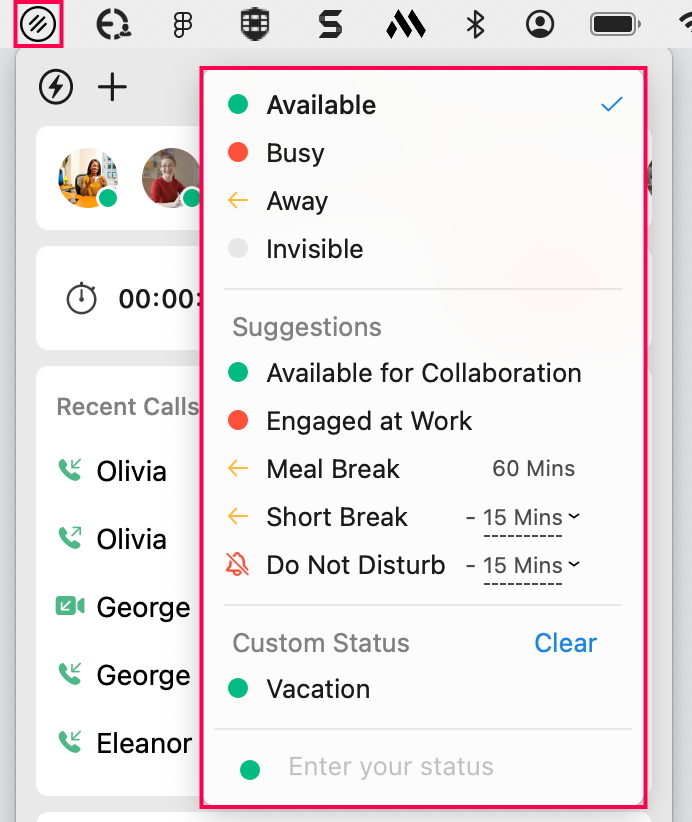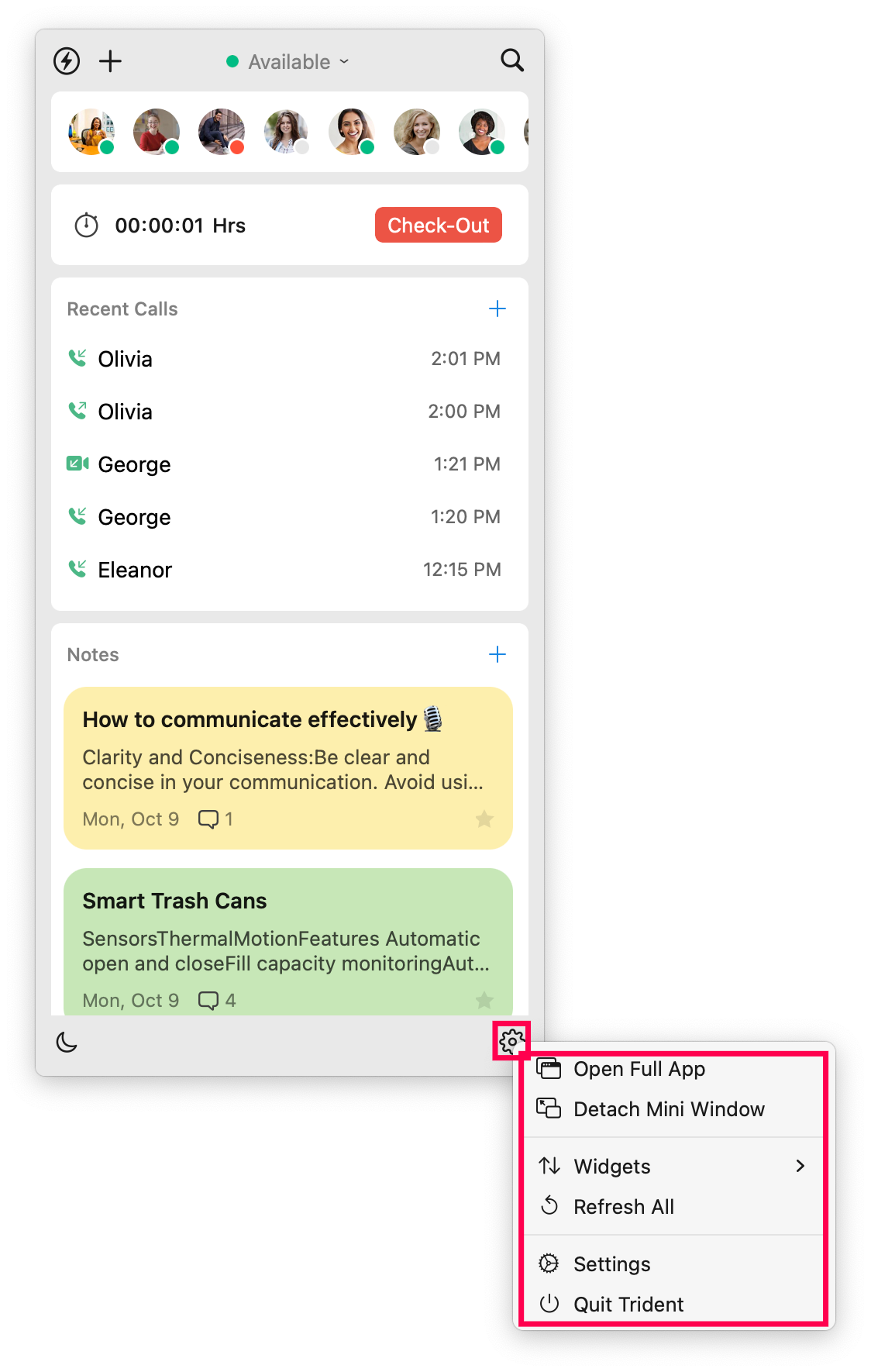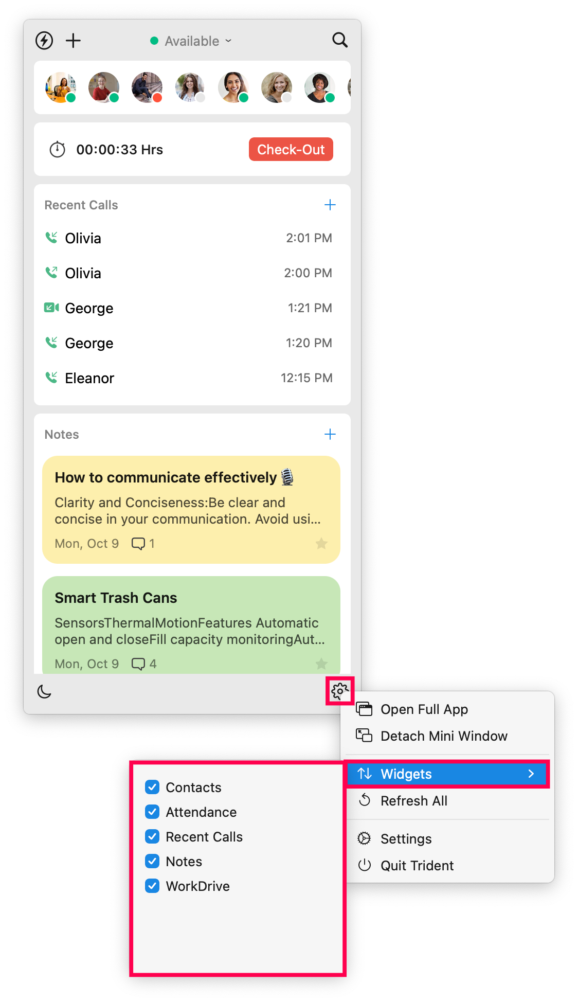 Trident's menu bar app for Cliq enables you to change your Cliq status, chat with frequent contacts, and make calls. It also displays the recent call history.