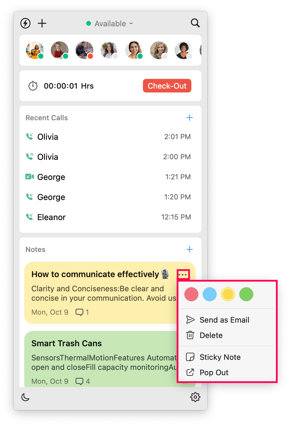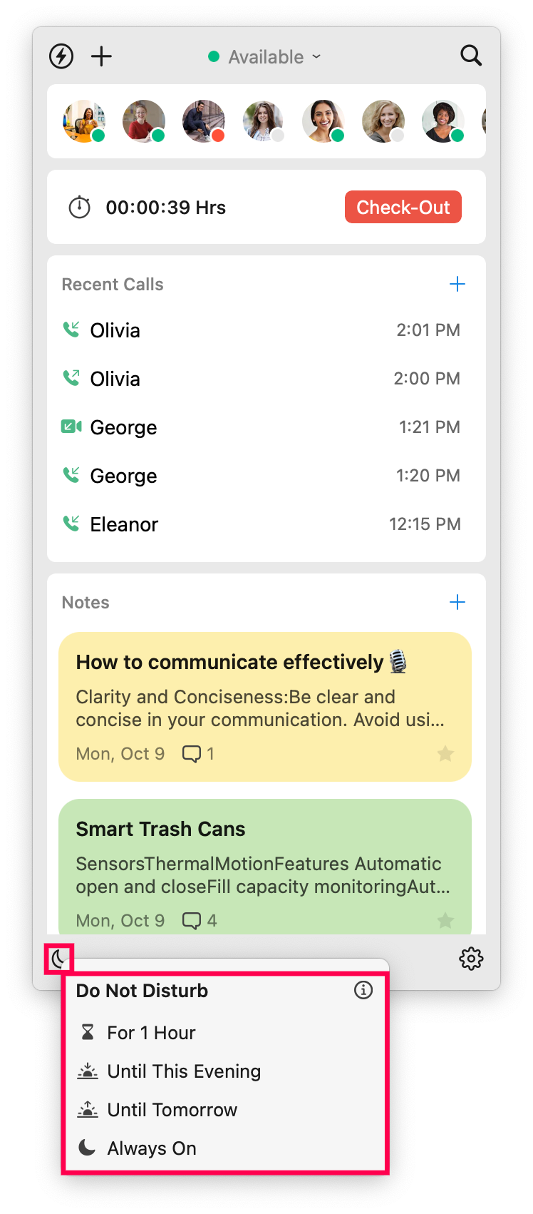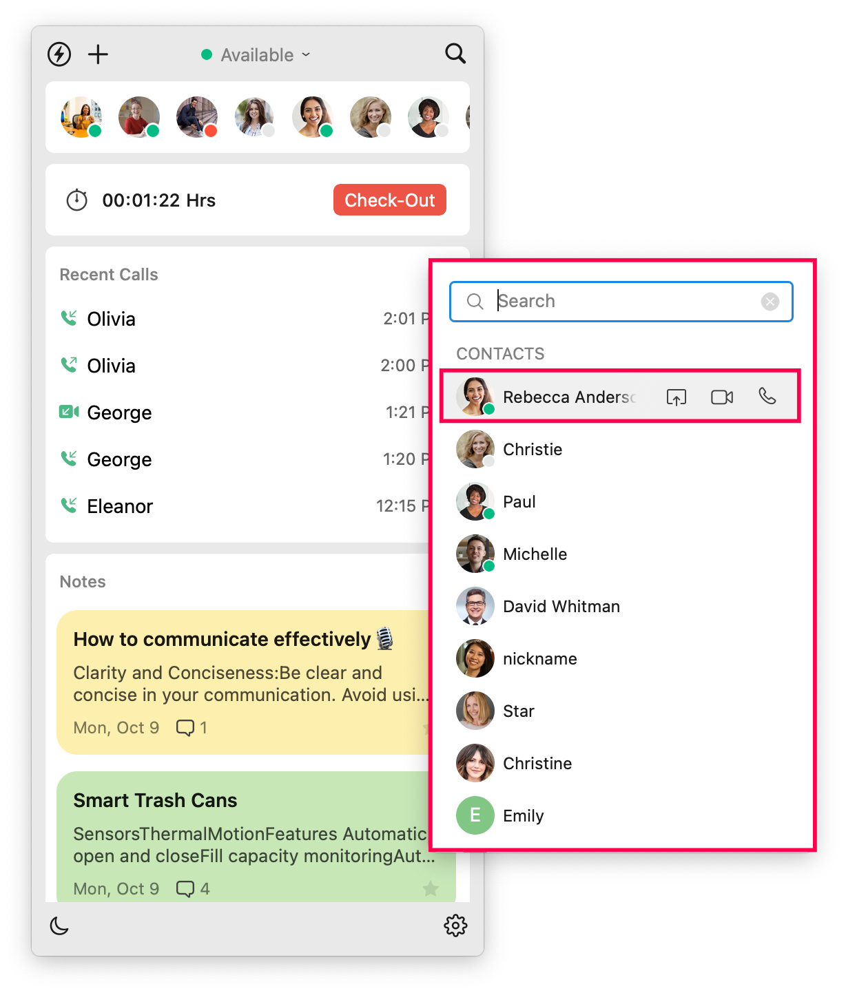 Trident's menu bar app for Cliq enables you to change your Cliq status, chat with frequent contacts, and make calls. It also displays the recent call history.