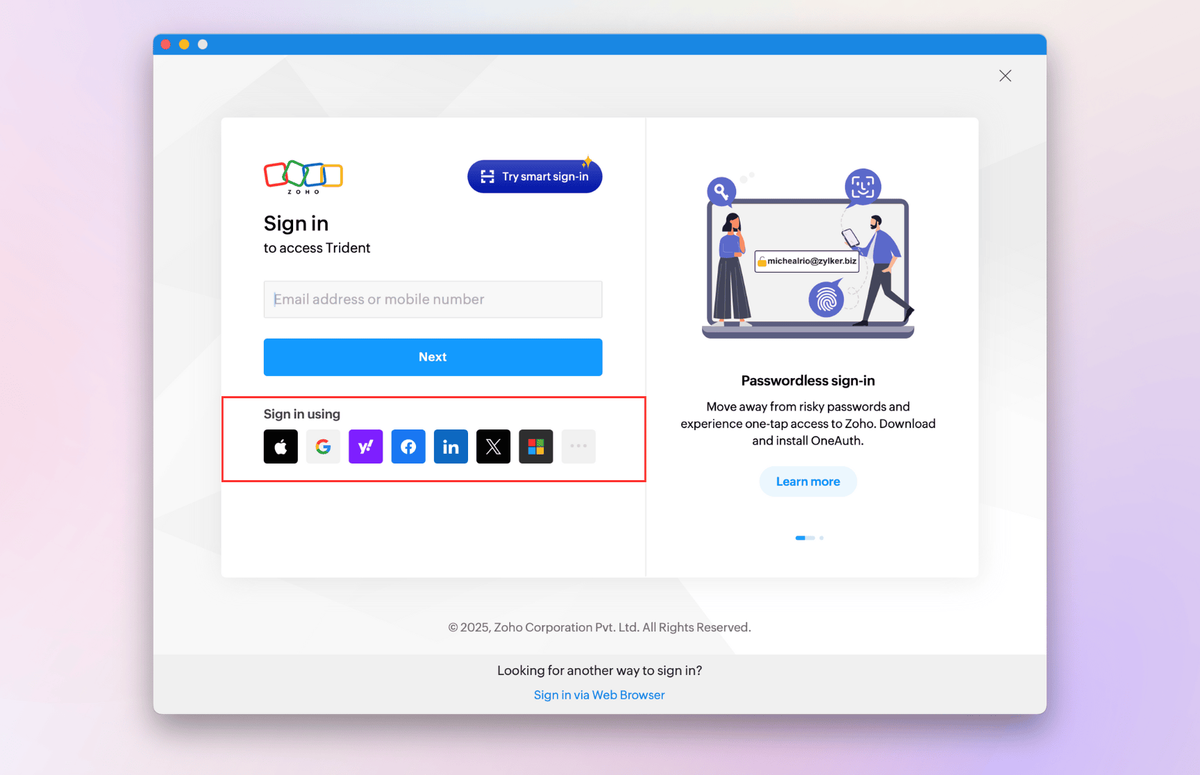Smart Sign-in is a secure and seamless way to sign in to your Zoho account by scanning a QR code using Zoho's Authenticator app, OneAuth. You do not need to type in your username or password manually.