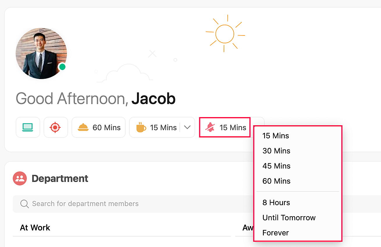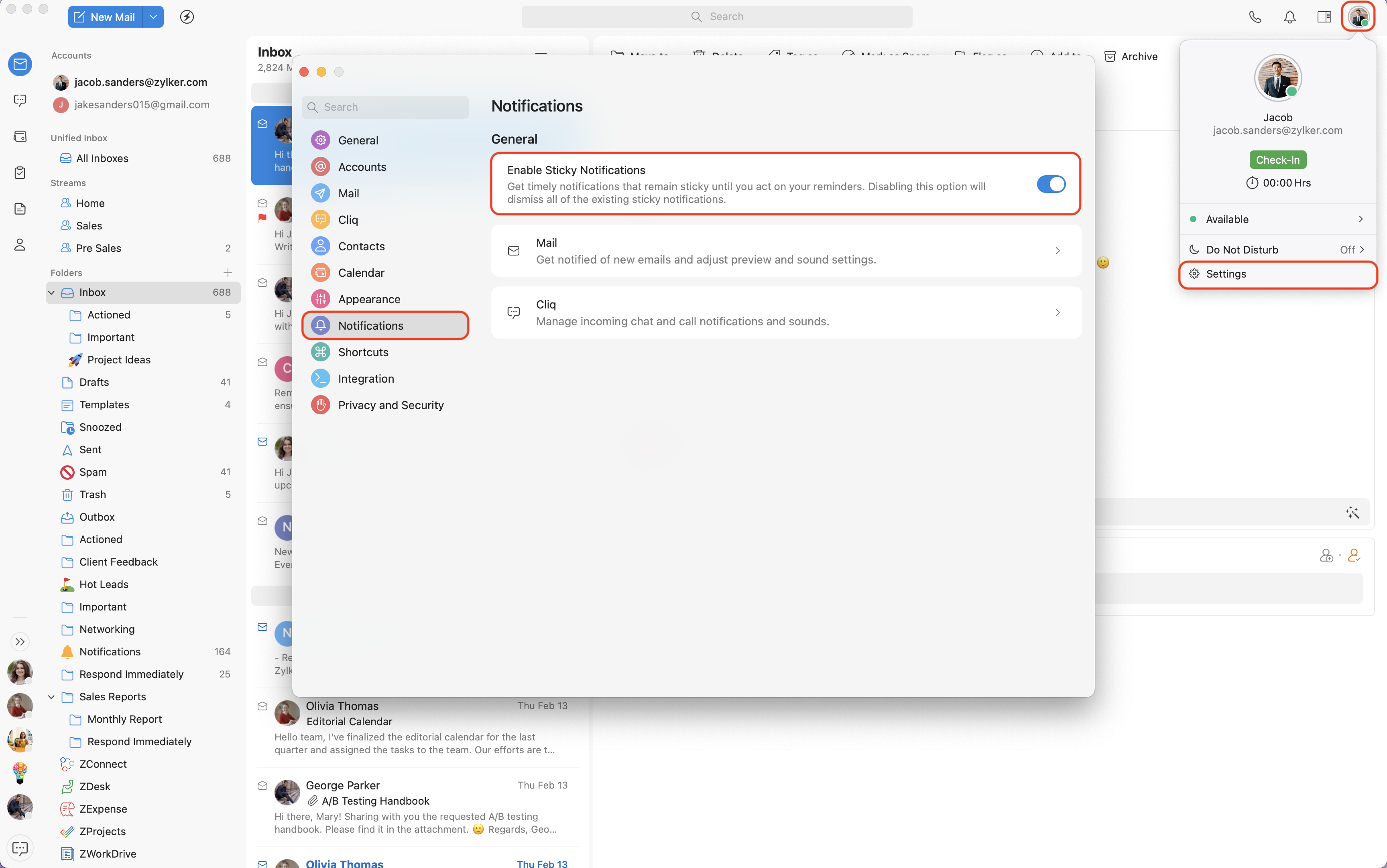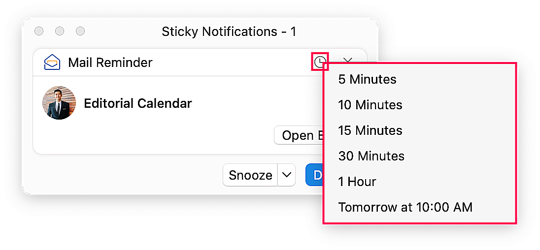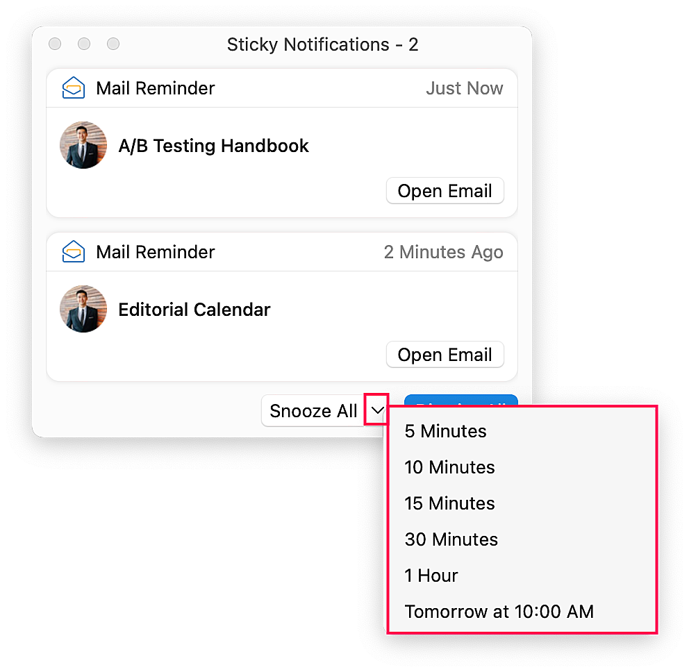 To snooze all of the sticky notifications, click open the Snooze All drop-down menu, and select the desired snooze duration.