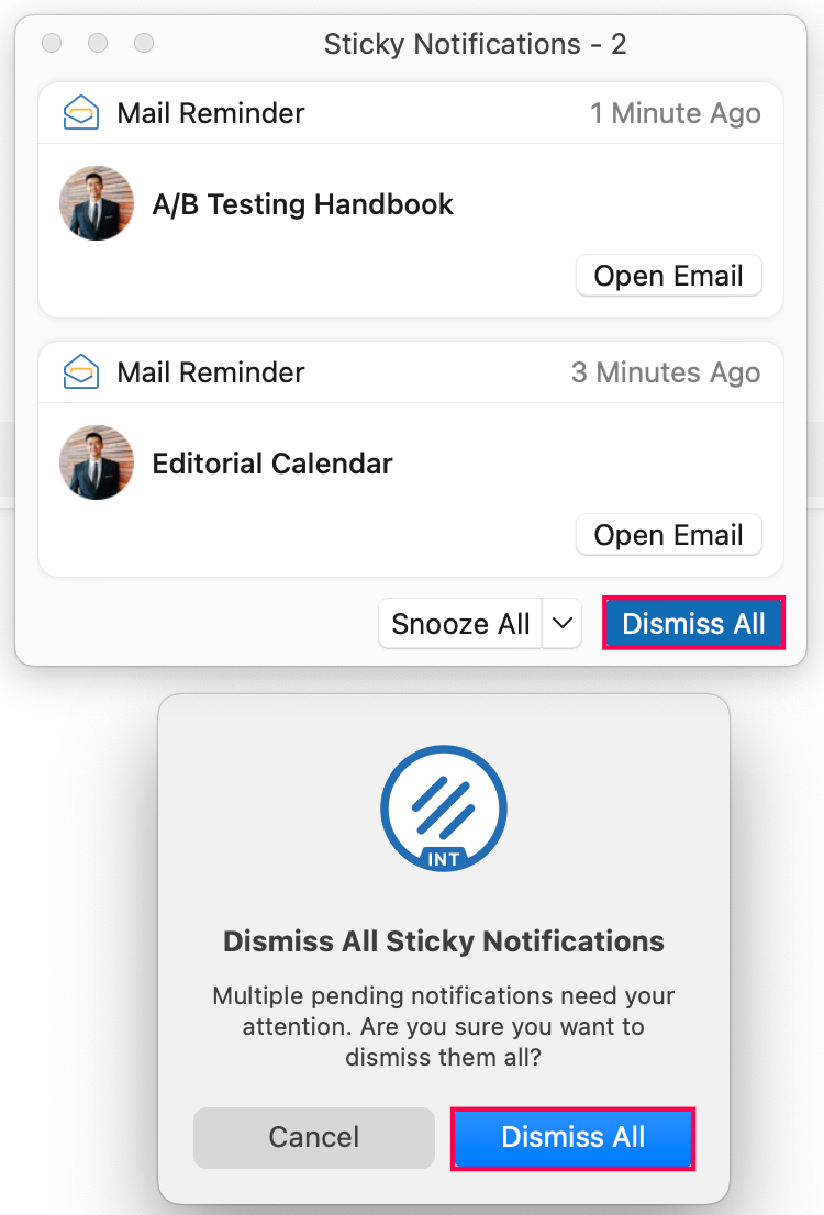 To dismiss all of the received Sticky Notifications, click Dismiss All, and select Dismiss All in the alert that appears.