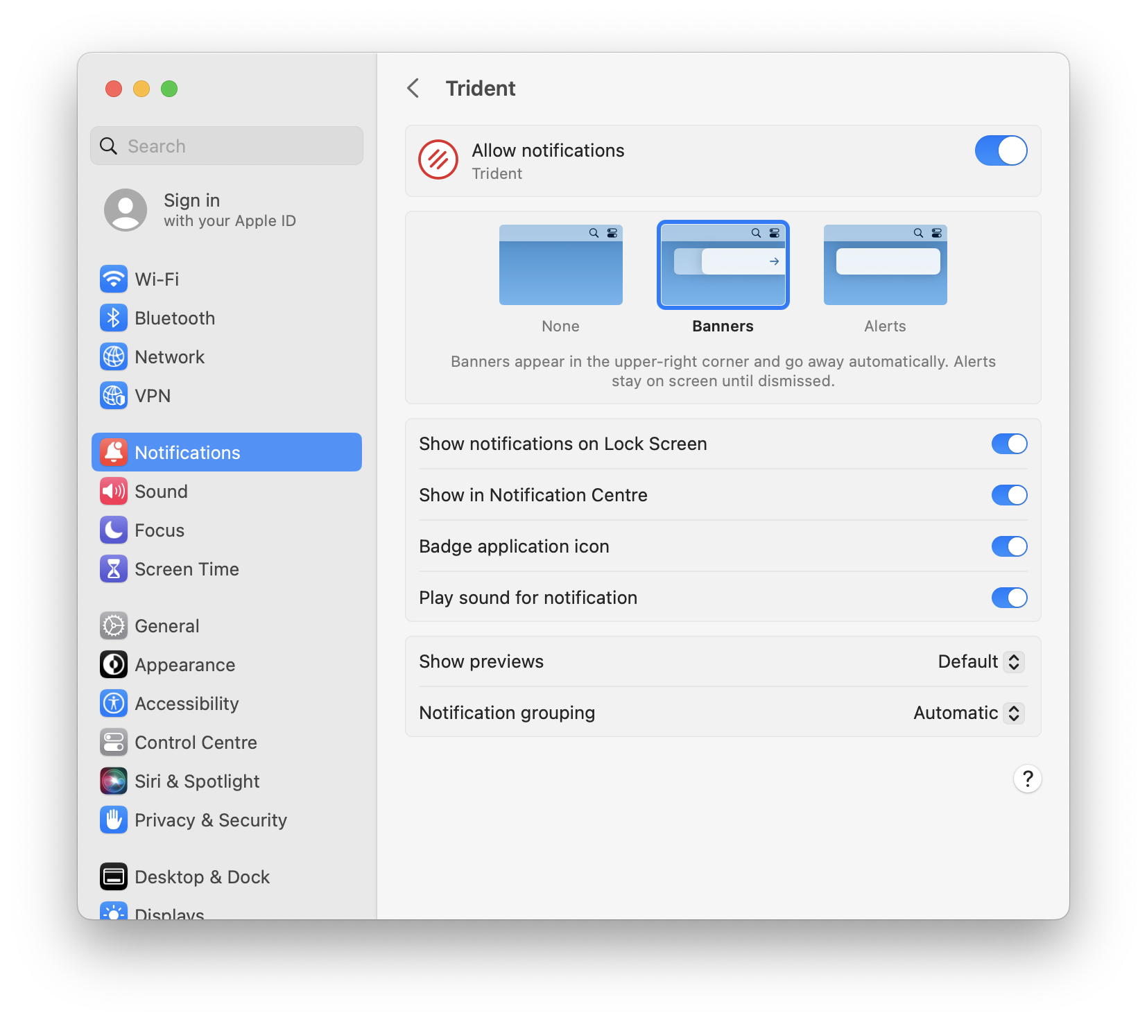 To adjust system notifications from the System Settings app, go to System Settings > Notifications >Trident.