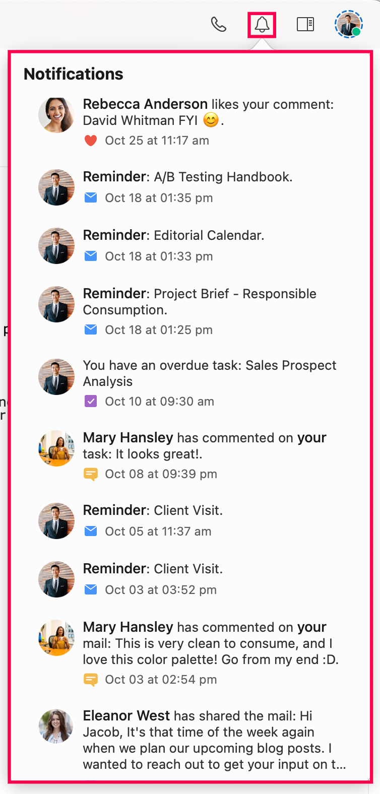 To view in-app notifications, click the Bell icon in the top-right corner of the app. You can click it open to take contextual actions.