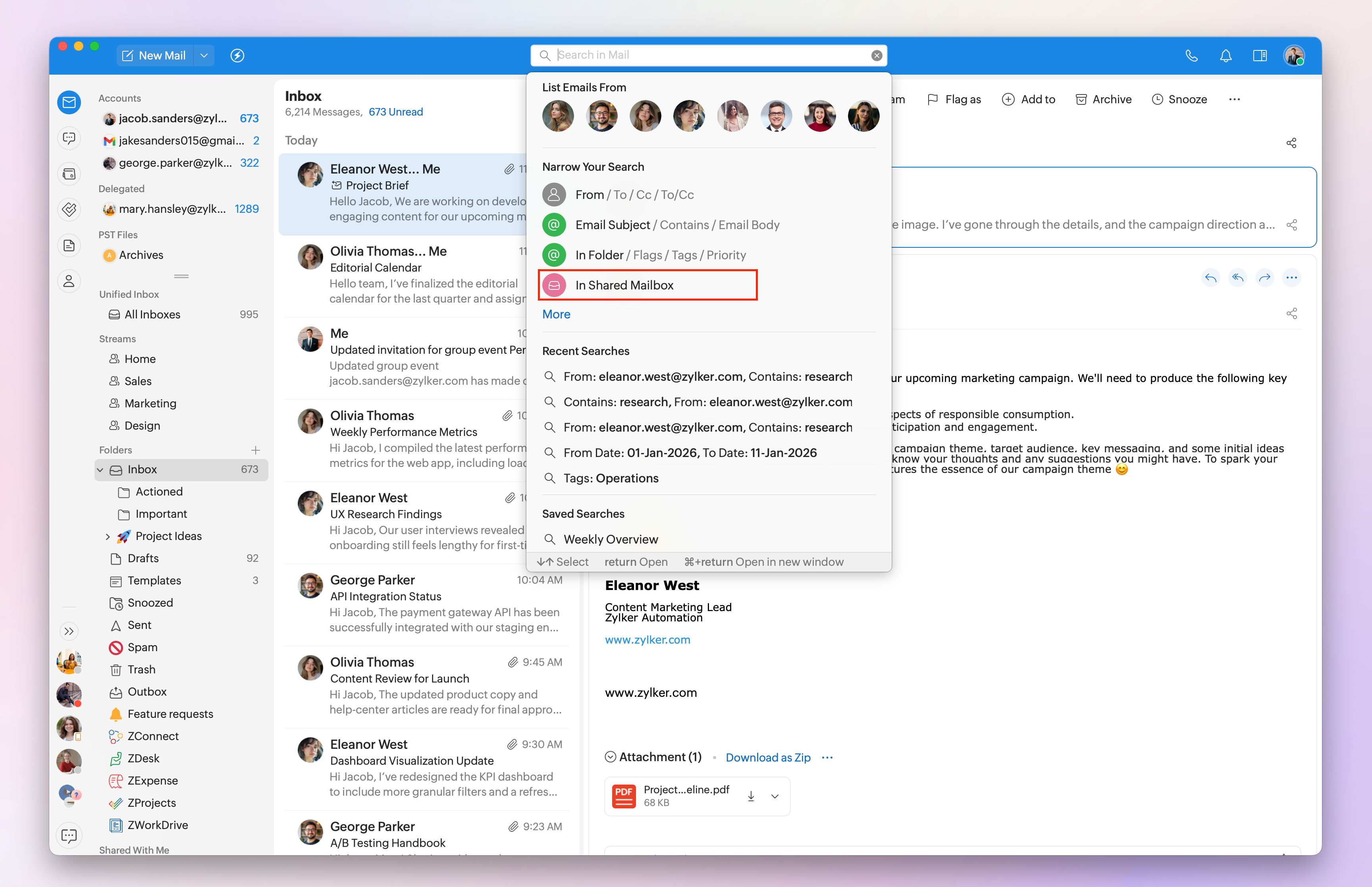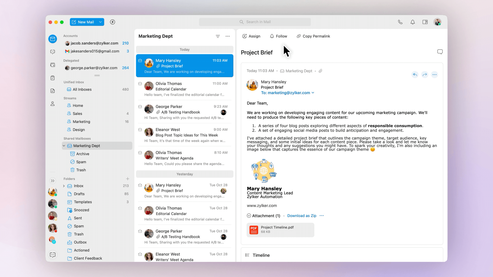 Filter emails based on whether they are unread, have attachments, are tagged, assigned, or assigned to a specific person, or unassigned.