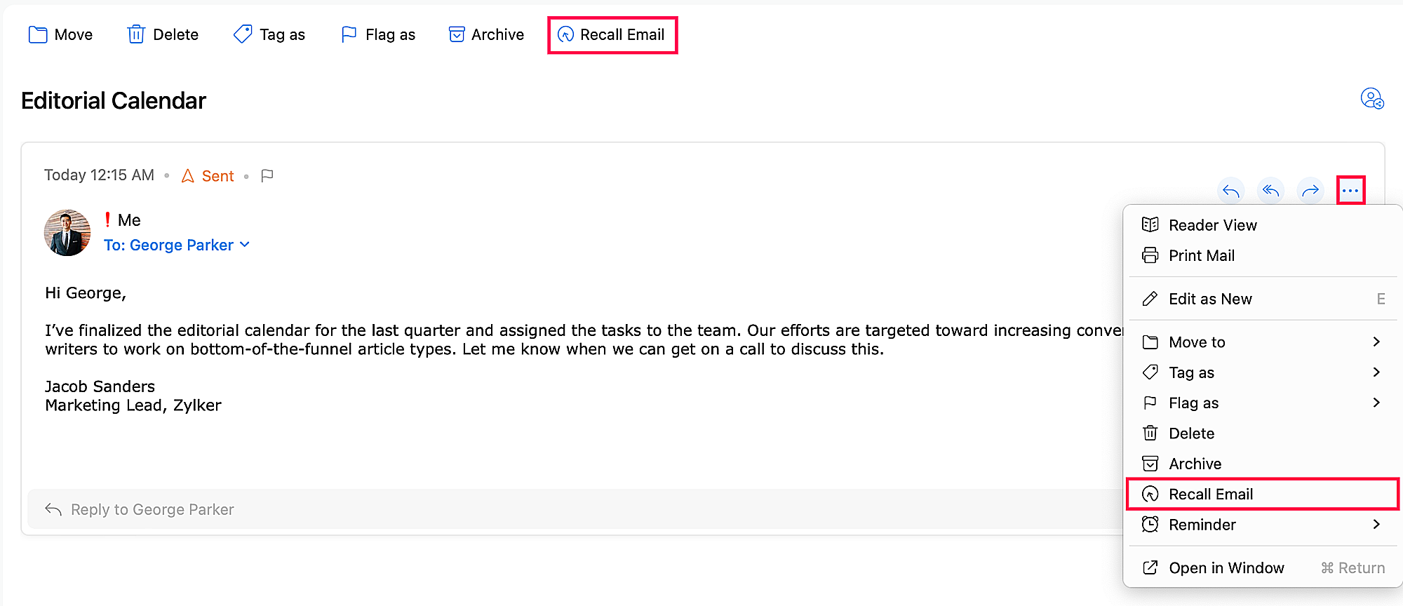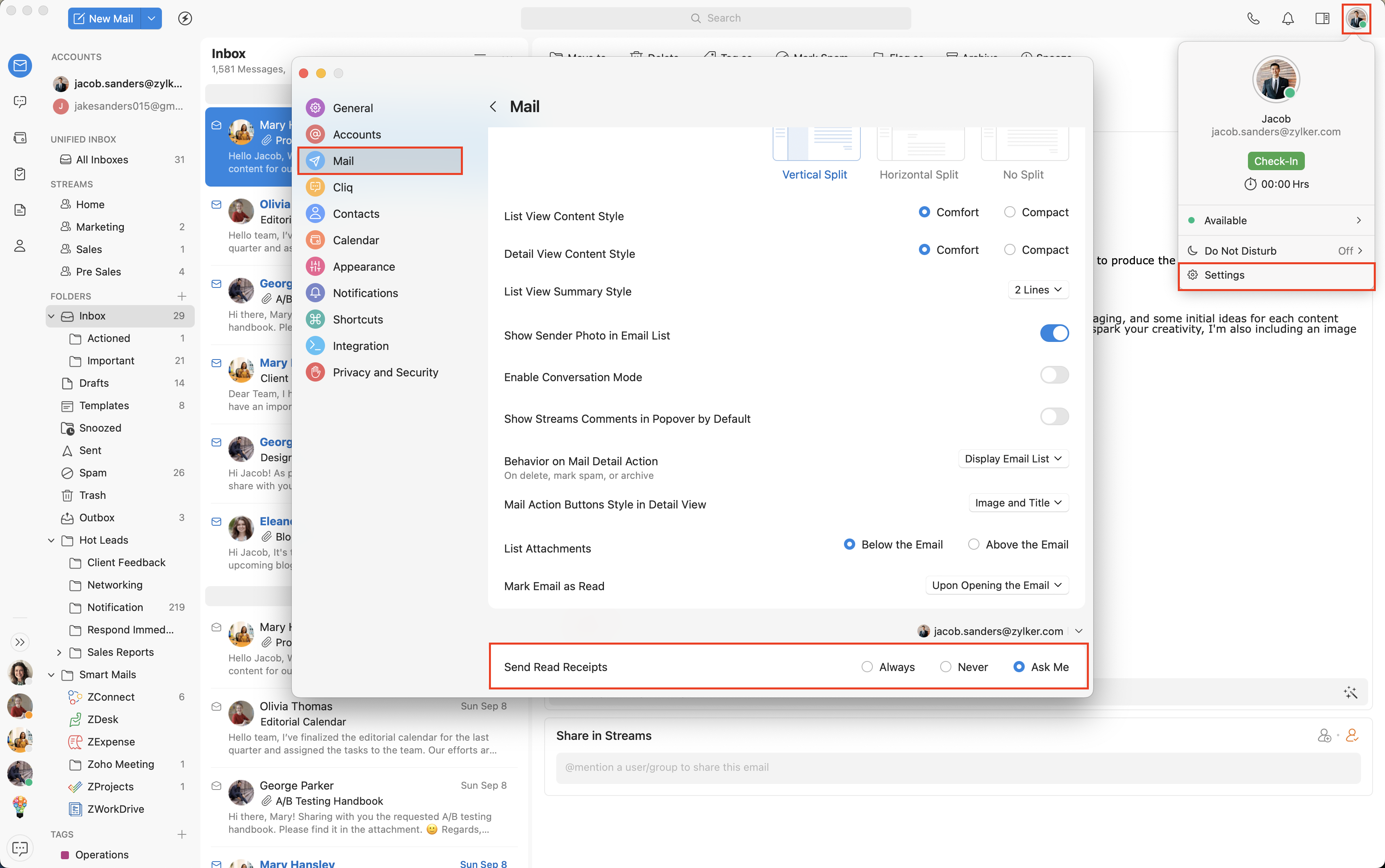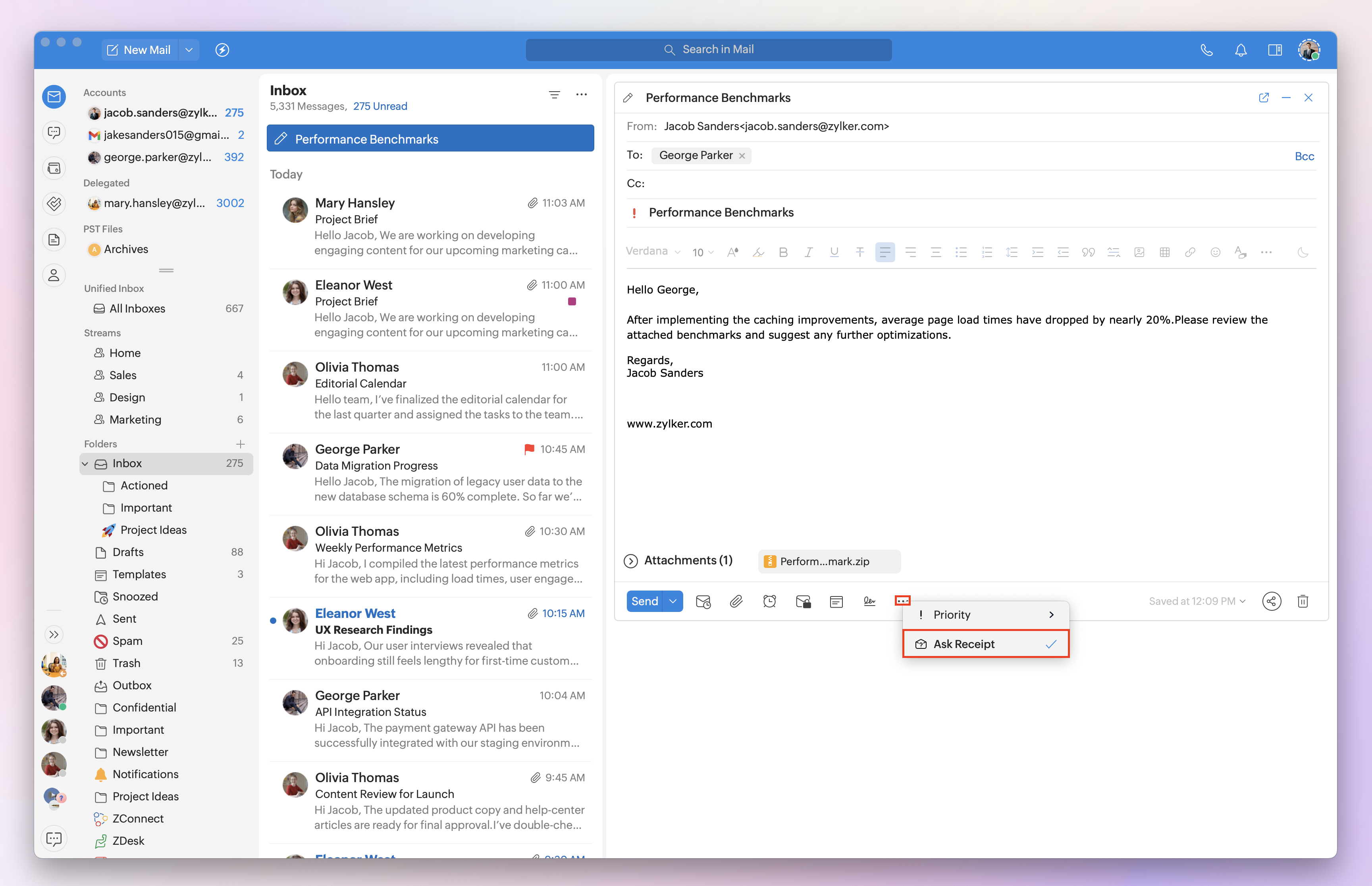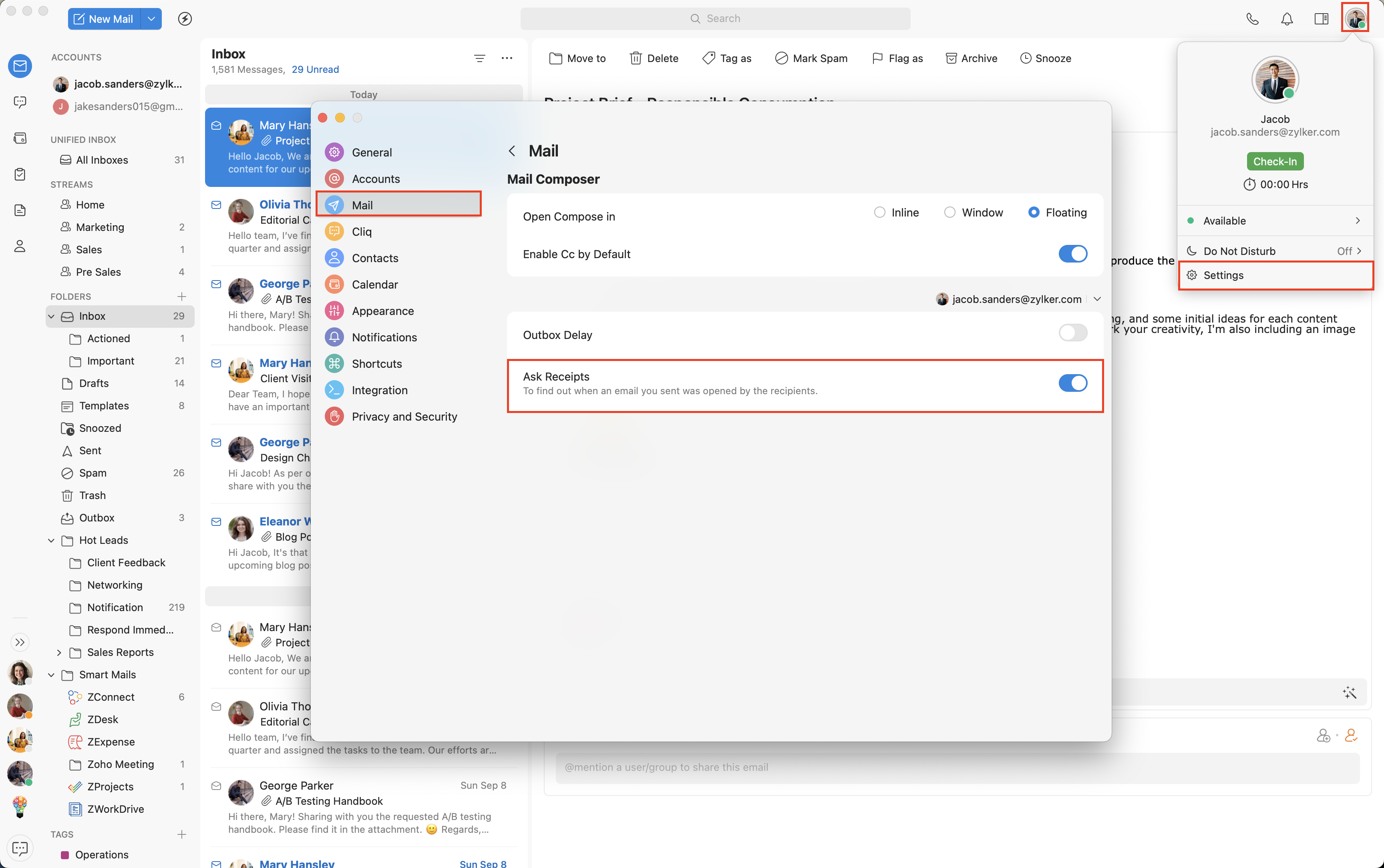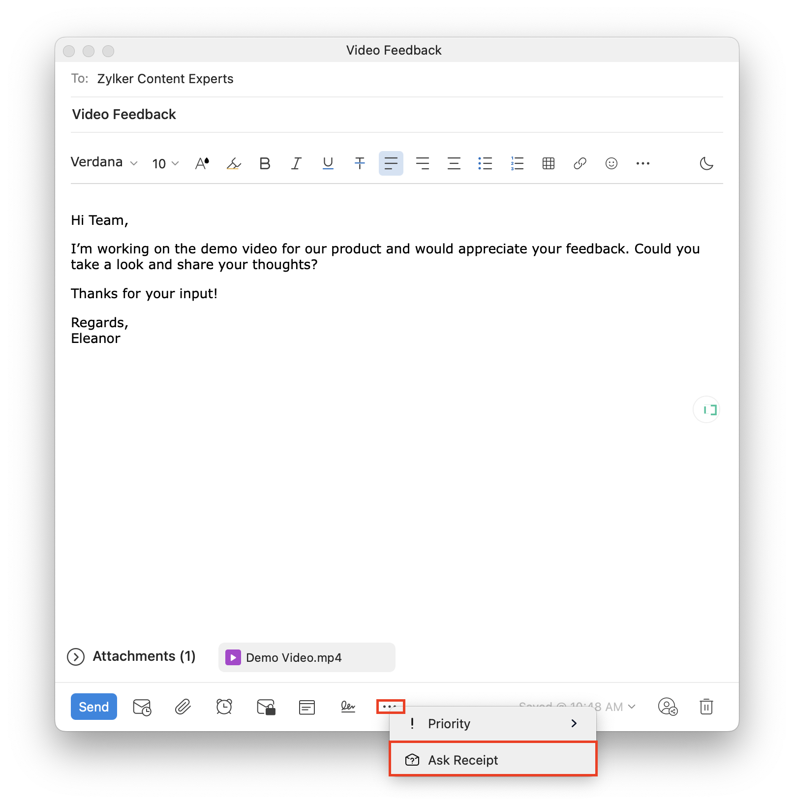 You can ask for a read receipt while sending emails that require the recipient to acknowledge that they have read the email. You can do this by clicking the More Options icon in the Mail Composer and selecting Ask Receipt.