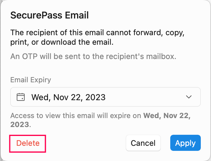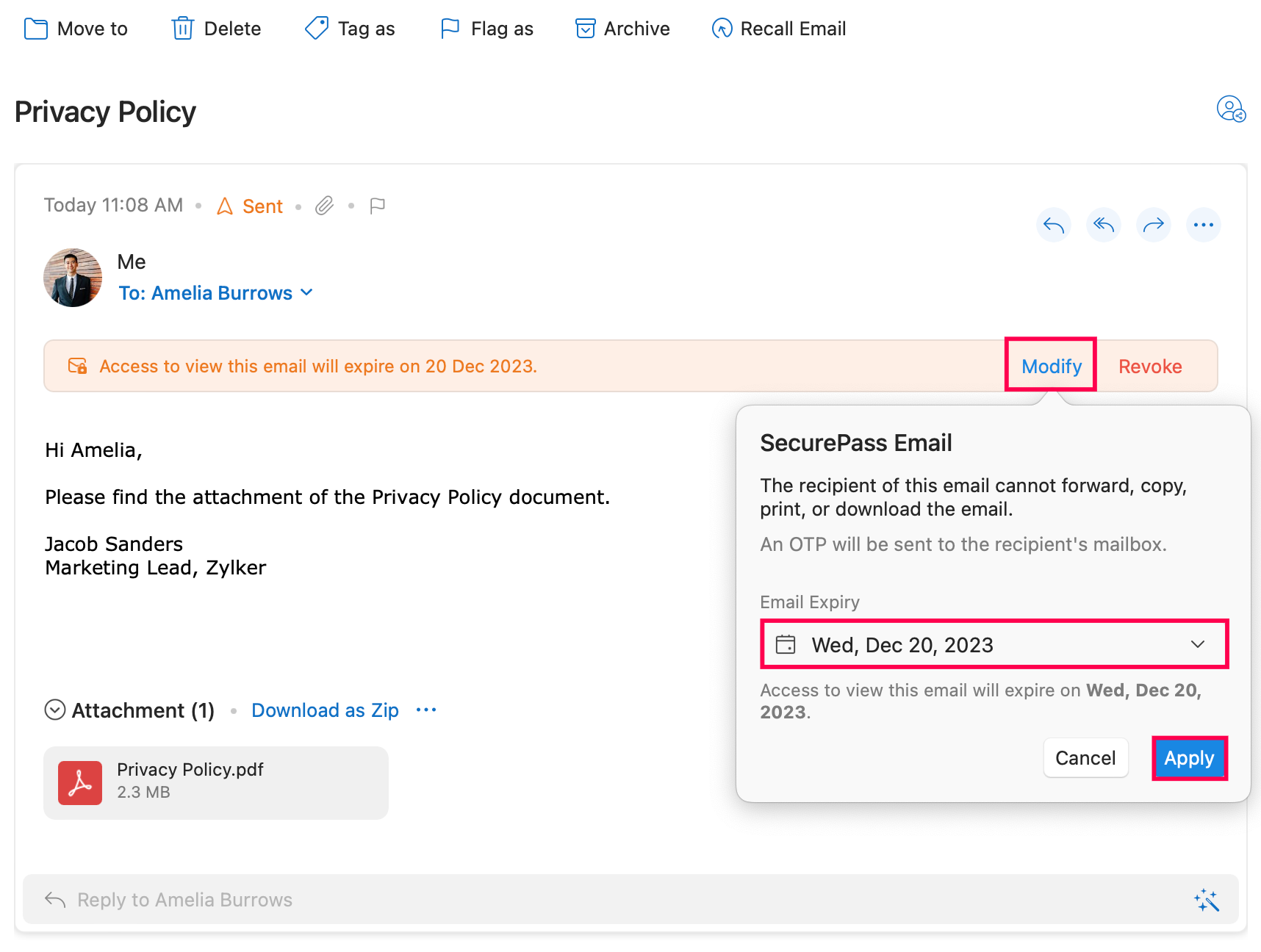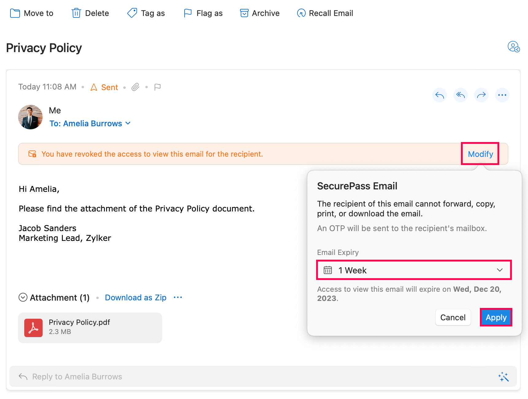 You can modify the expiration date of a sent SecurePass email or revoke access to it.