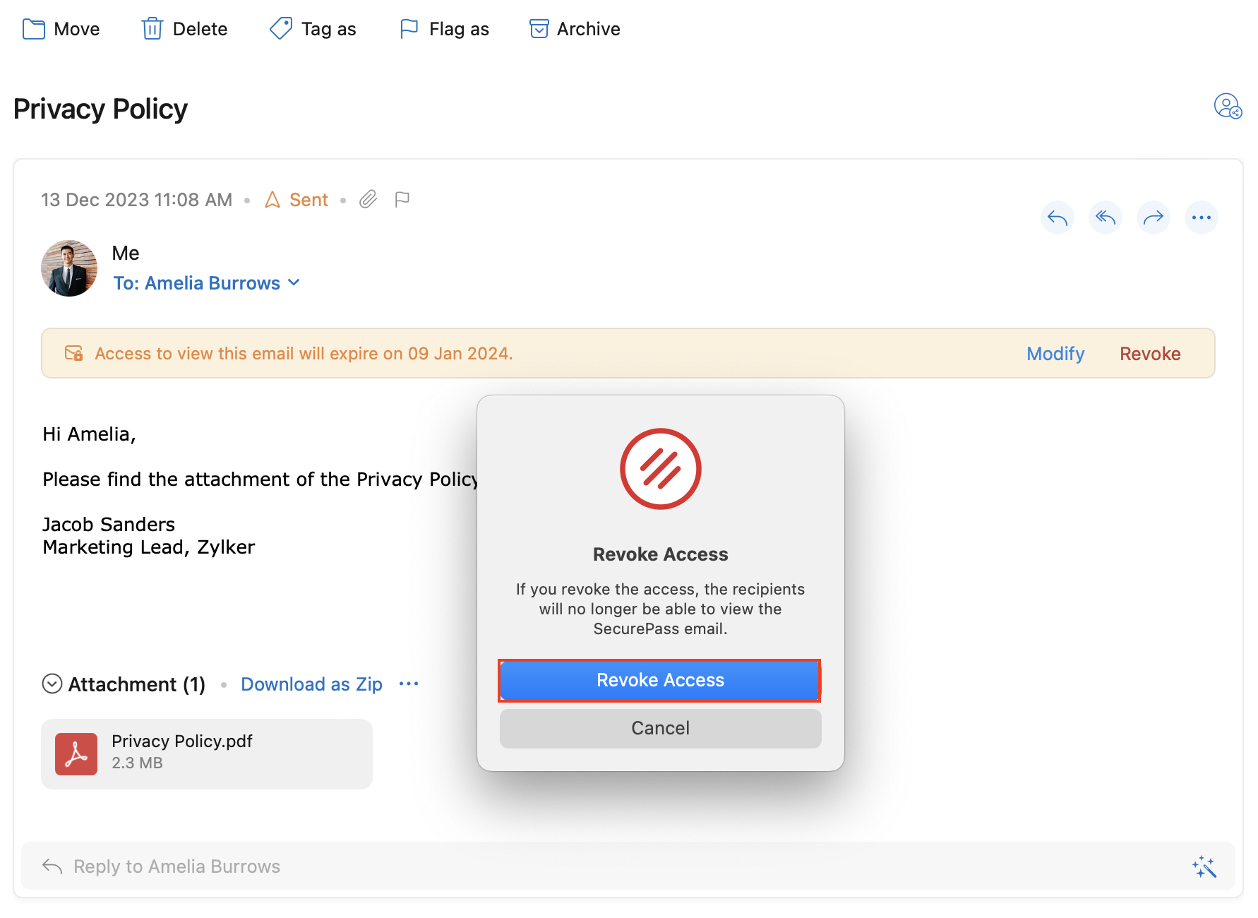 Note: Upon revoking access, recipients will no longer be able to view this secure email. The recipients will get the "Access Revoked" alert when they try to access the link.