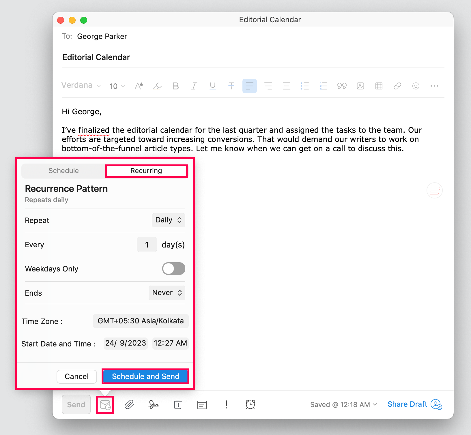 You can schedule recurring emails that are regularly sent at a pre-defined interval. To do so:
