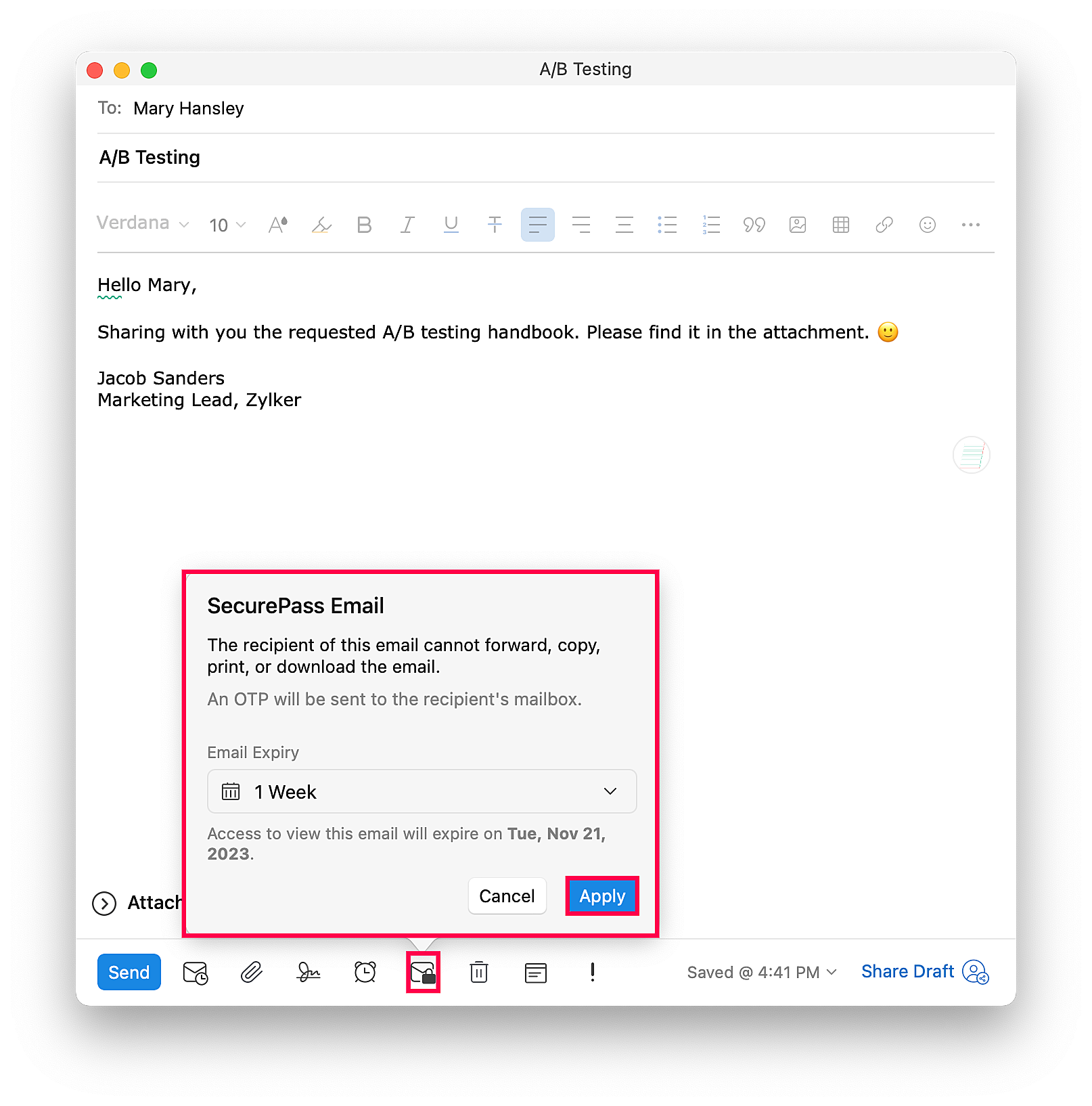You can secure your email with the SecurePass feature. This will ensure that the recipient of this email cannot forward, copy, print, or download the email.