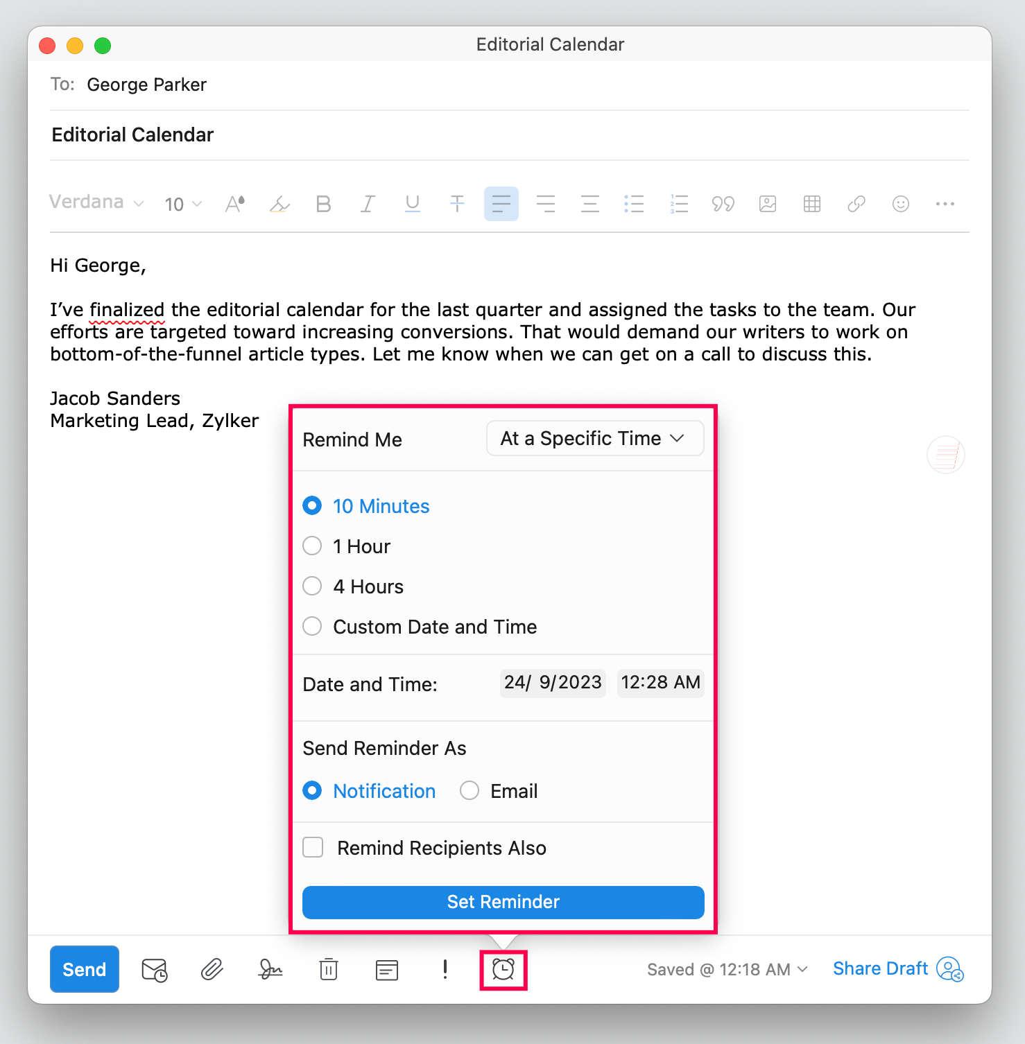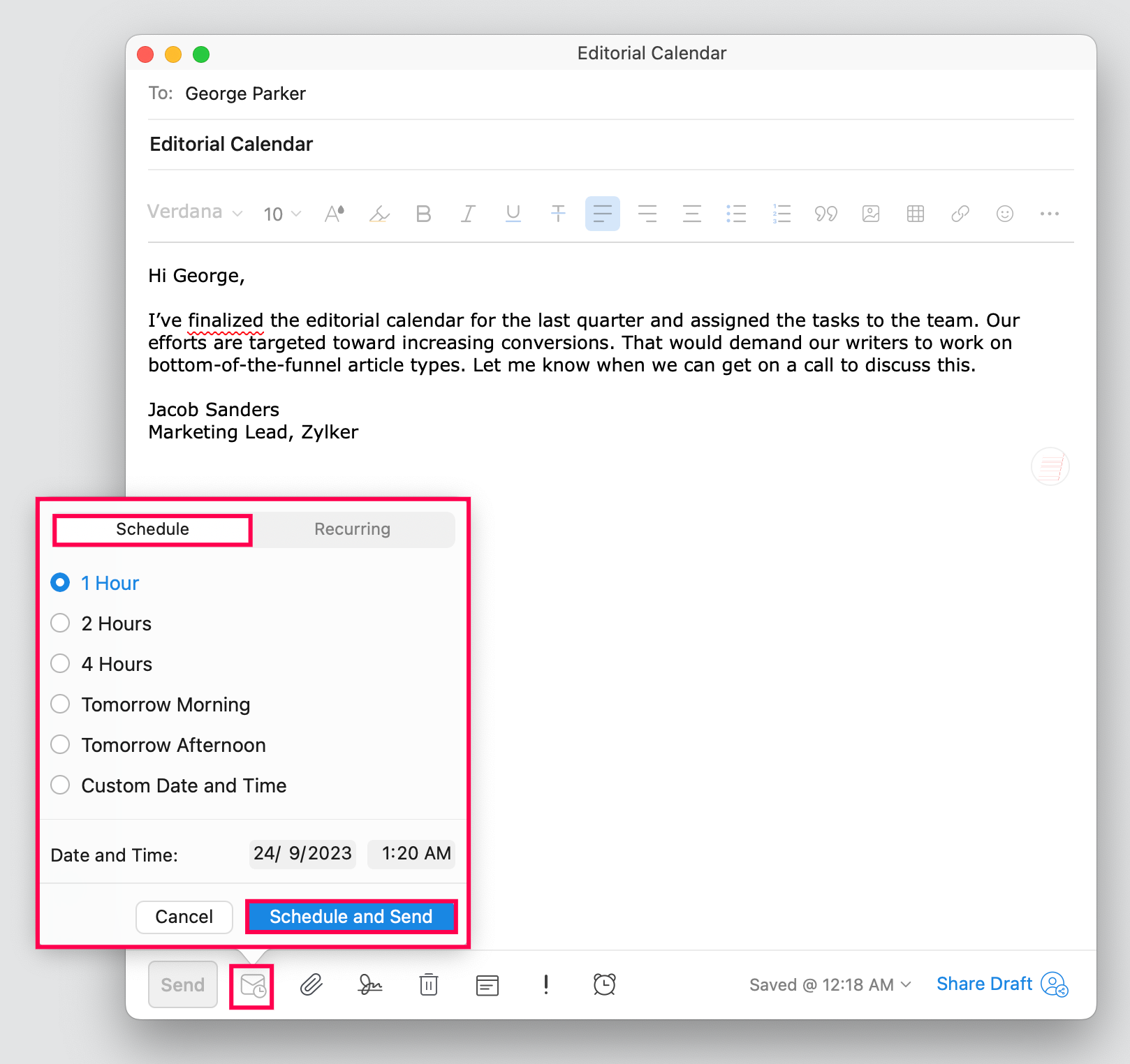 The Send Later option enables you to schedule your email to be sent at a later time. To do so: