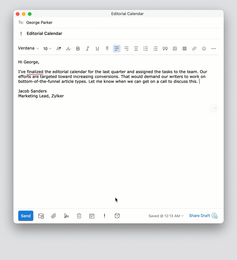 You can create multiple email signatures and customize them according to your email address or email alias. In Trident, the default signature will appear in the editor whenever the Mail Composer is invoked. To switch between other signatures: