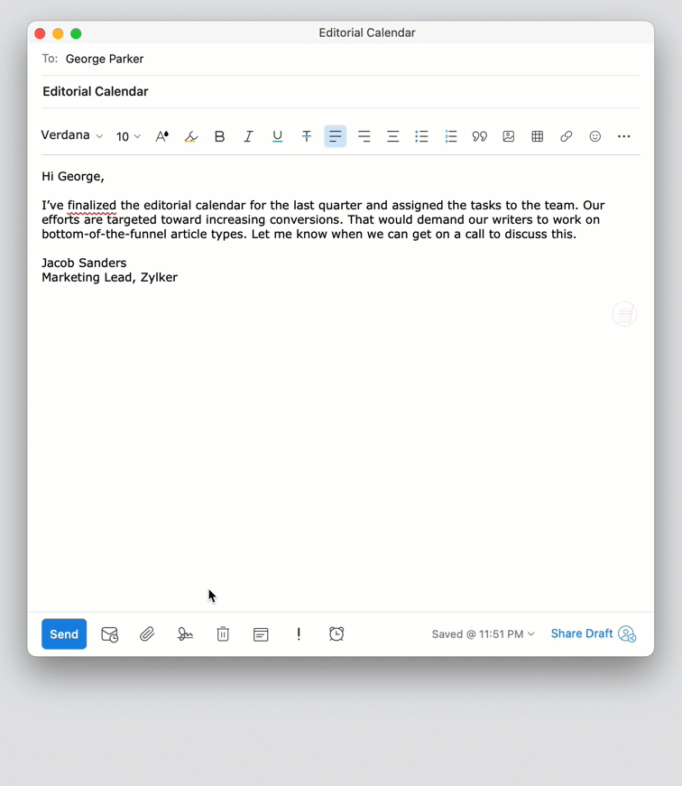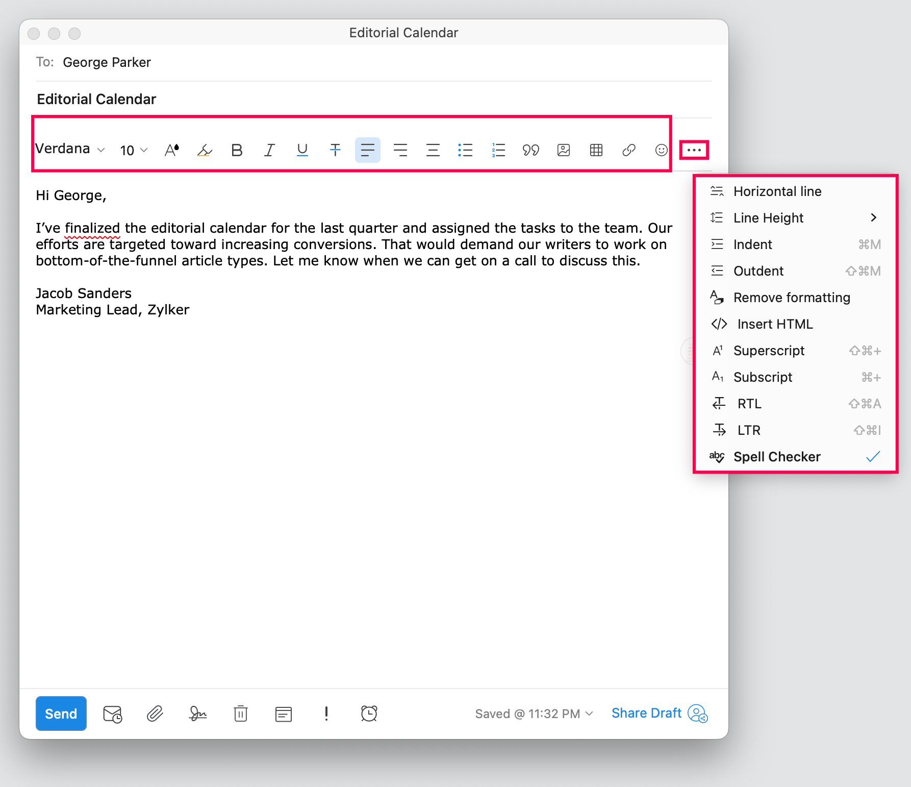 The Mail Composer has a What You See Is What You Get editor to customize the email body. The in-built Spell-Checker helps verify outgoing emails for correct spelling and grammar. You can enable it by checking the Spell Checker option in the rich text editor.