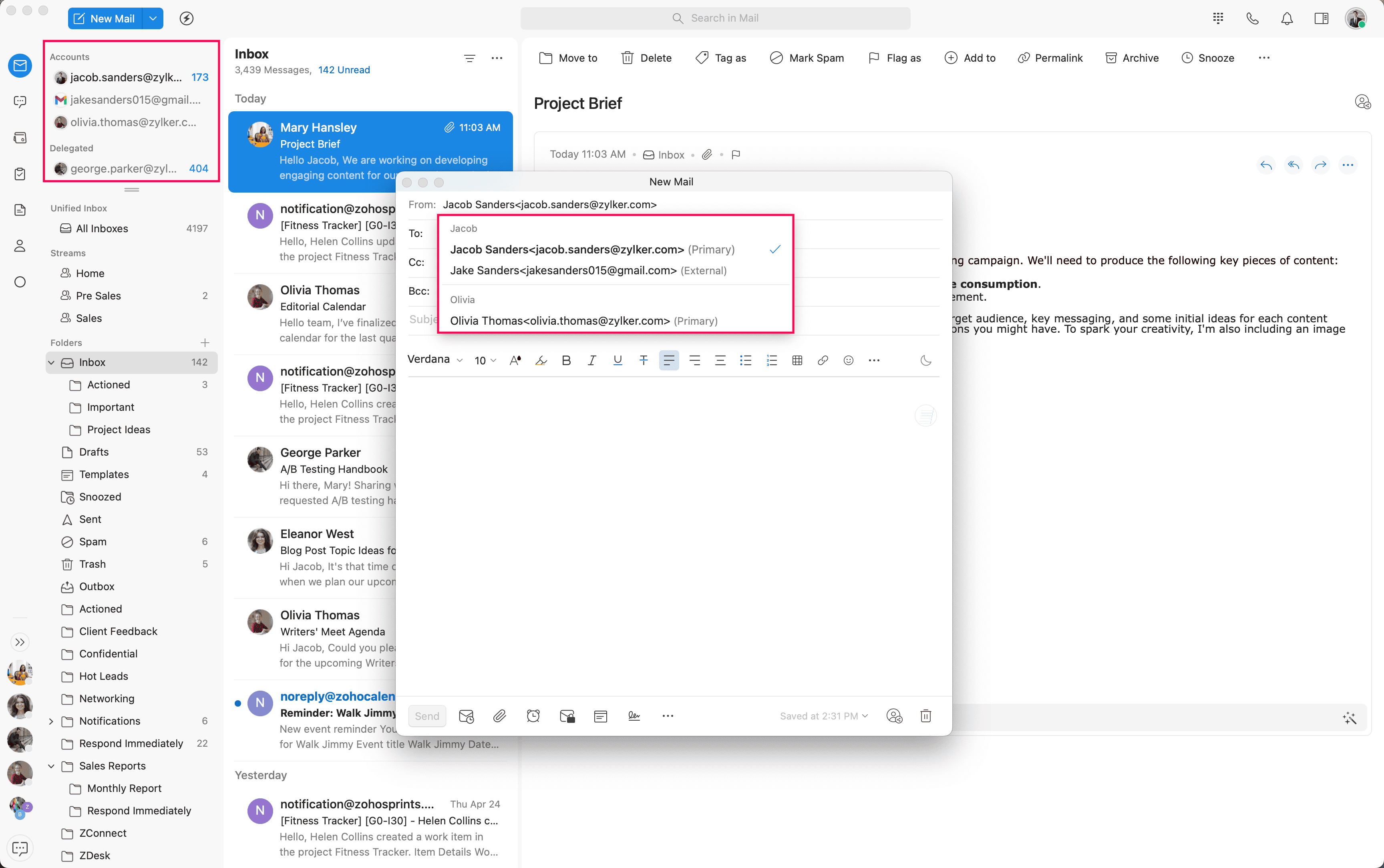 By default, the selected email account in the folder pane will be listed in the “From” field of the Mail Composer.
