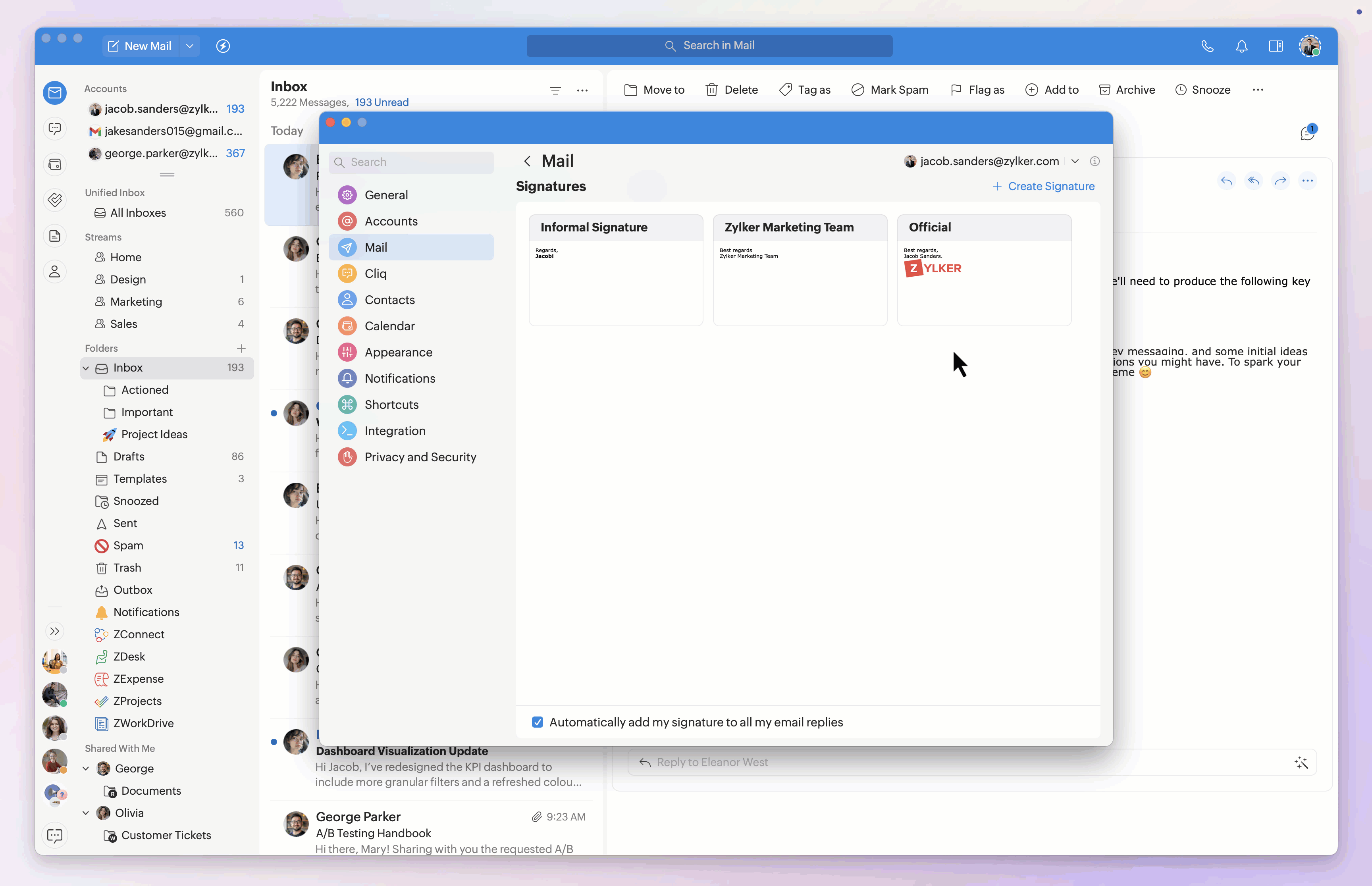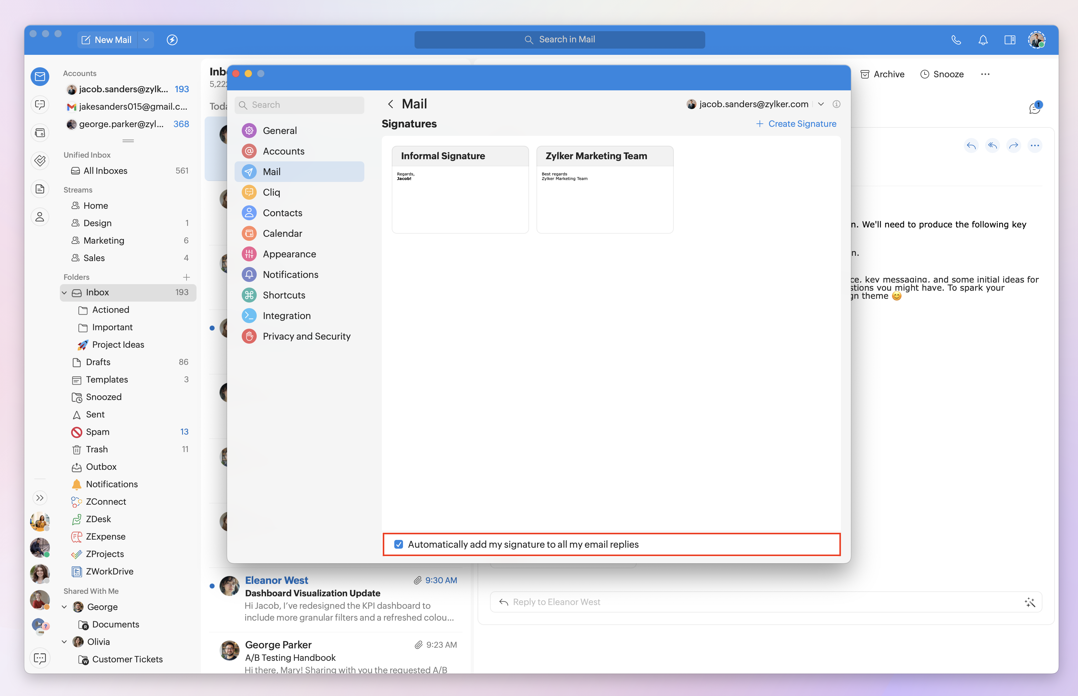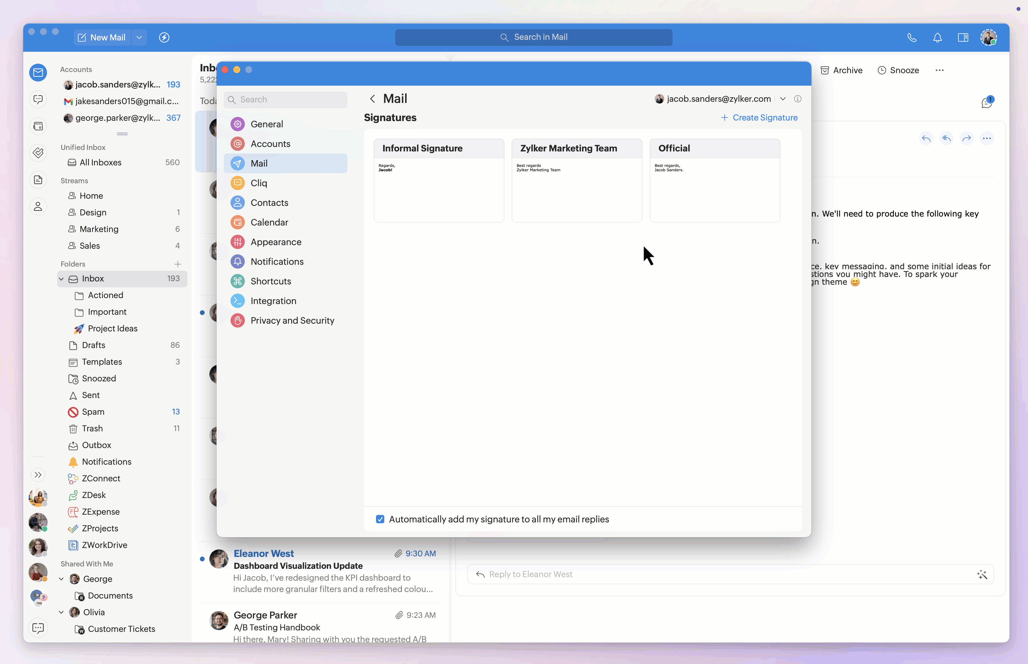Note: Check the Automatically add my signature to all my email replies option if you want all your email replies to be signed. In the Create Signature pop-up, enter the signature name and use the rich text editor to create your signature.