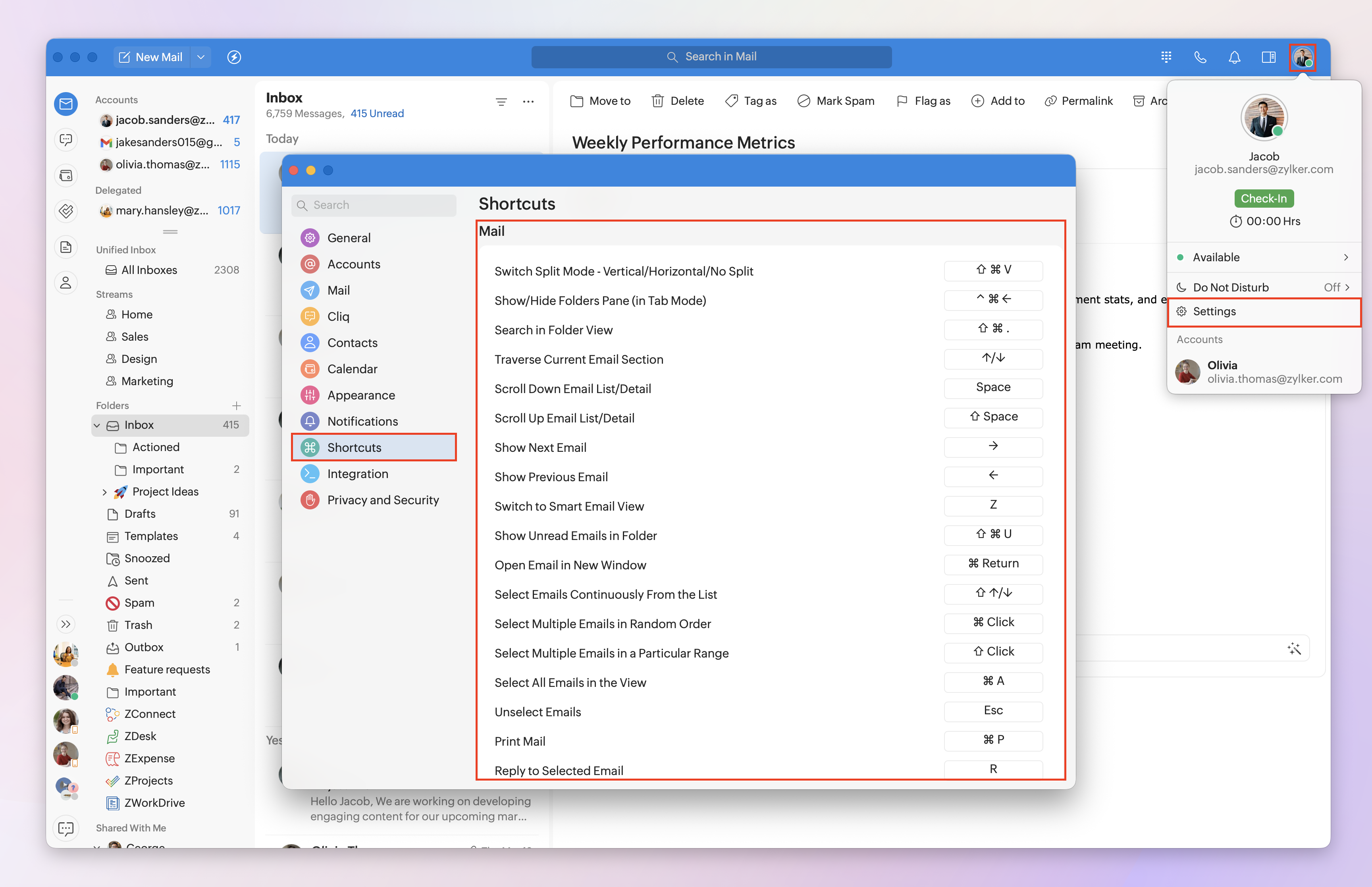 - In the Mail and Compose sections, you'll find the shortcuts mentioned below.