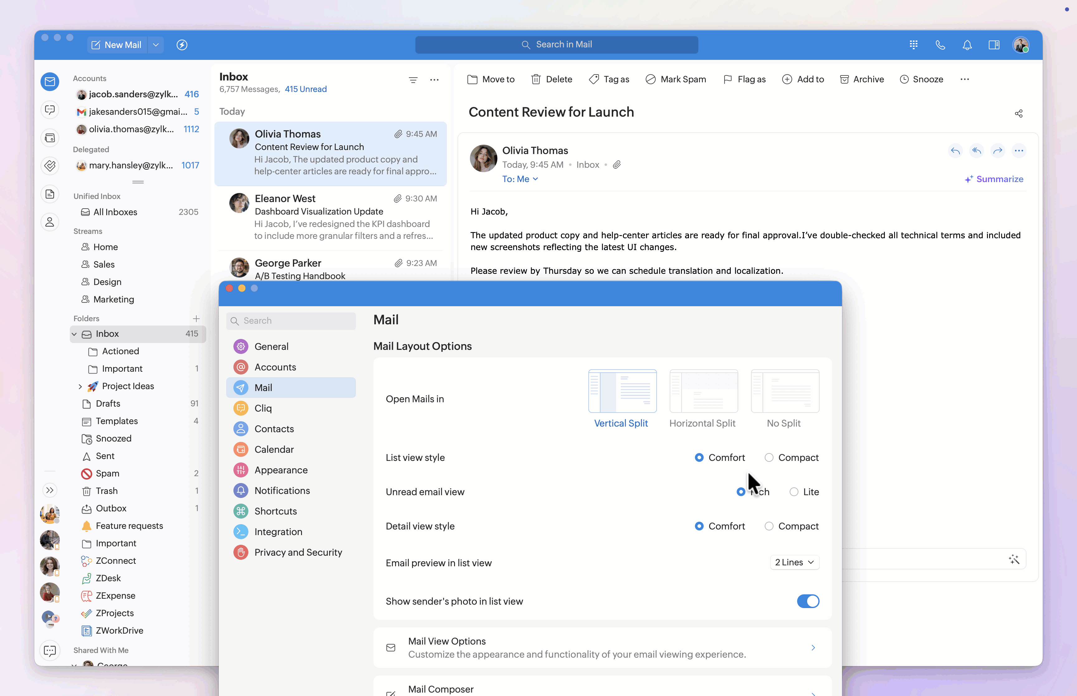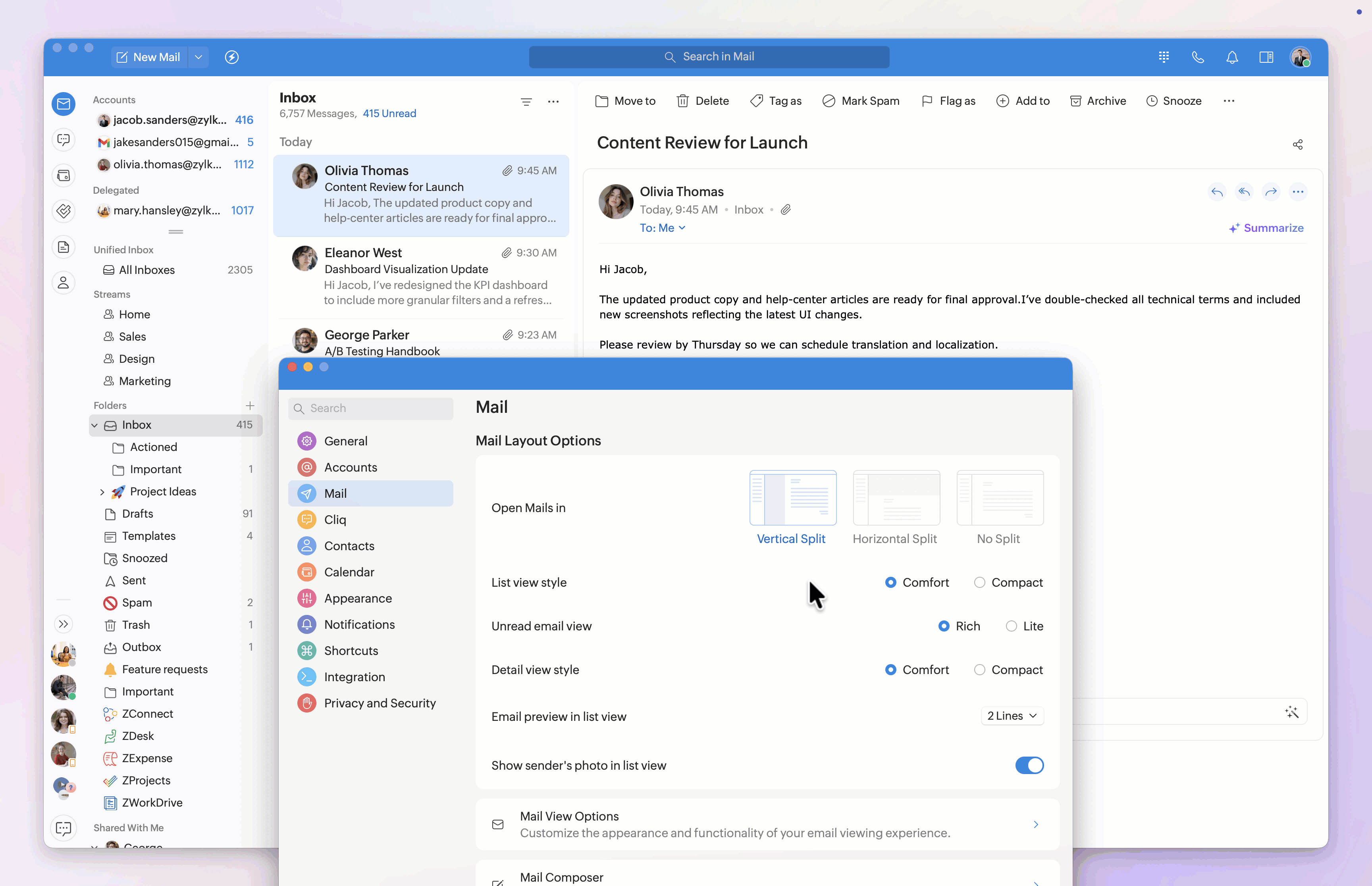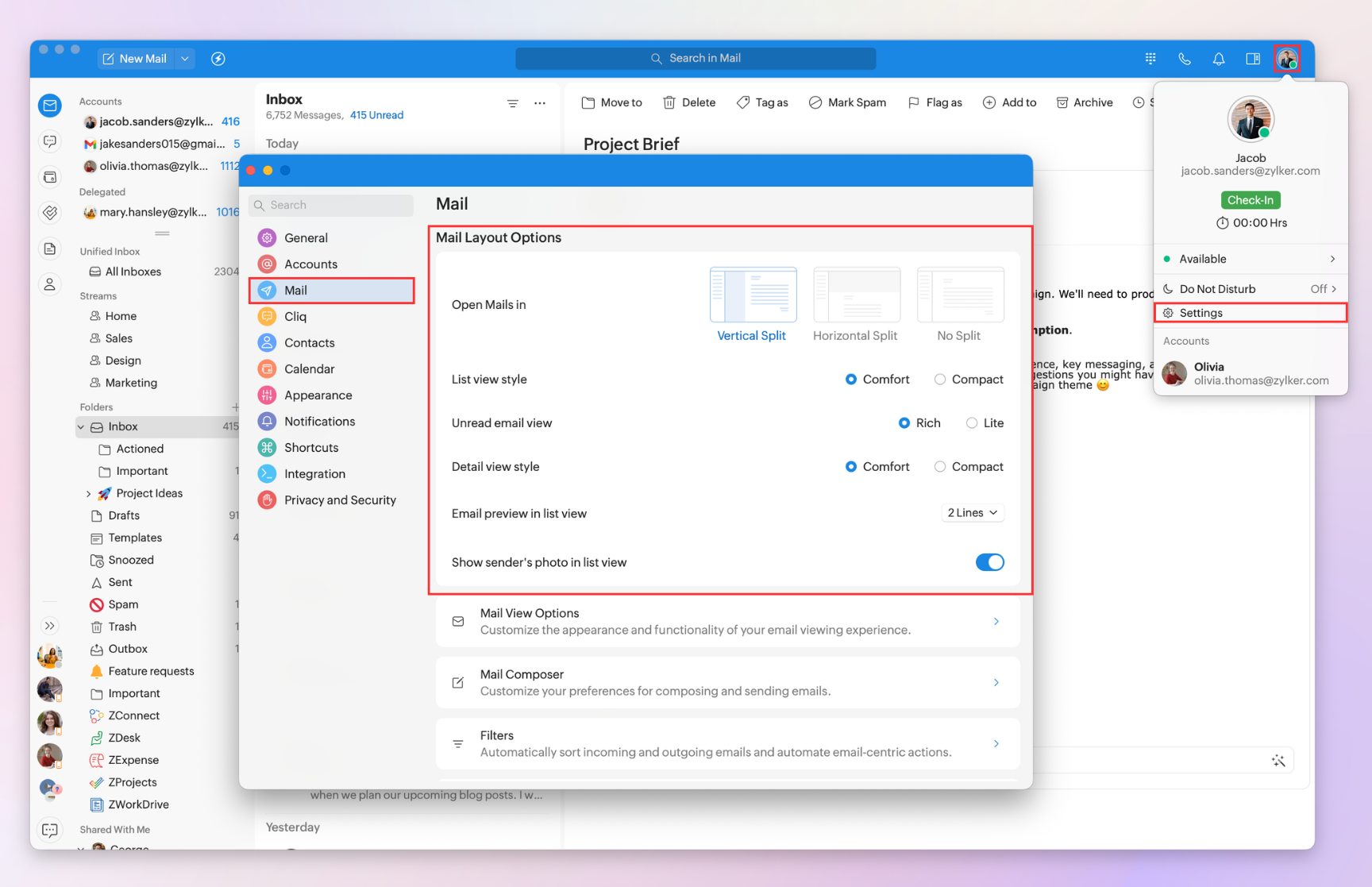 The Mail Layout customizations help you control how your inbox is structured and how emails appear in the list and detail views.