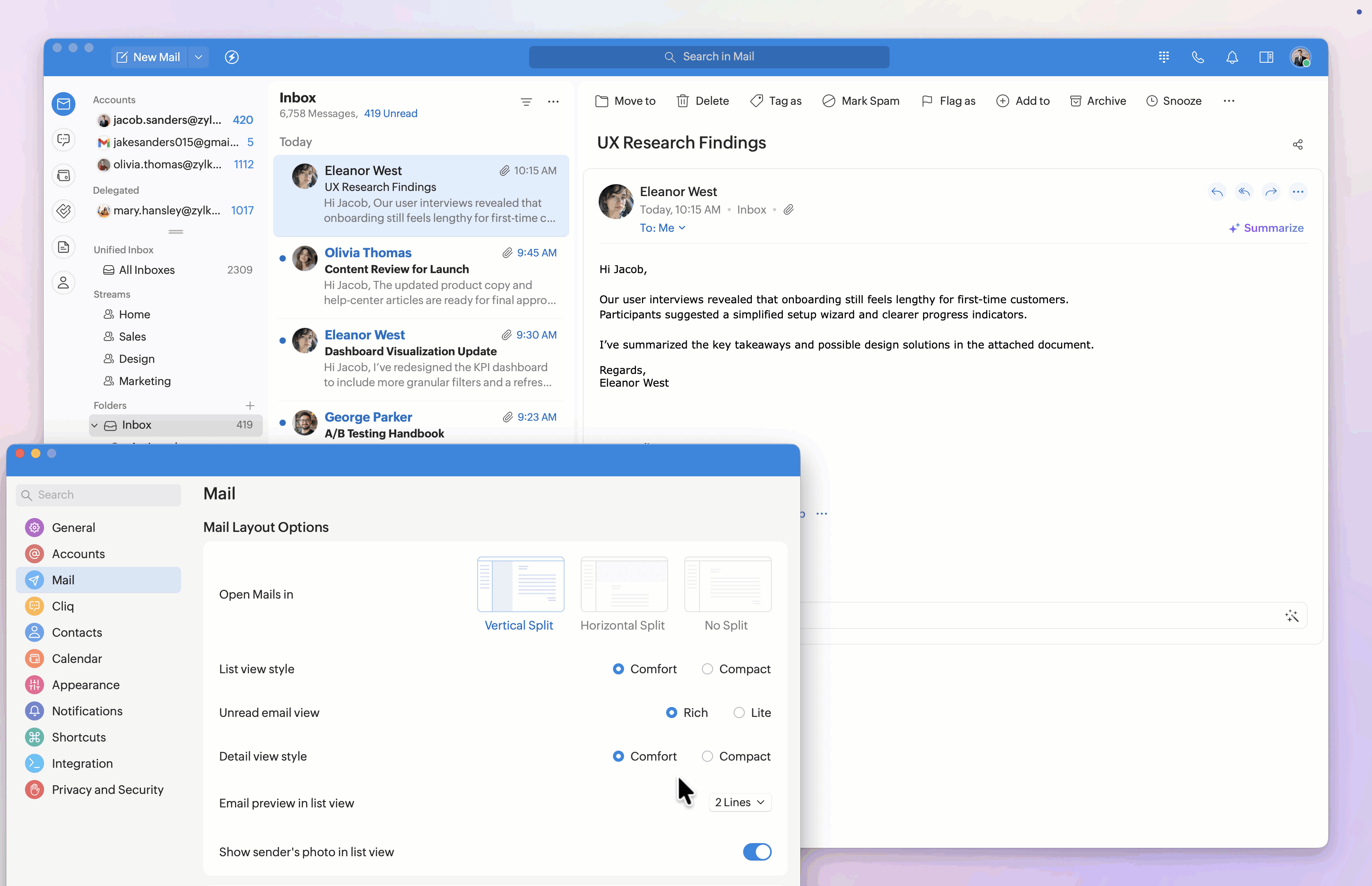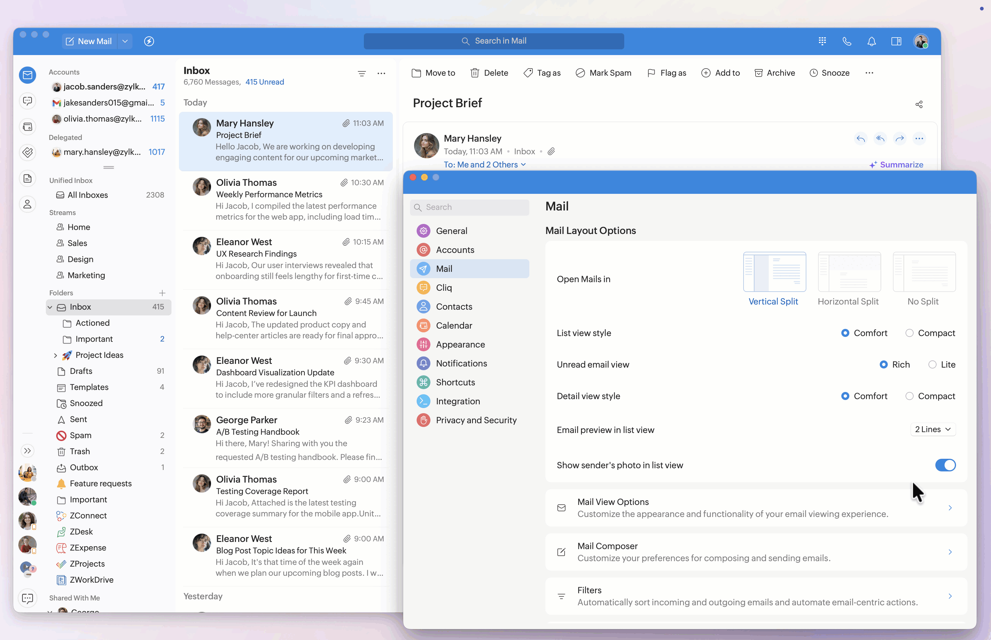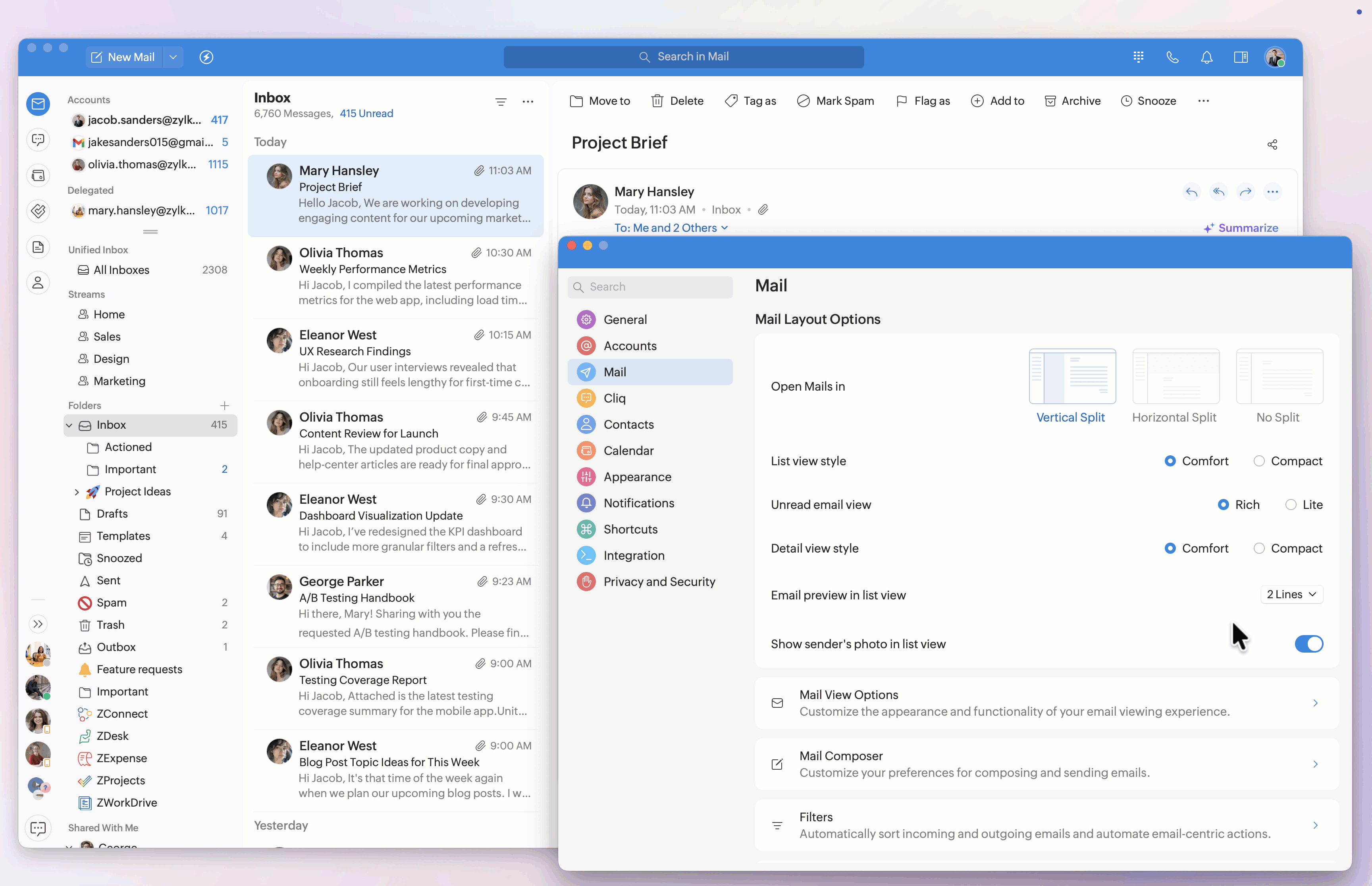 The Mail Layout customizations help you control how your inbox is structured and how emails appear in the list and detail views.