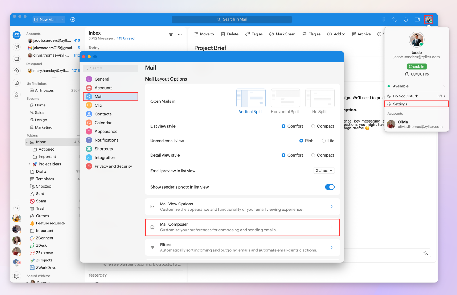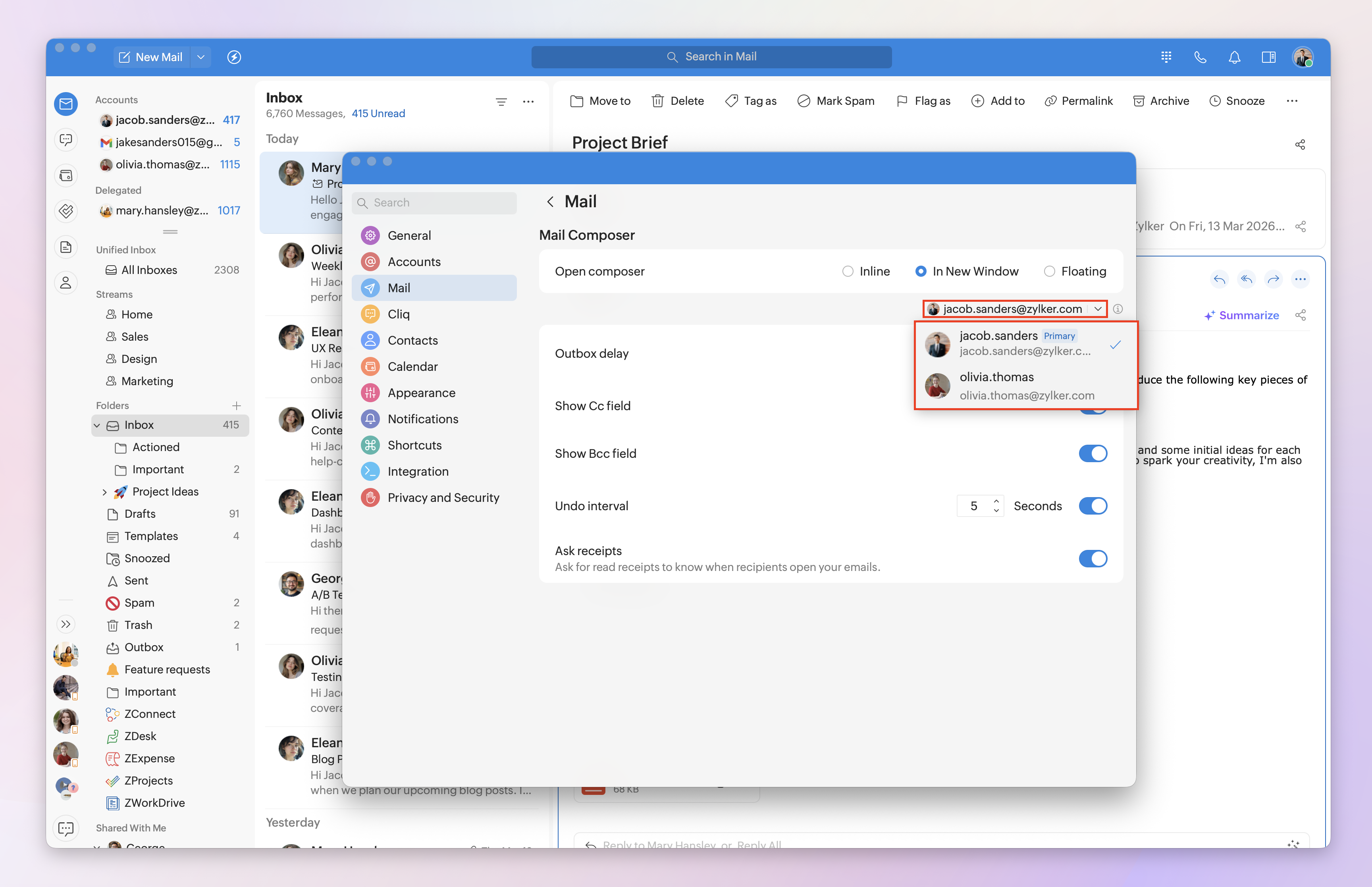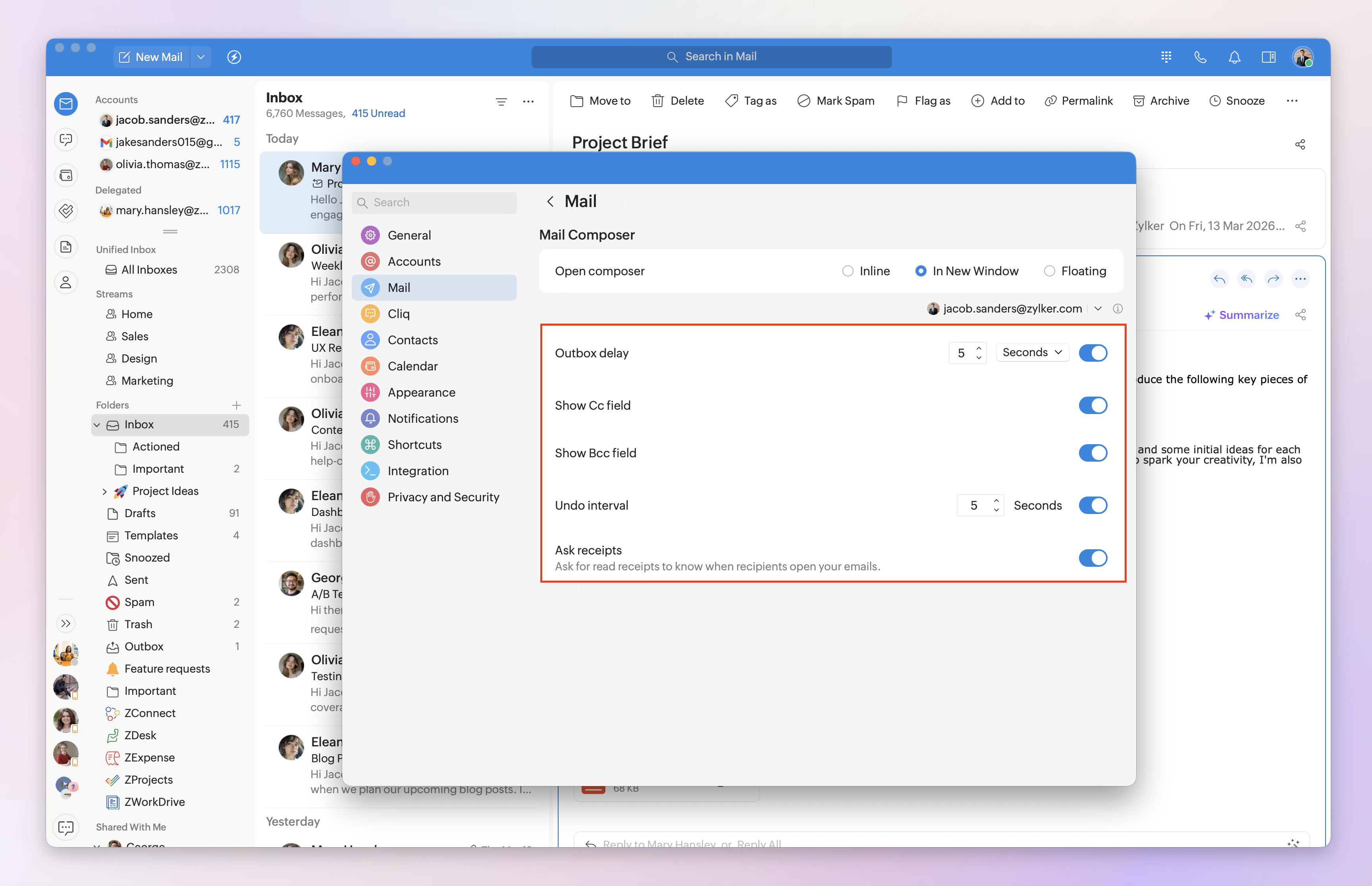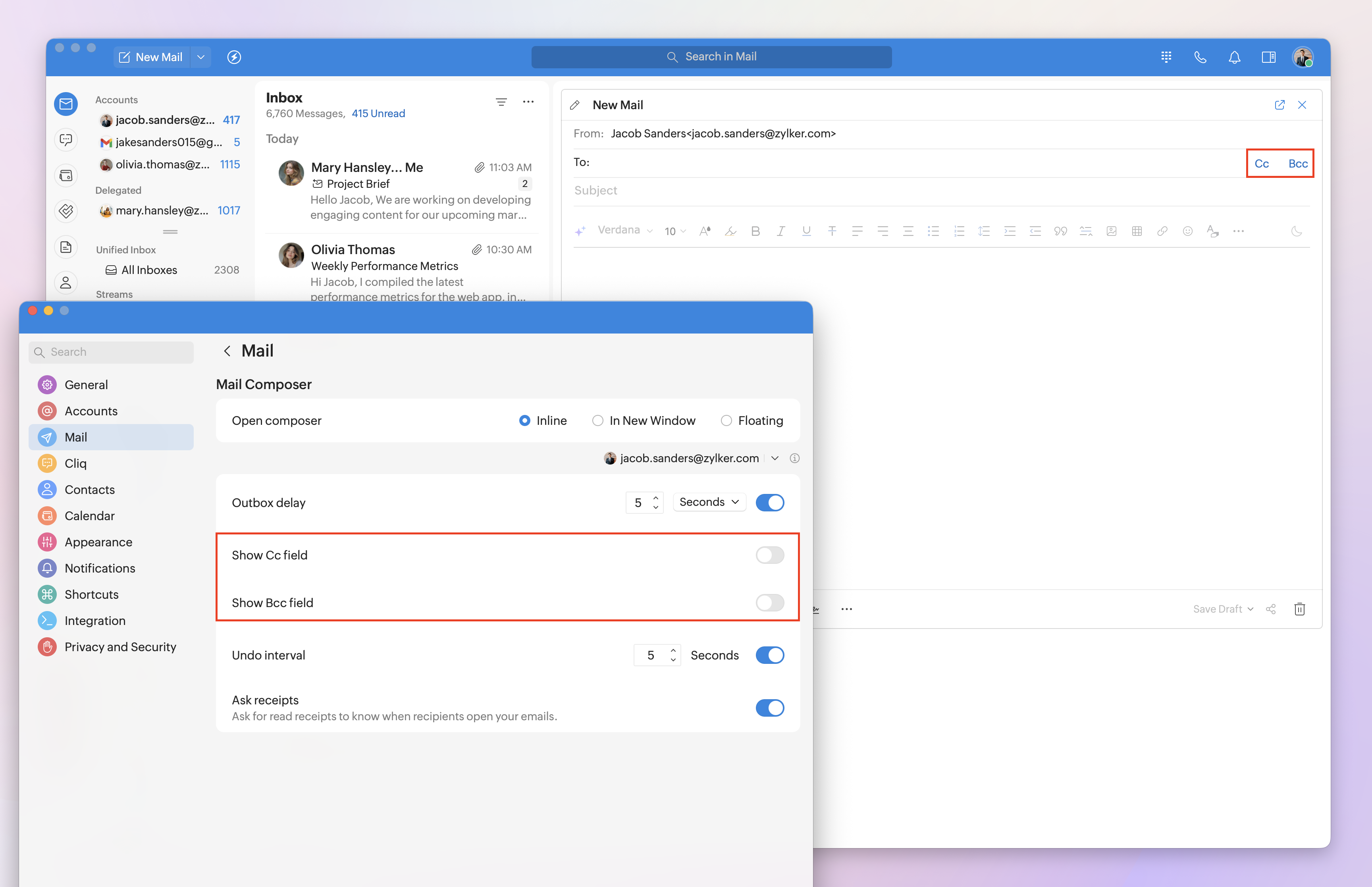 Note: Setting the outbox delay and undo interval, showing the Cc/Bcc fields, and requesting receipts can be customized for each logged-in Zoho Mail account. Select the desired email account from the drop-down menu, then customize the settings to your needs.
