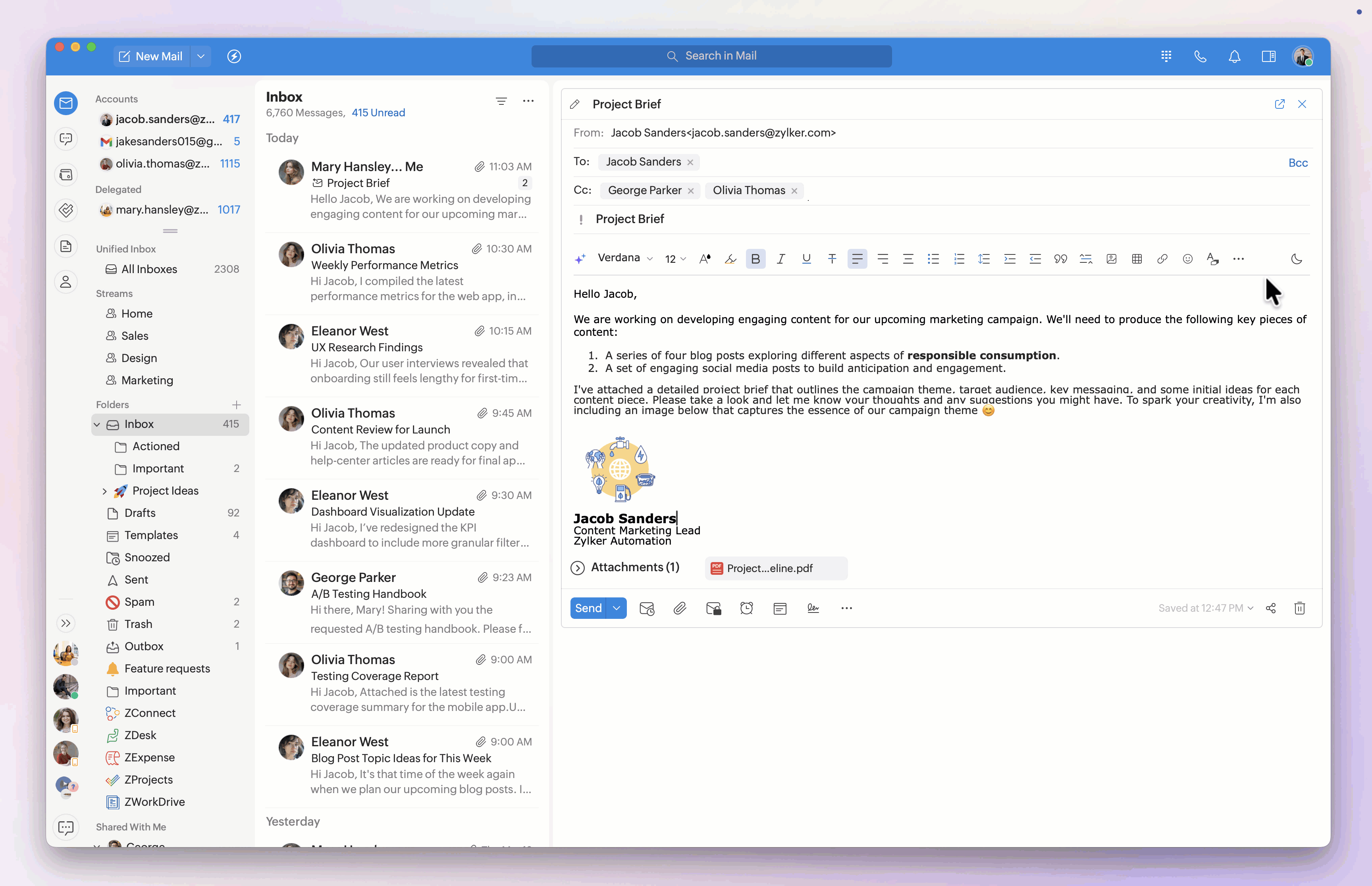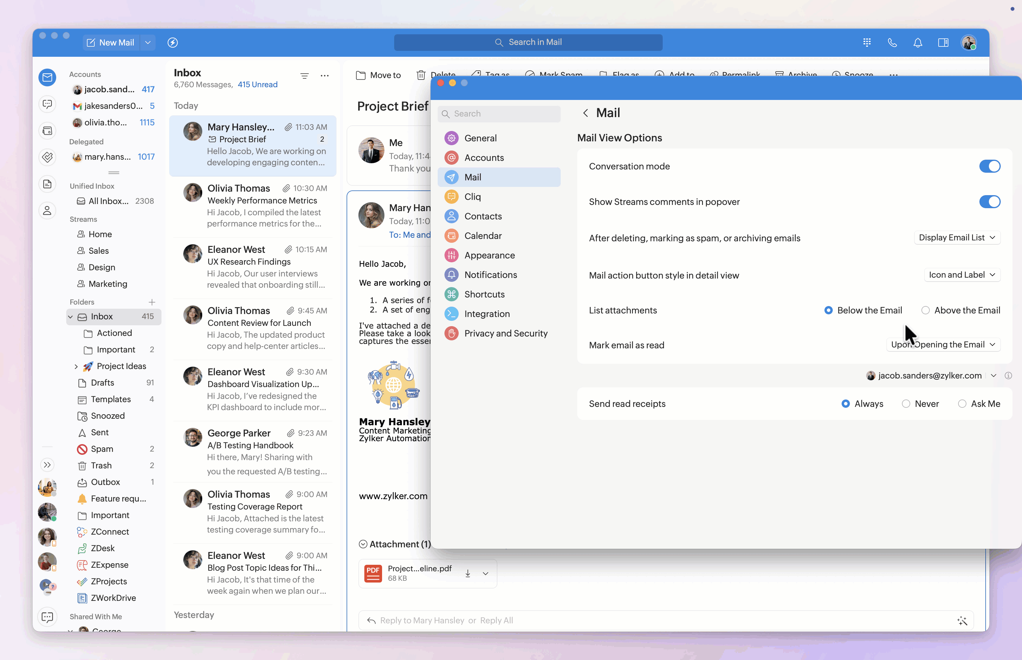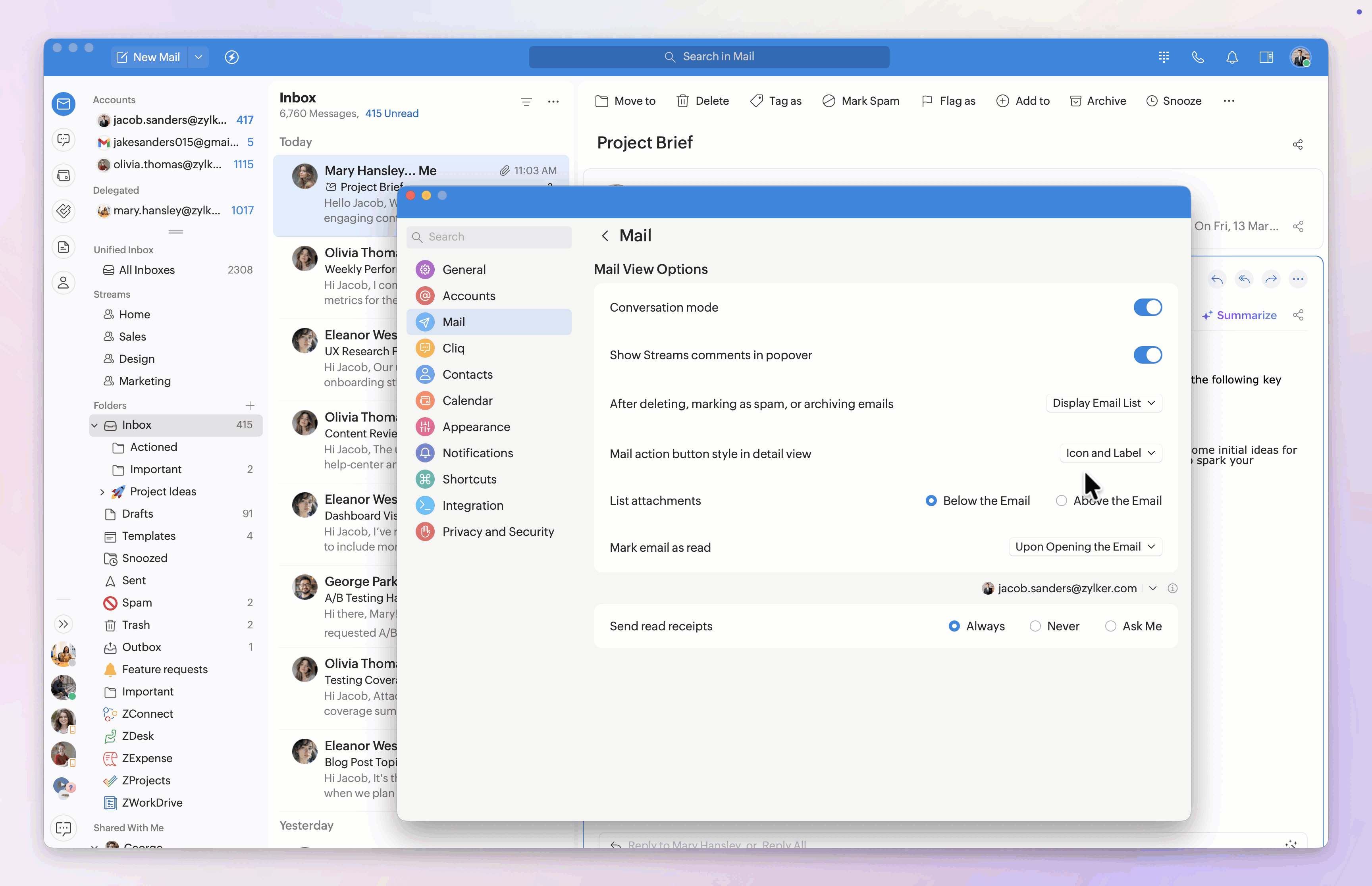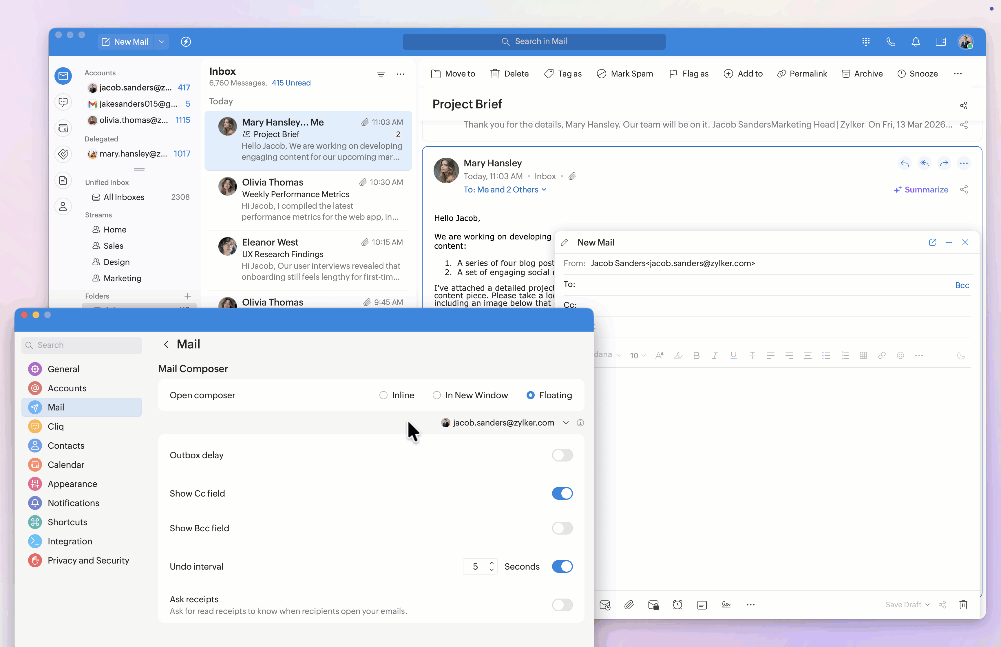 Note: Setting the outbox delay and undo interval, showing the Cc/Bcc fields, and requesting receipts can be customized for each logged-in Zoho Mail account. Select the desired email account from the drop-down menu, then customize the settings to your needs.
