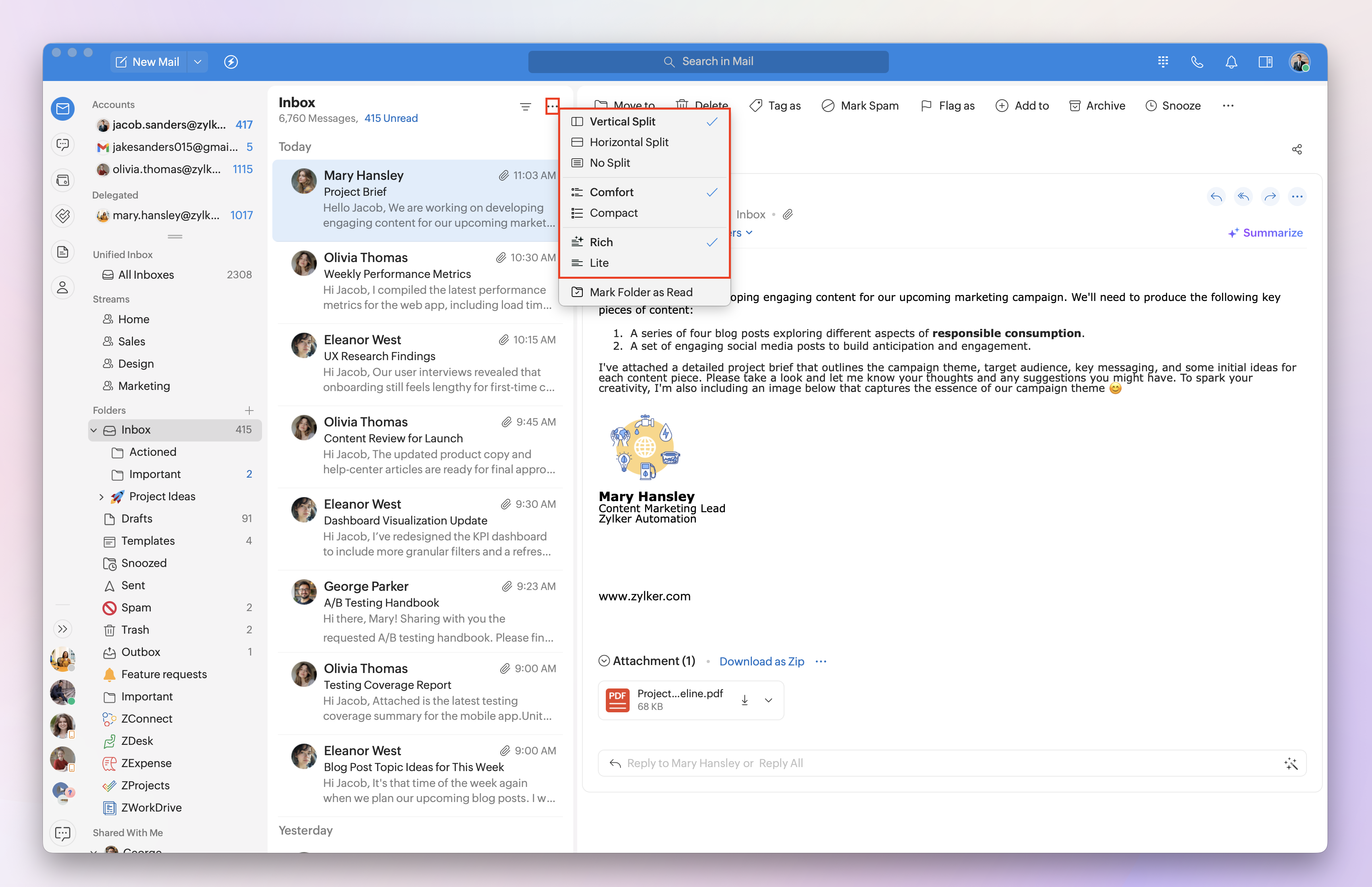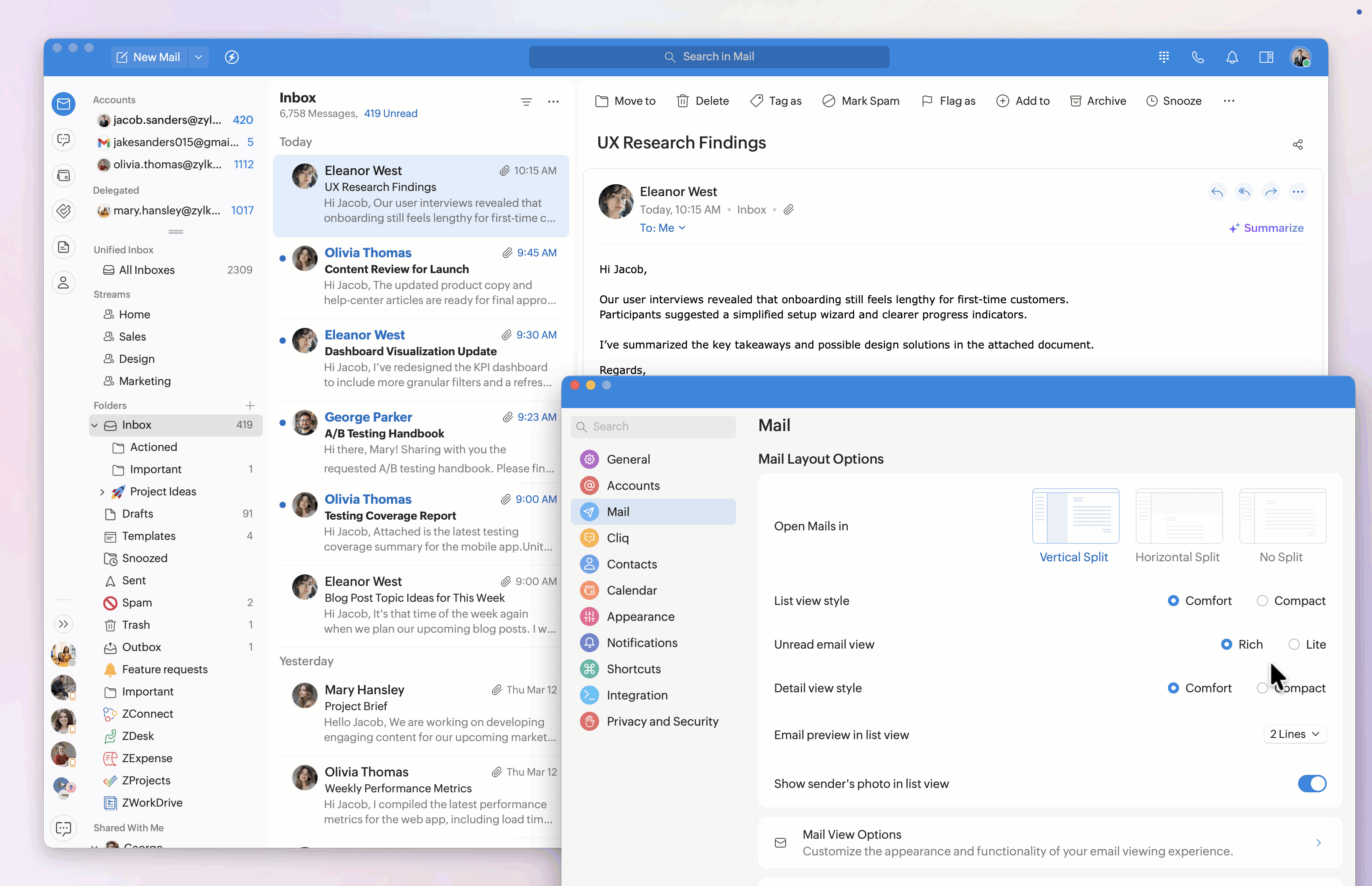 - Vertical Split: Displays the email list on the left and the email content on the right side-by-side.