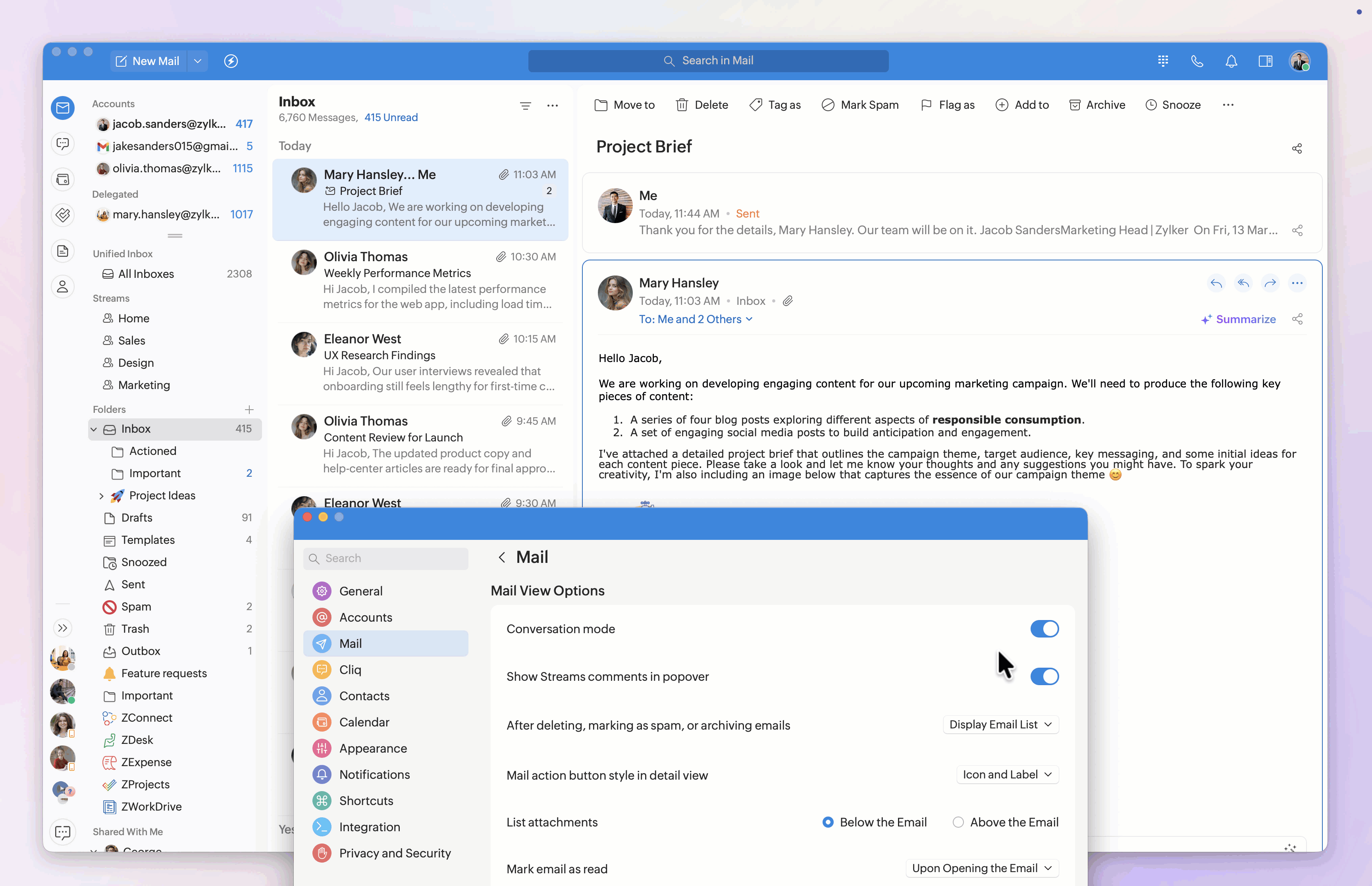 Note: You can also access the Open Mails in, List view style, and Unread email view customization settings from More Options in the email list.