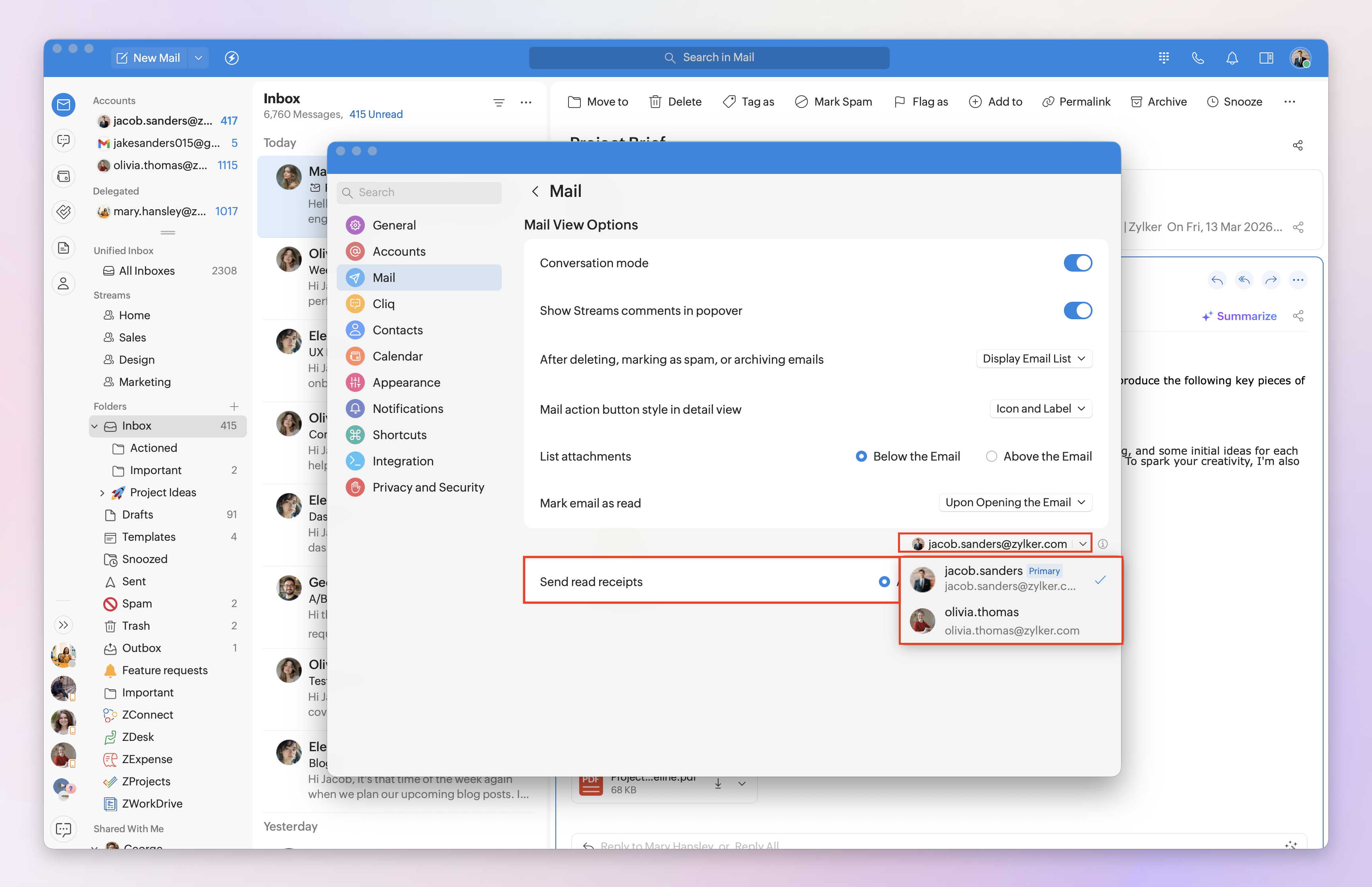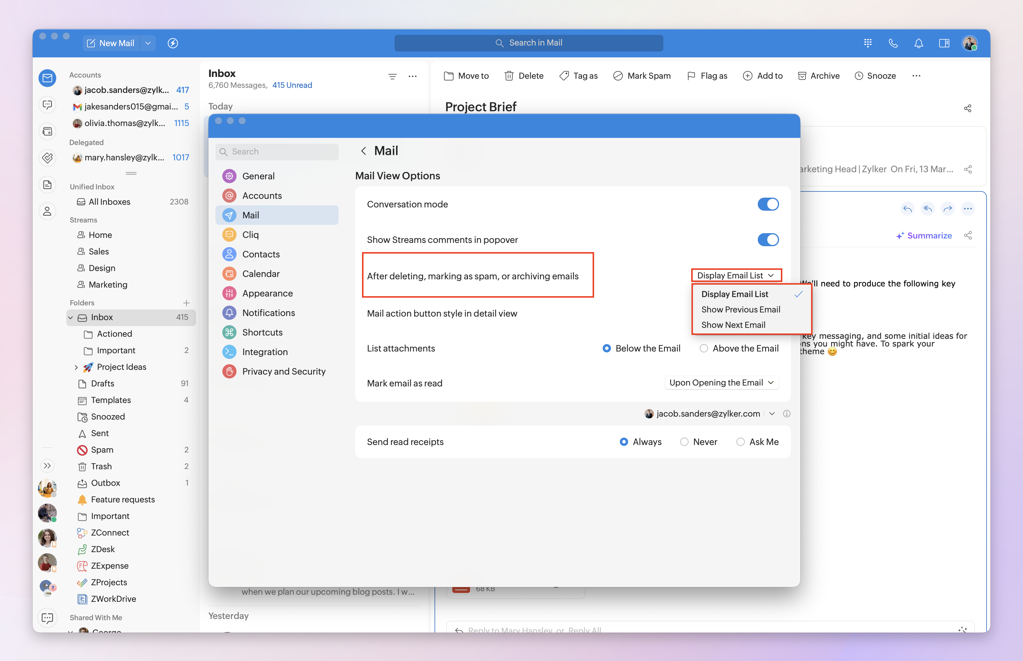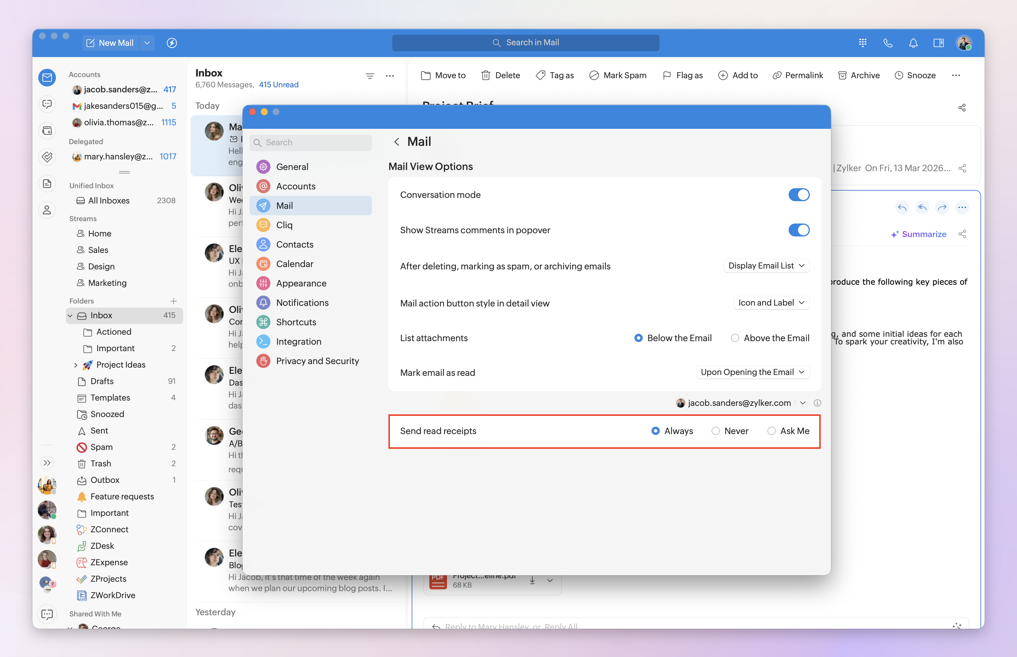 Note: Sending read receipts can be customized for each logged-in Zoho Mail account. Select the desired email account from the drop-down menu, then set when read receipts should be sent.