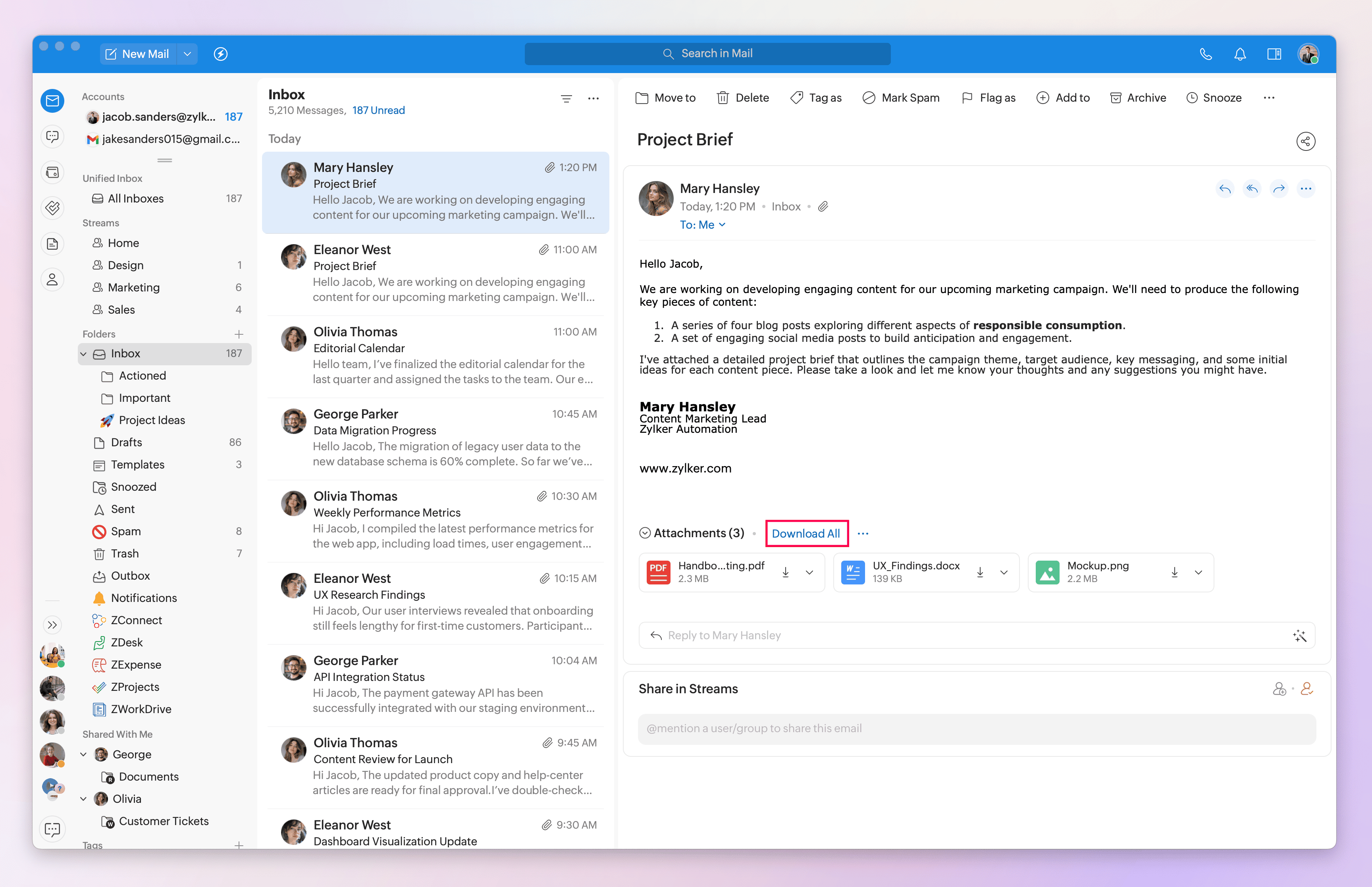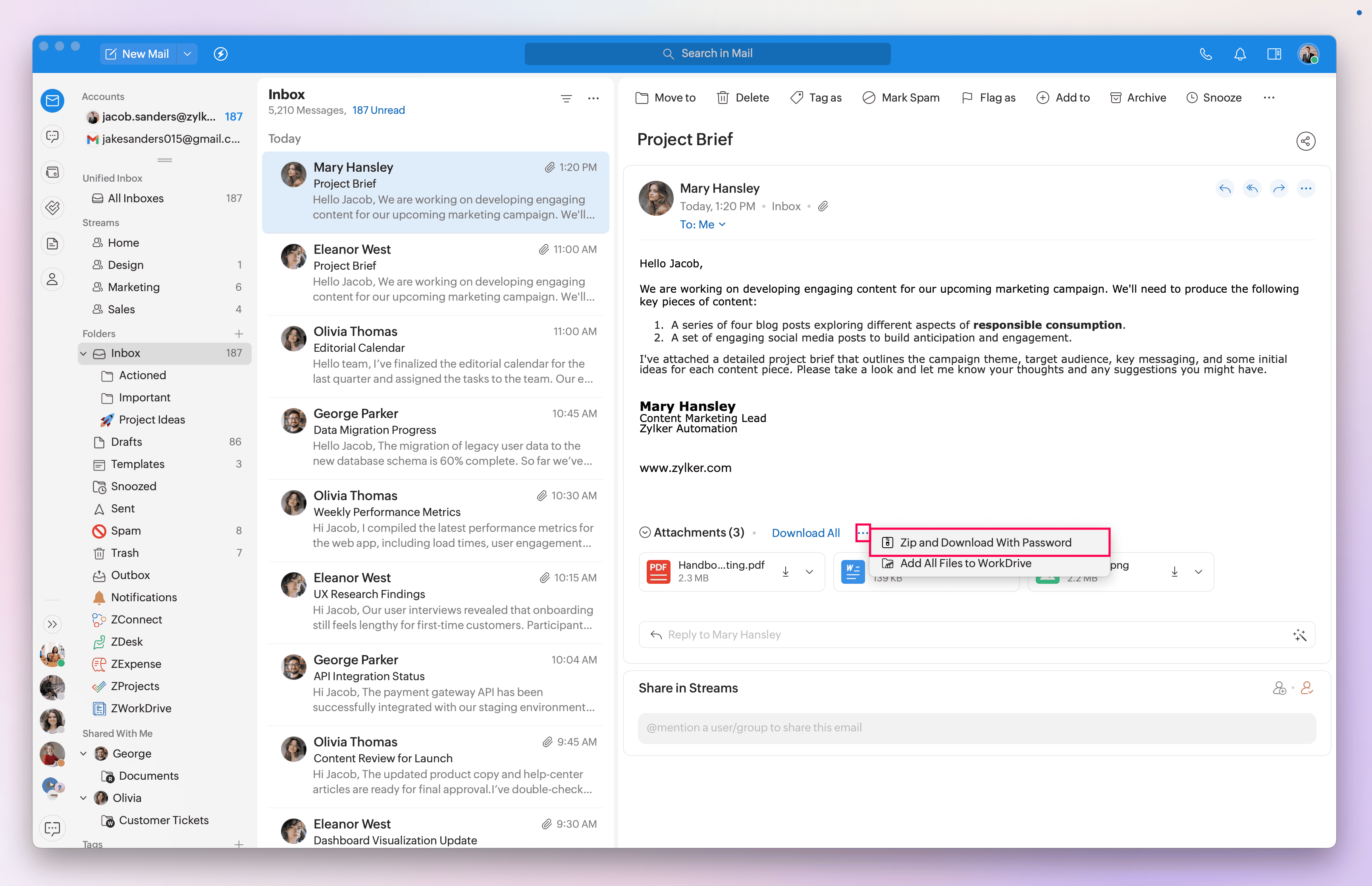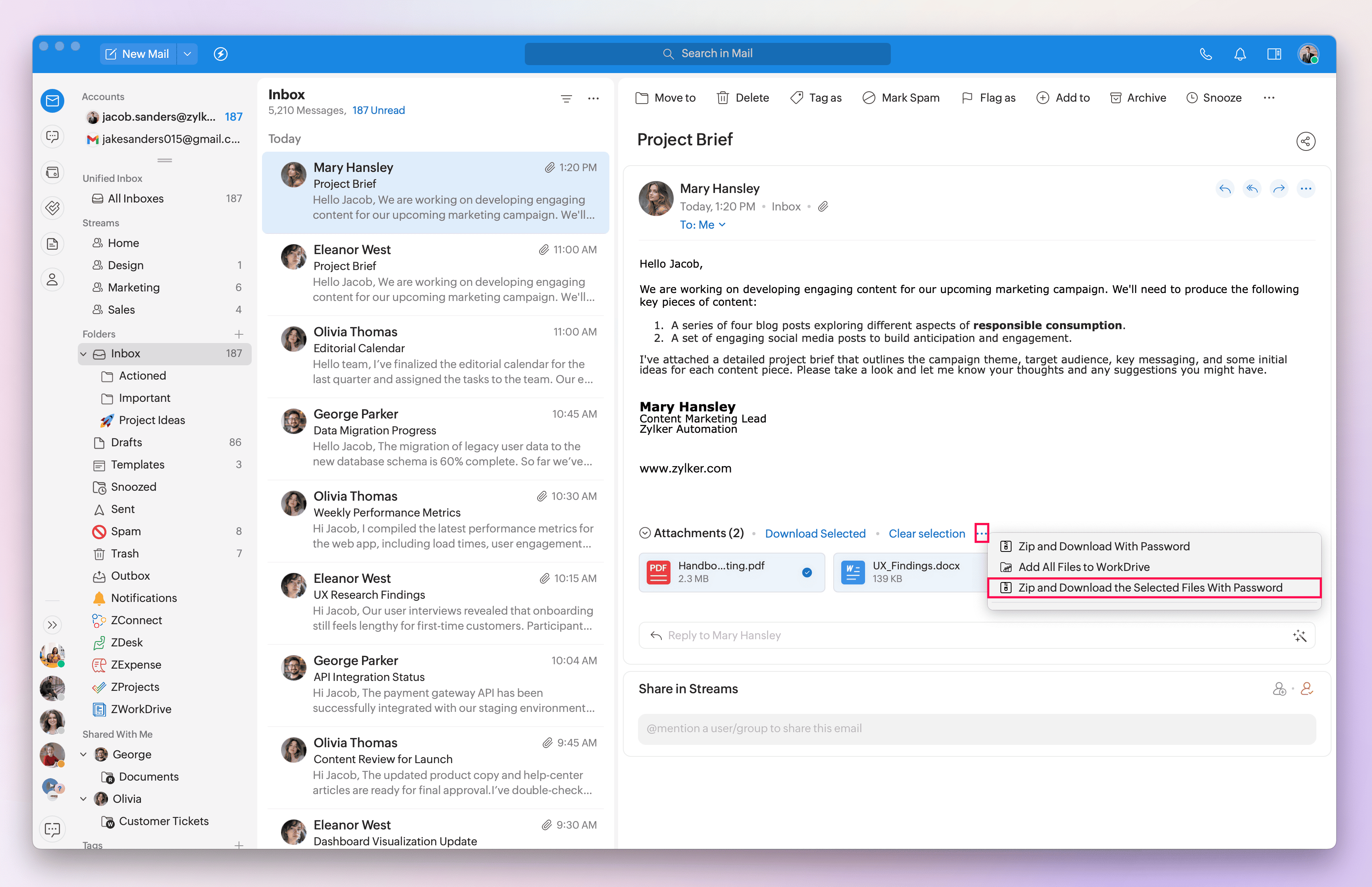 You can download single, multiple, or all attachments from an email. Depending on your needs, you can download them directly or as a ZIP archive, with or without password protection.