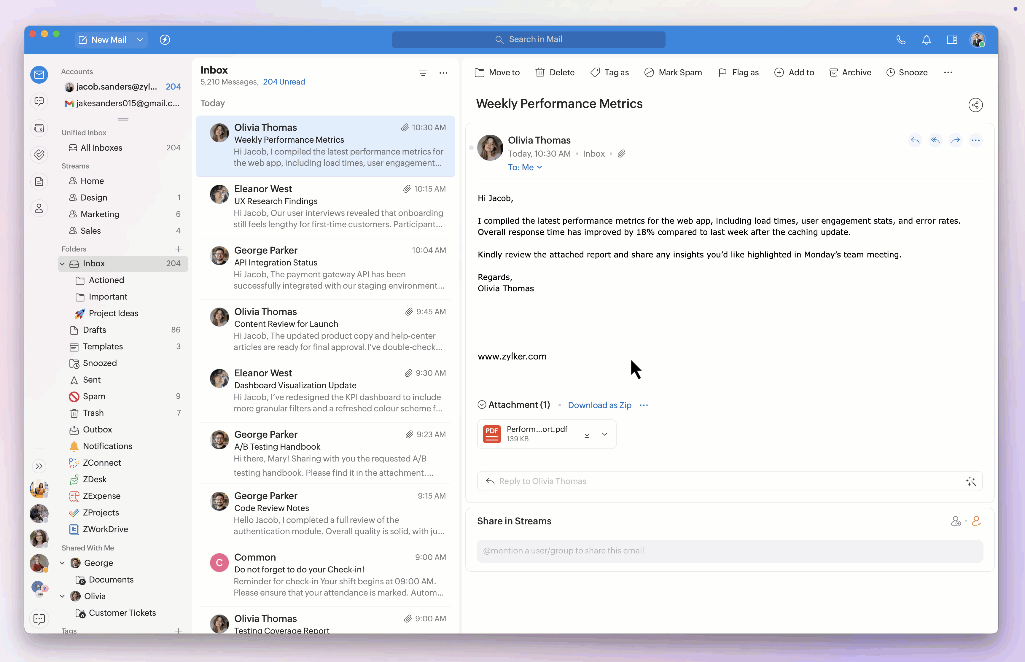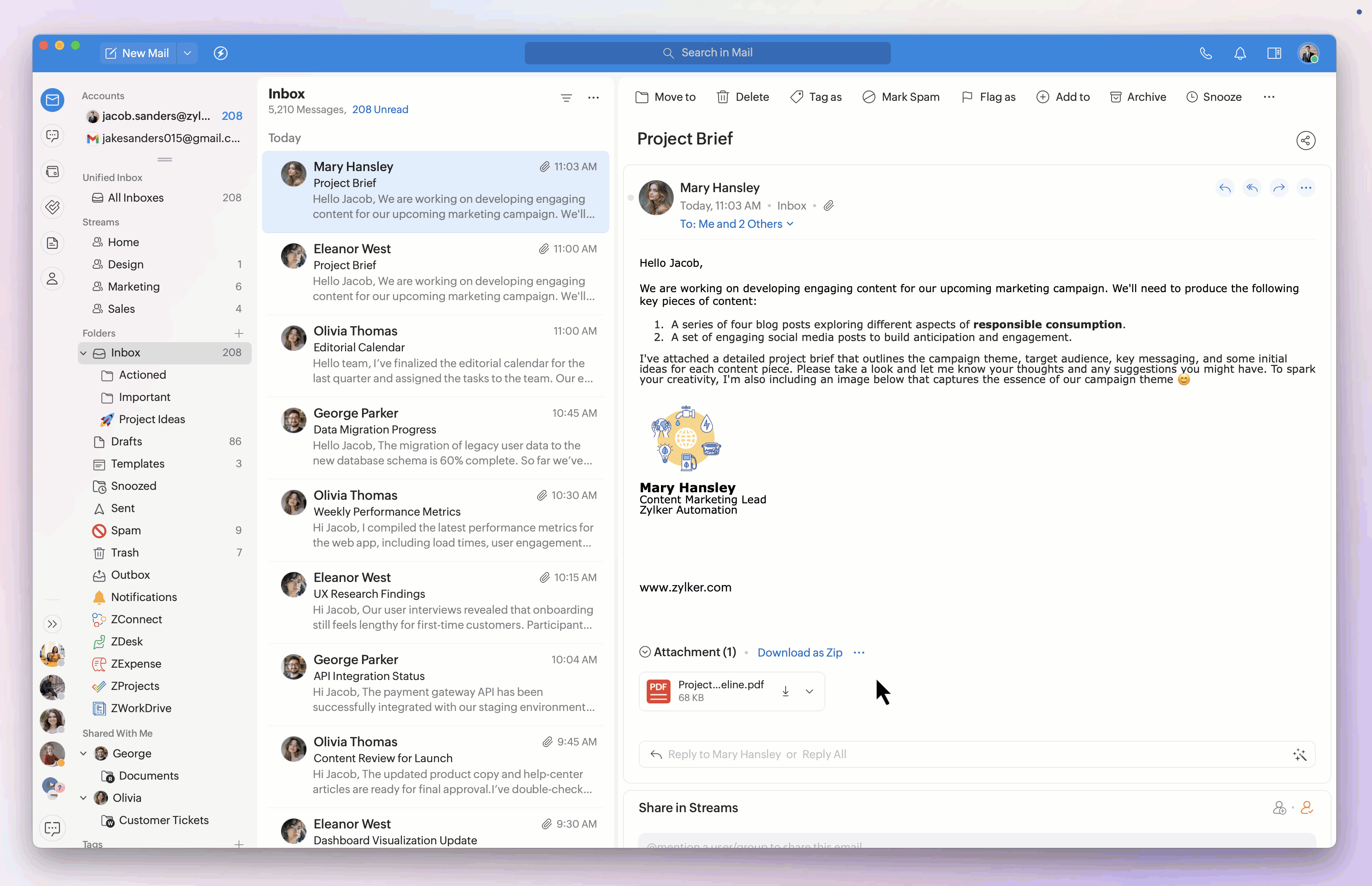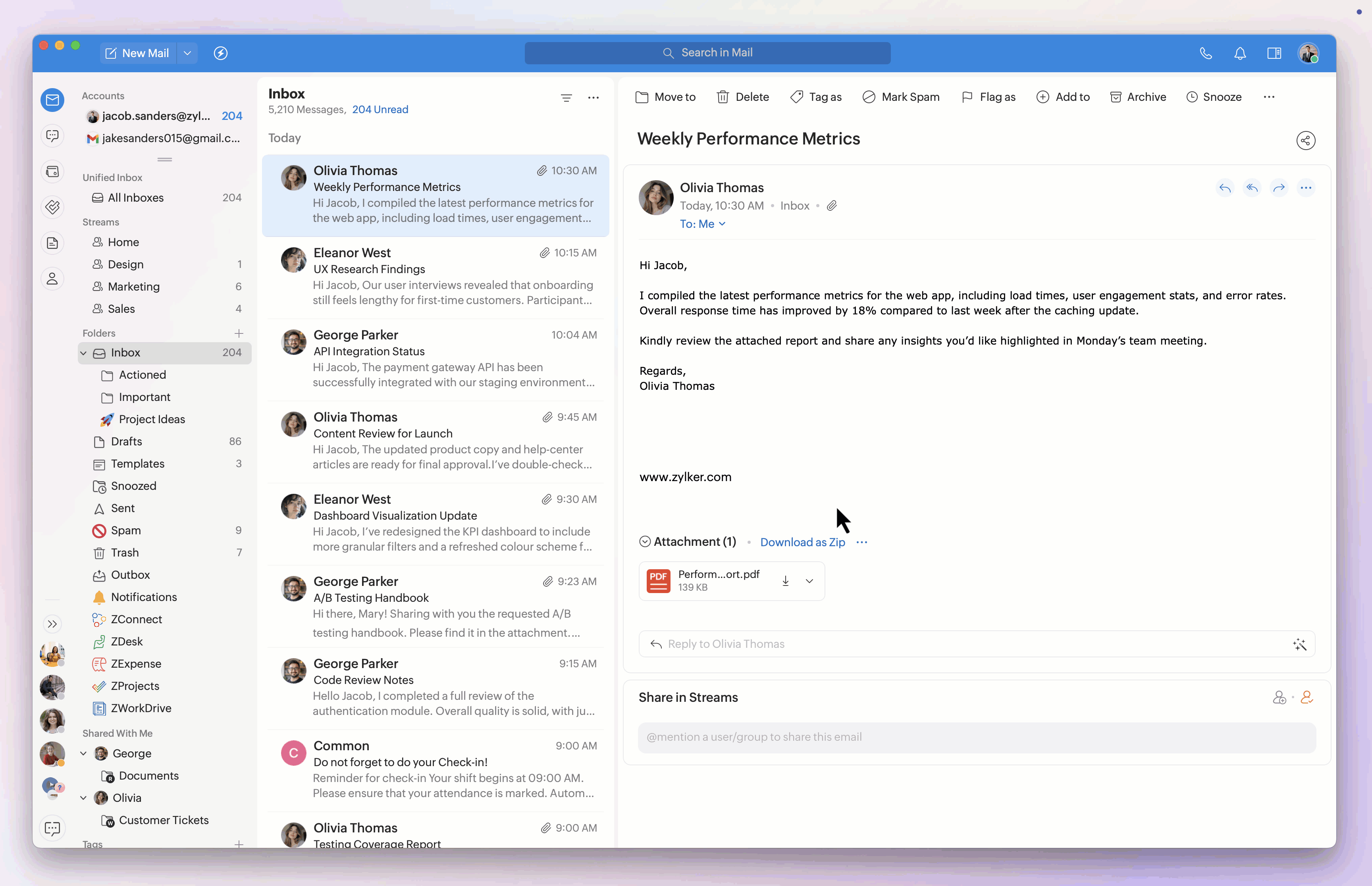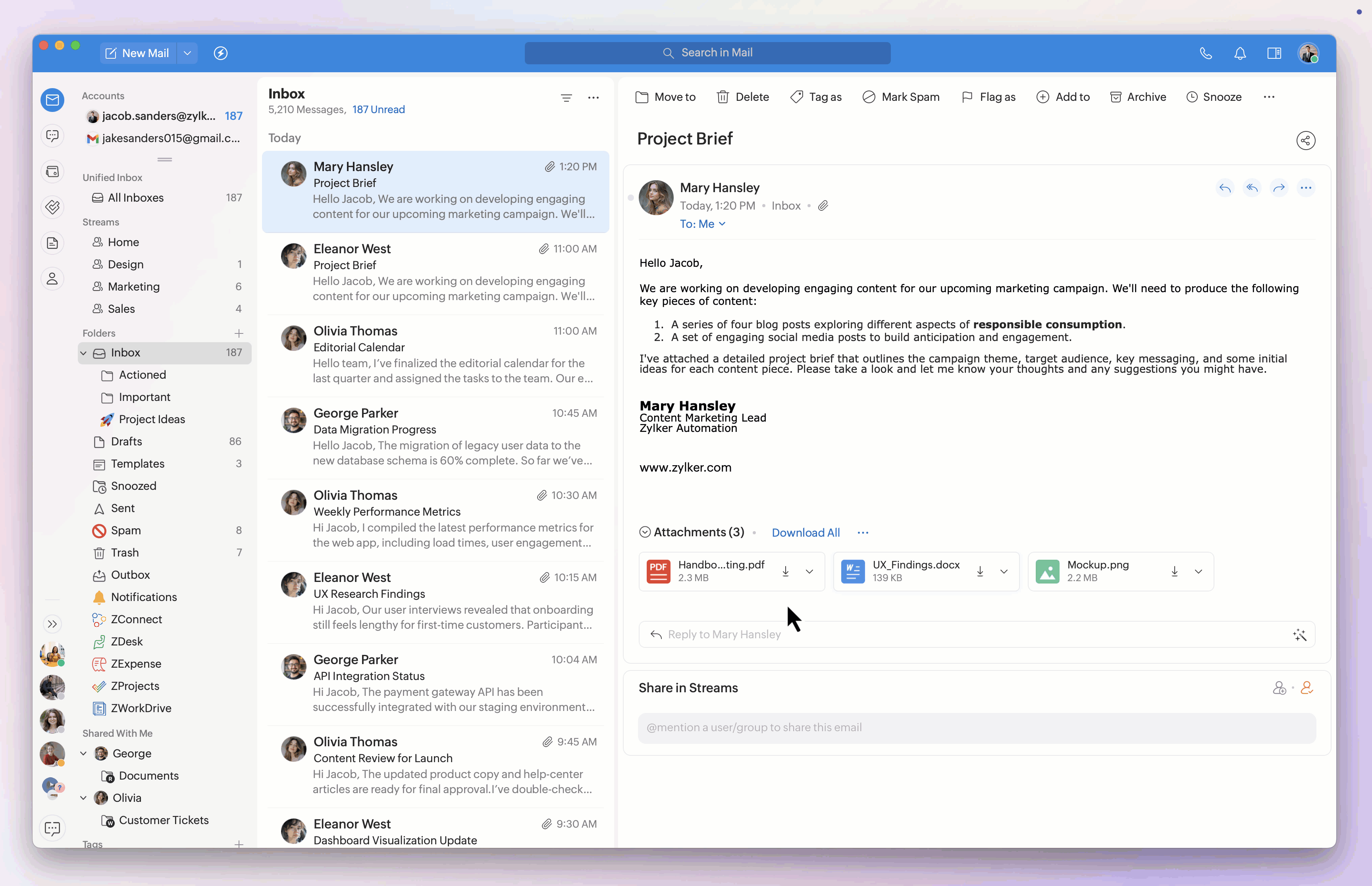You can download single, multiple, or all attachments from an email. Depending on your needs, you can download them directly or as a ZIP archive, with or without password protection.