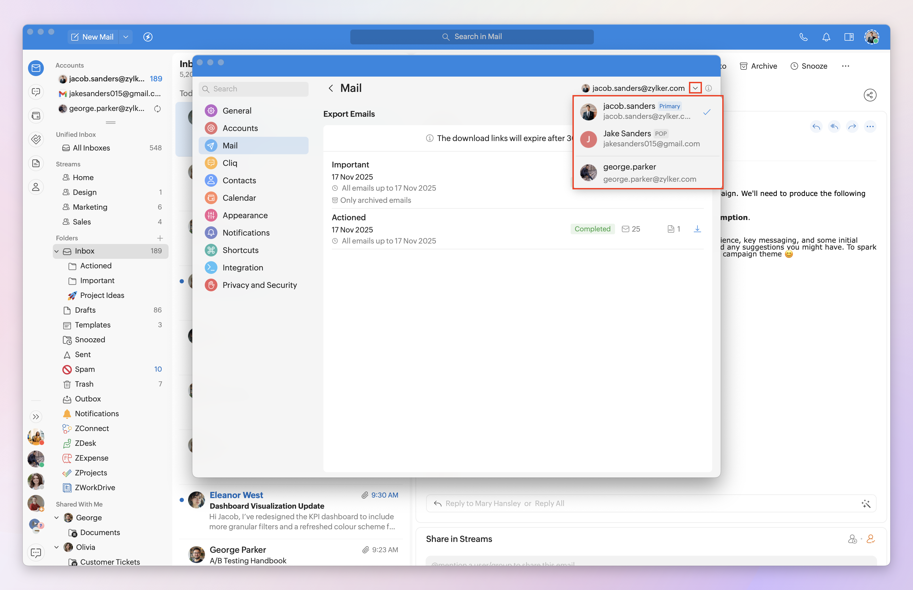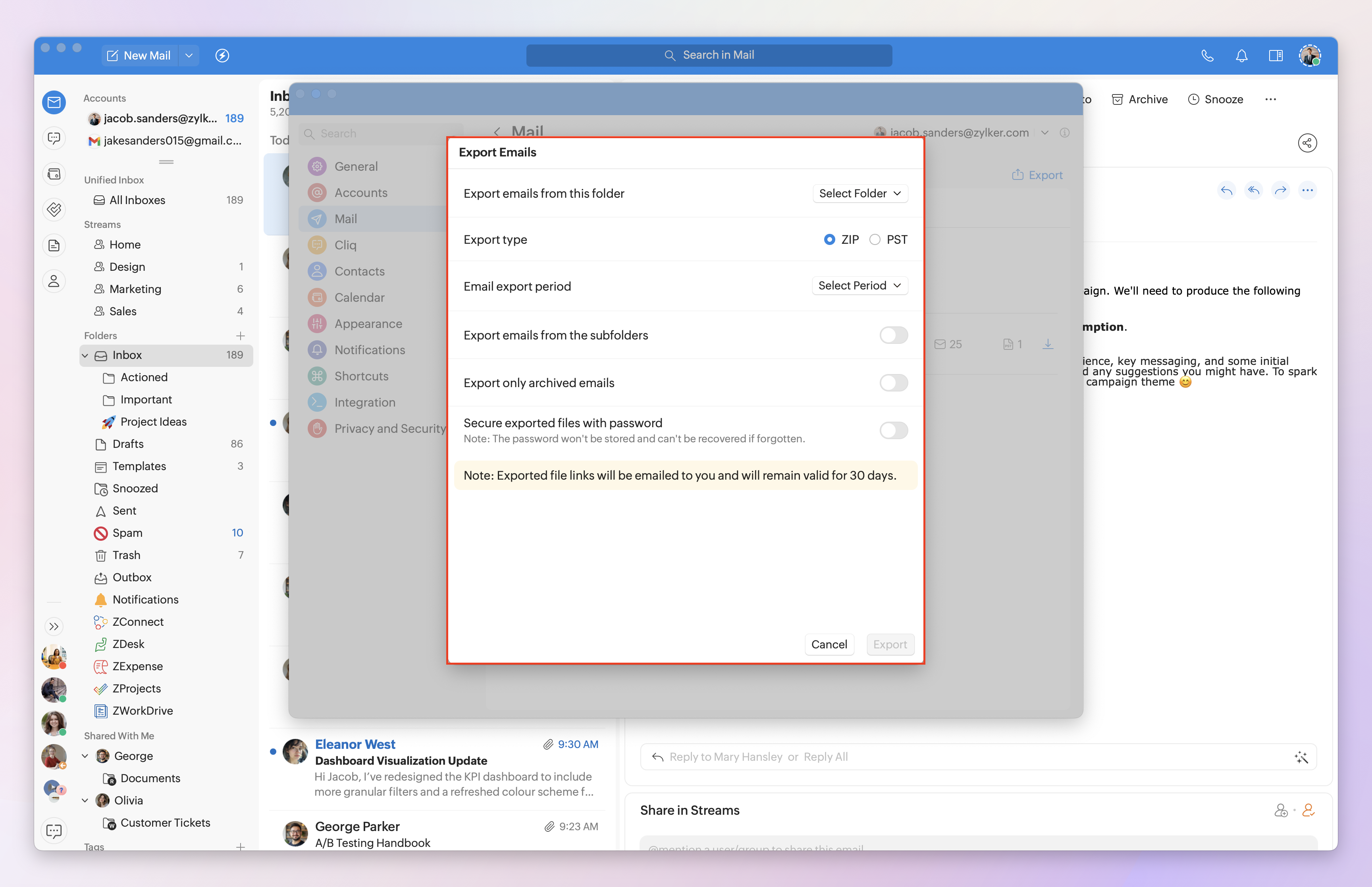 To export emails for your secondary Zoho Mail accounts and other POP/IMAP-configured accounts: