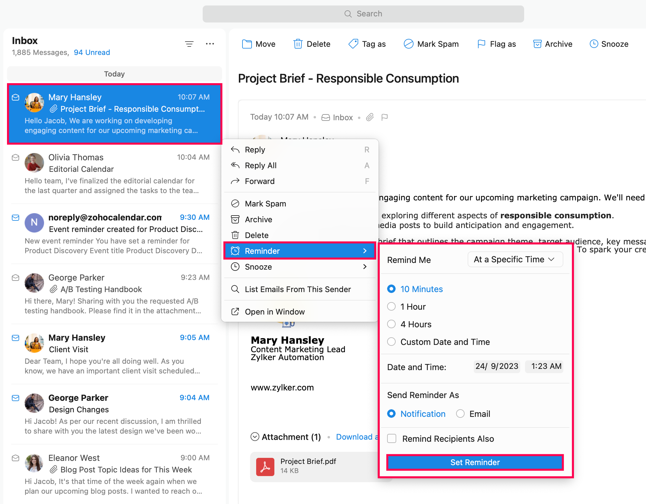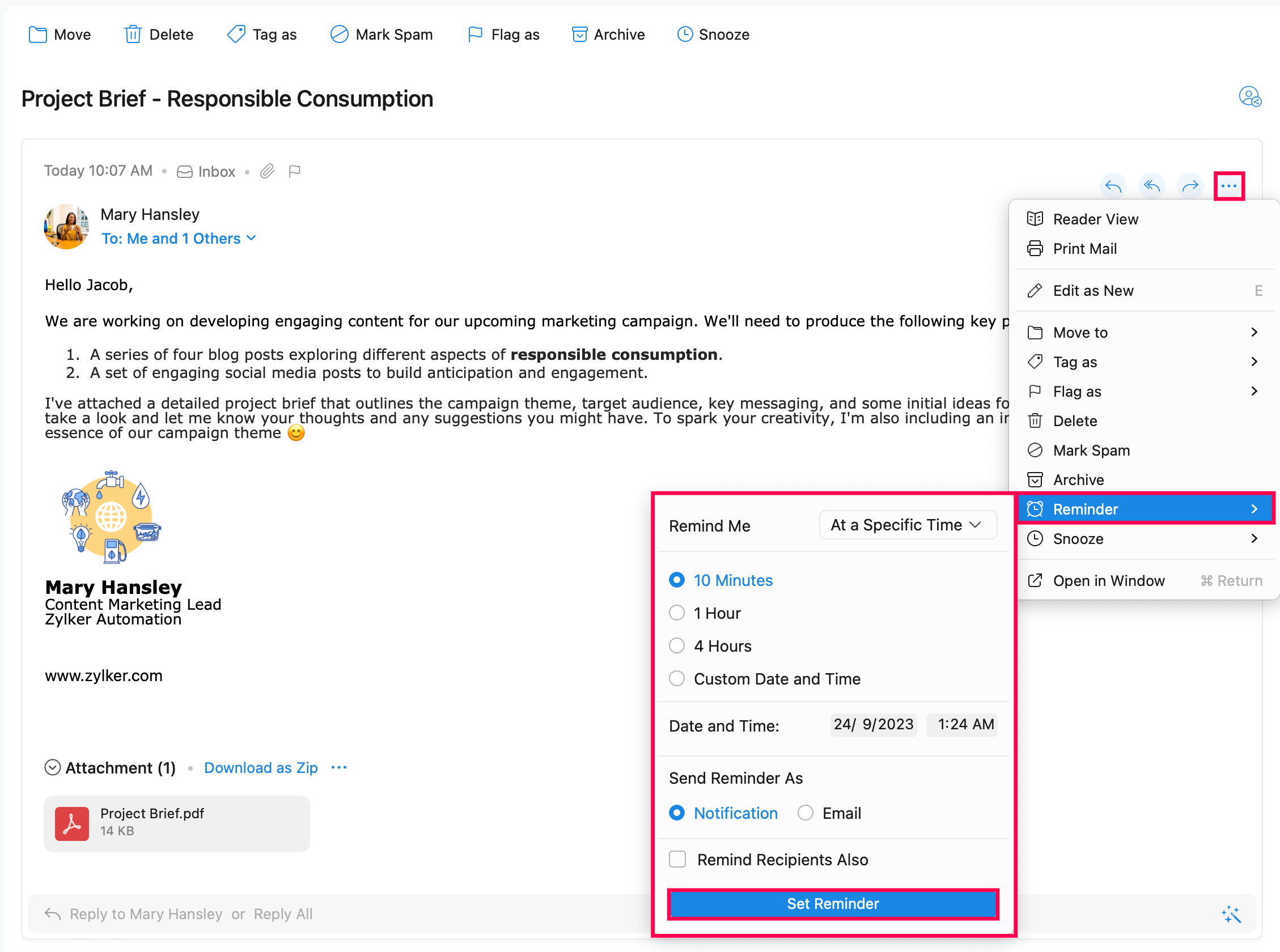 icon at the top-right corner of the email detail view. - Select Reminder from the menu list.