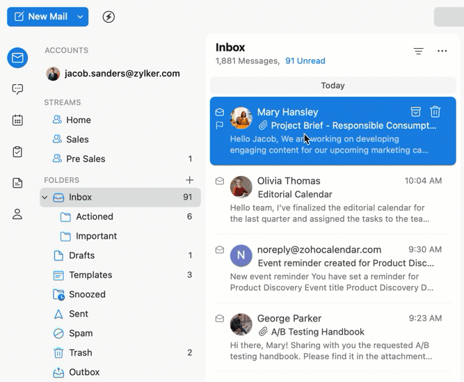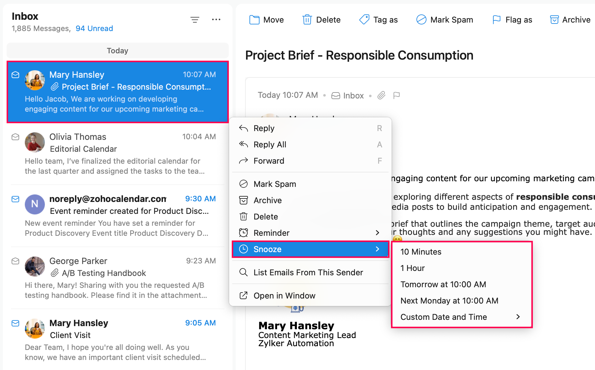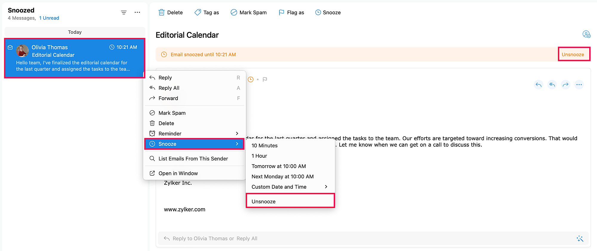 Note: You can also click the Unsnooze option in the email detail banner.To unsnooze an email from the email detail view: