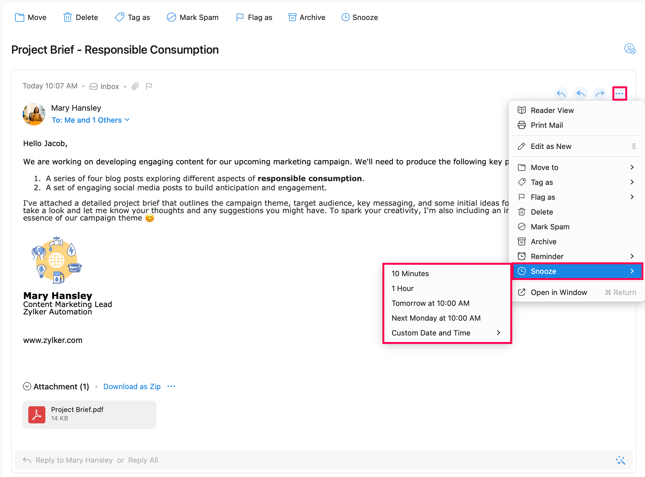 icon at the top-right corner of the email detail view. - Select Snooze from the menu list.