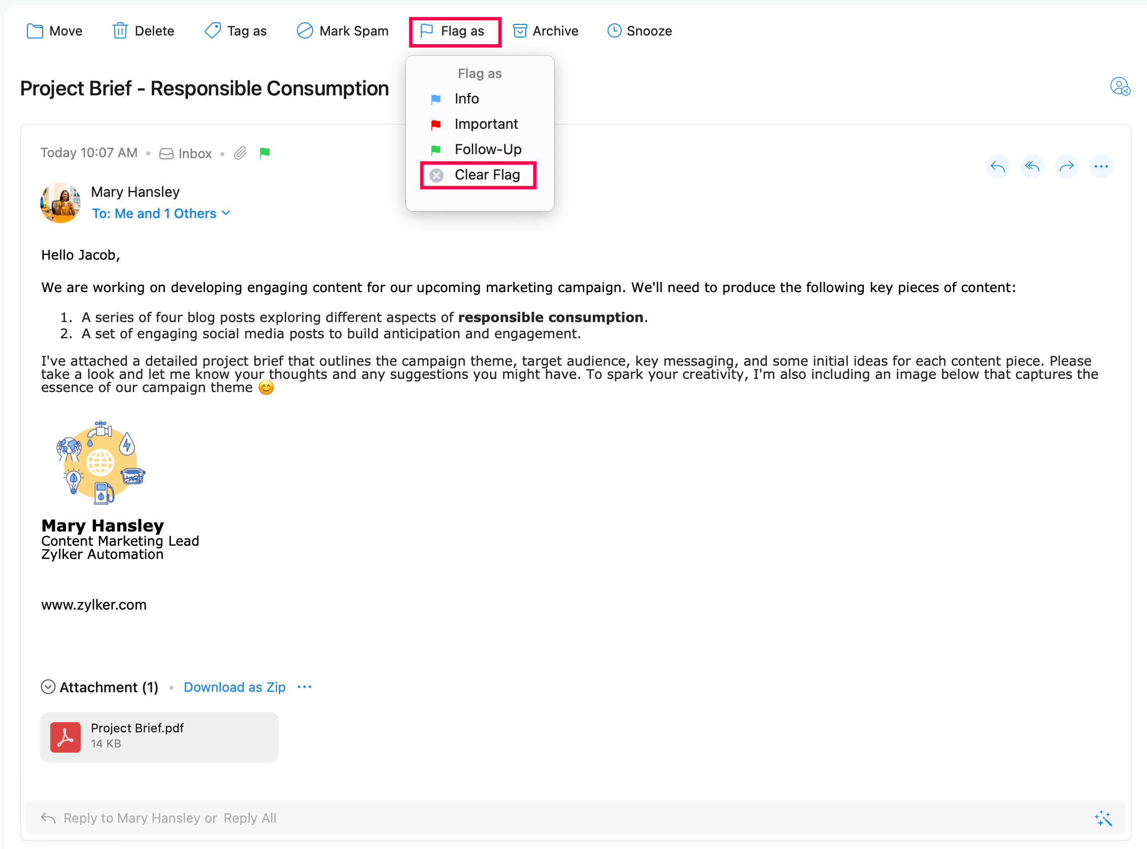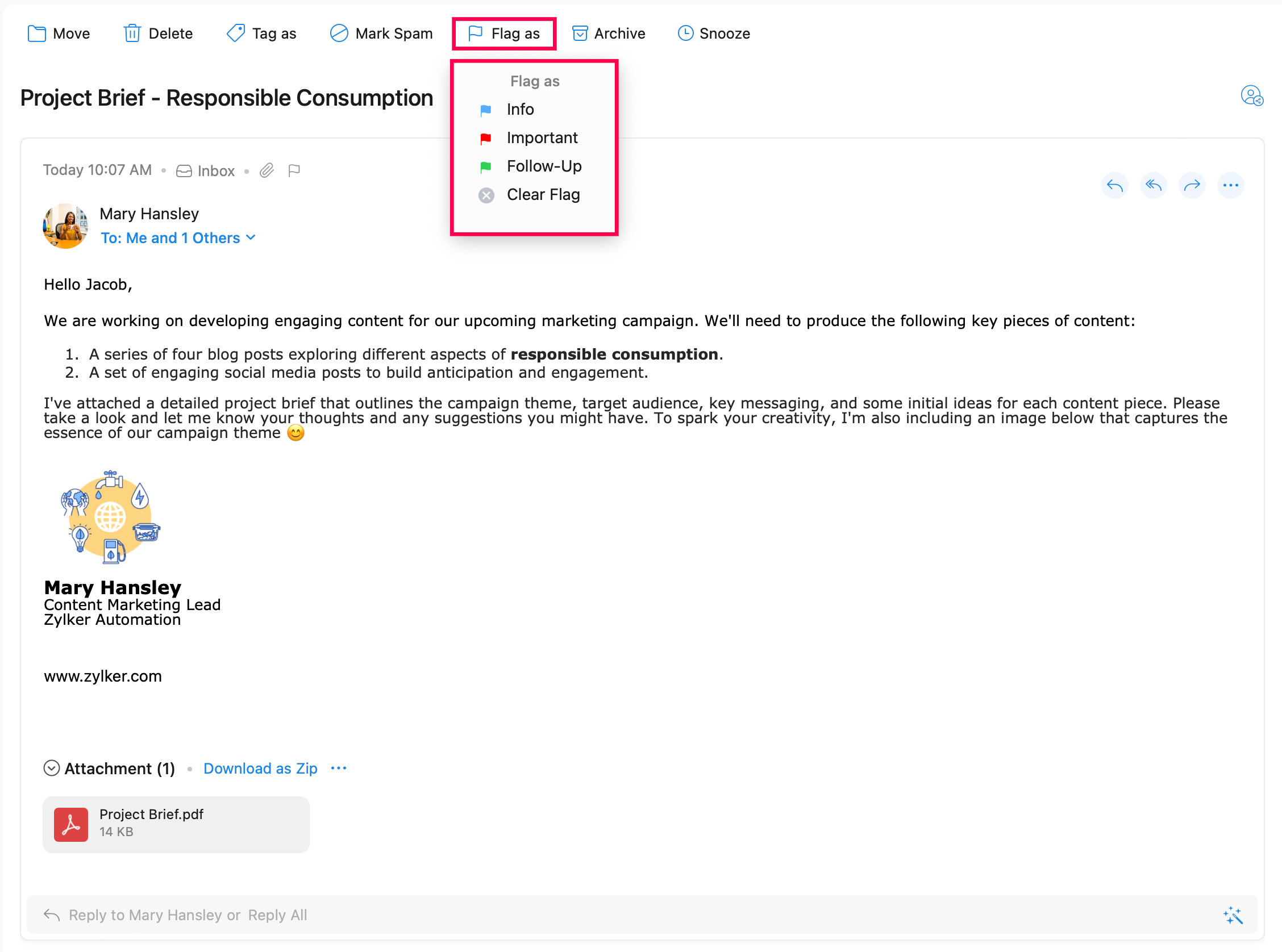 Flags help to find emails easily later by marking them as Info, Information, or Follow-up. Besides Inbox, the flagged emails will appear in the Flagged View.