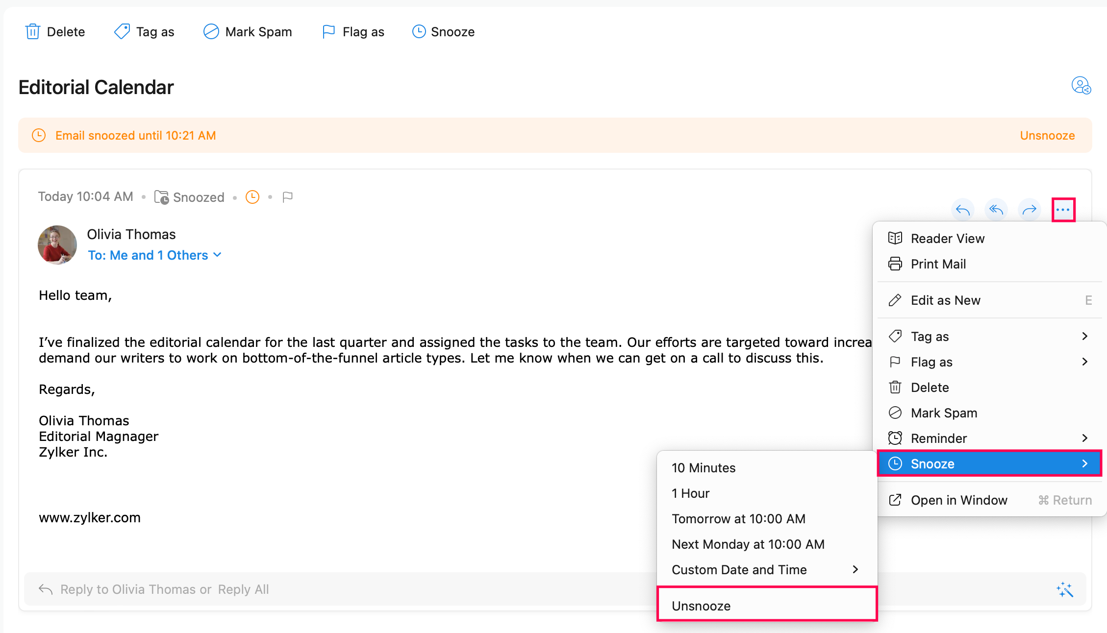 icon at the top-right corner of the email detail view. - Choose Snooze from the menu list that appears and select Unsnooze.
