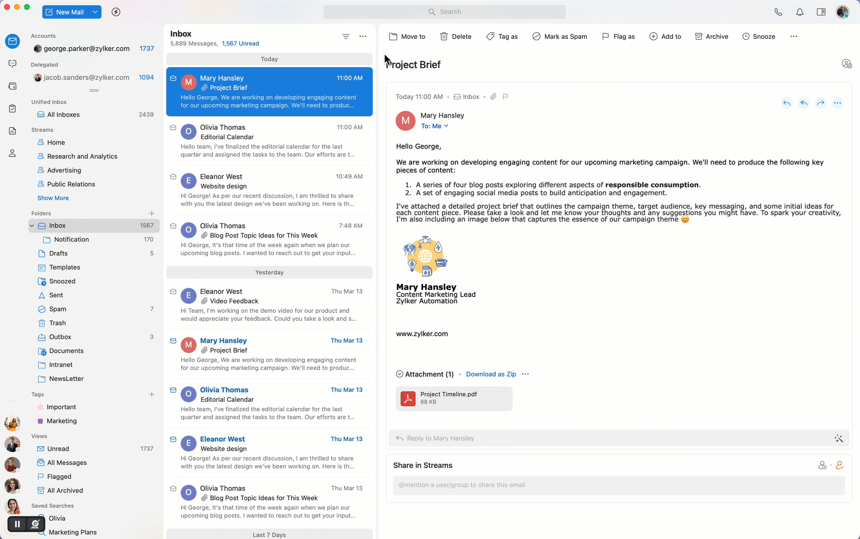 Note: Emails that are unsnoozed appear in the inbox with a snooze indicator along with the time stamp in yellow.