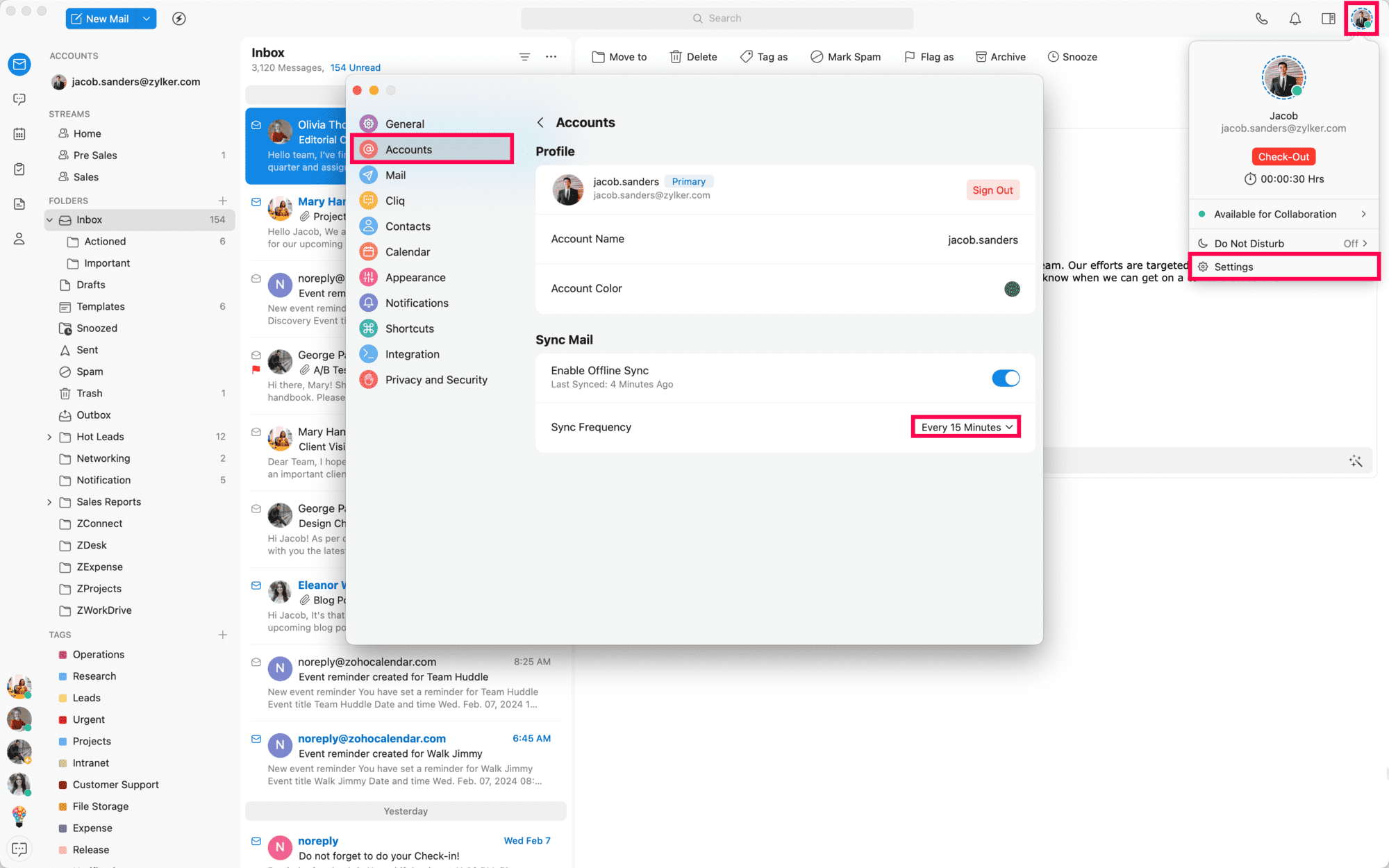 Sync frequency refers to the time interval at which Trident syncs Mail offline. This setting is only available when the Enable Offline Sync option is enabled. To set the sync frequency: