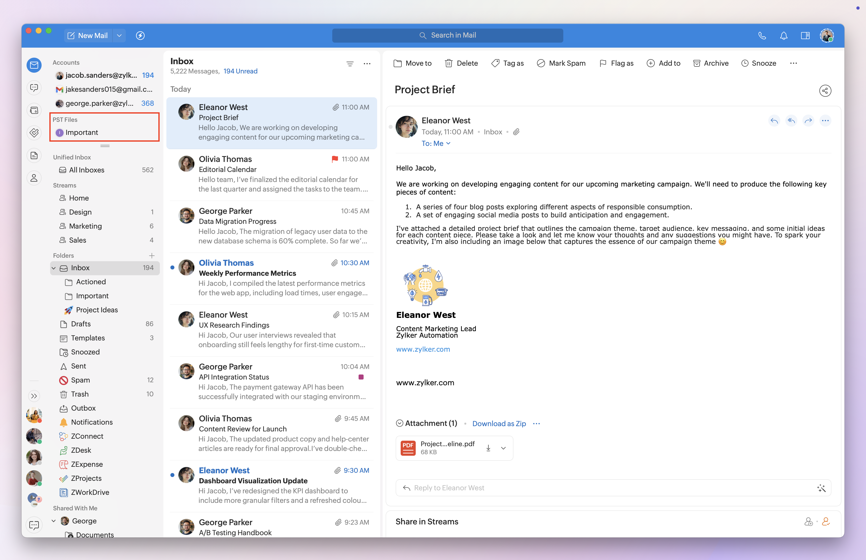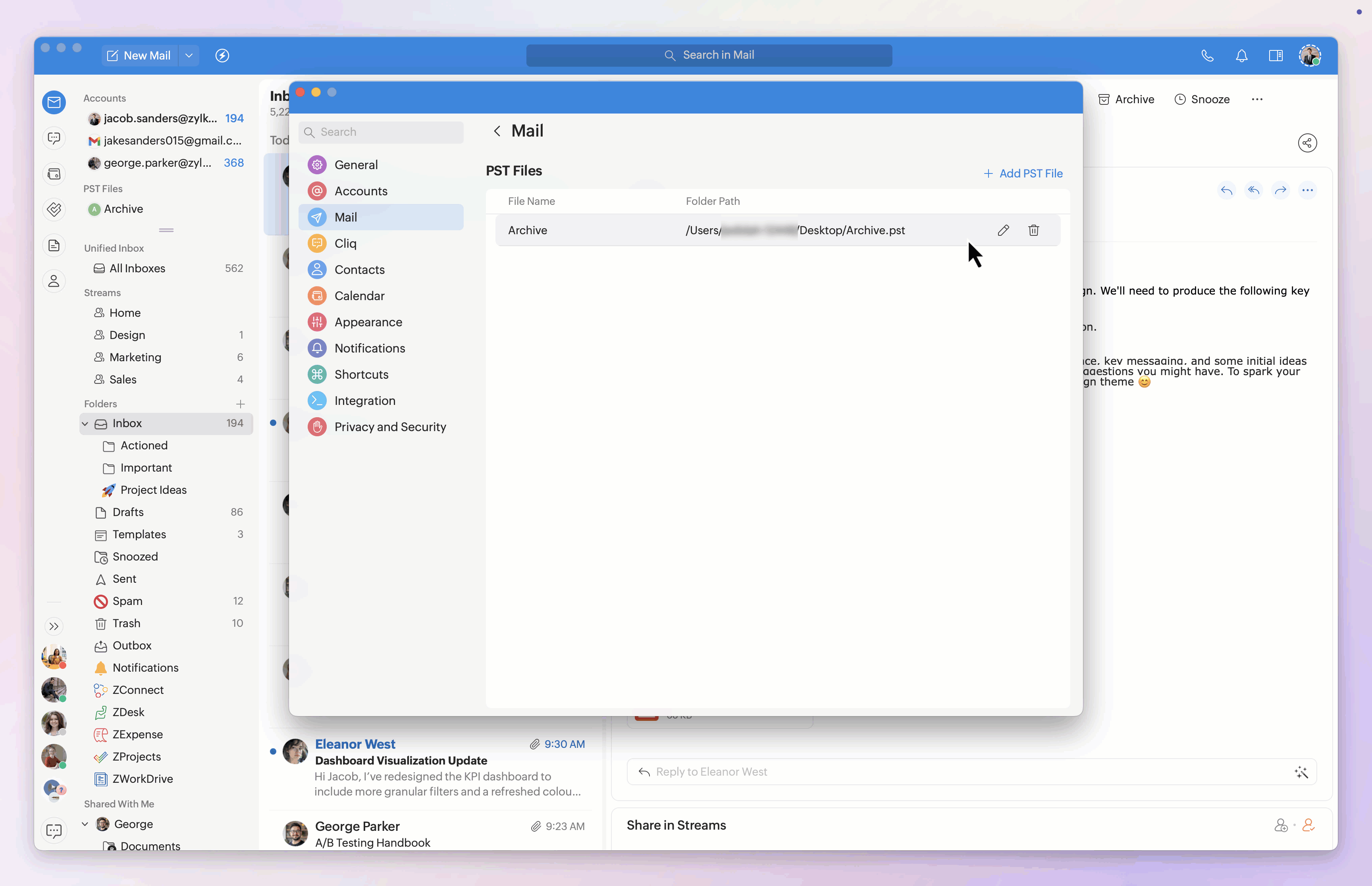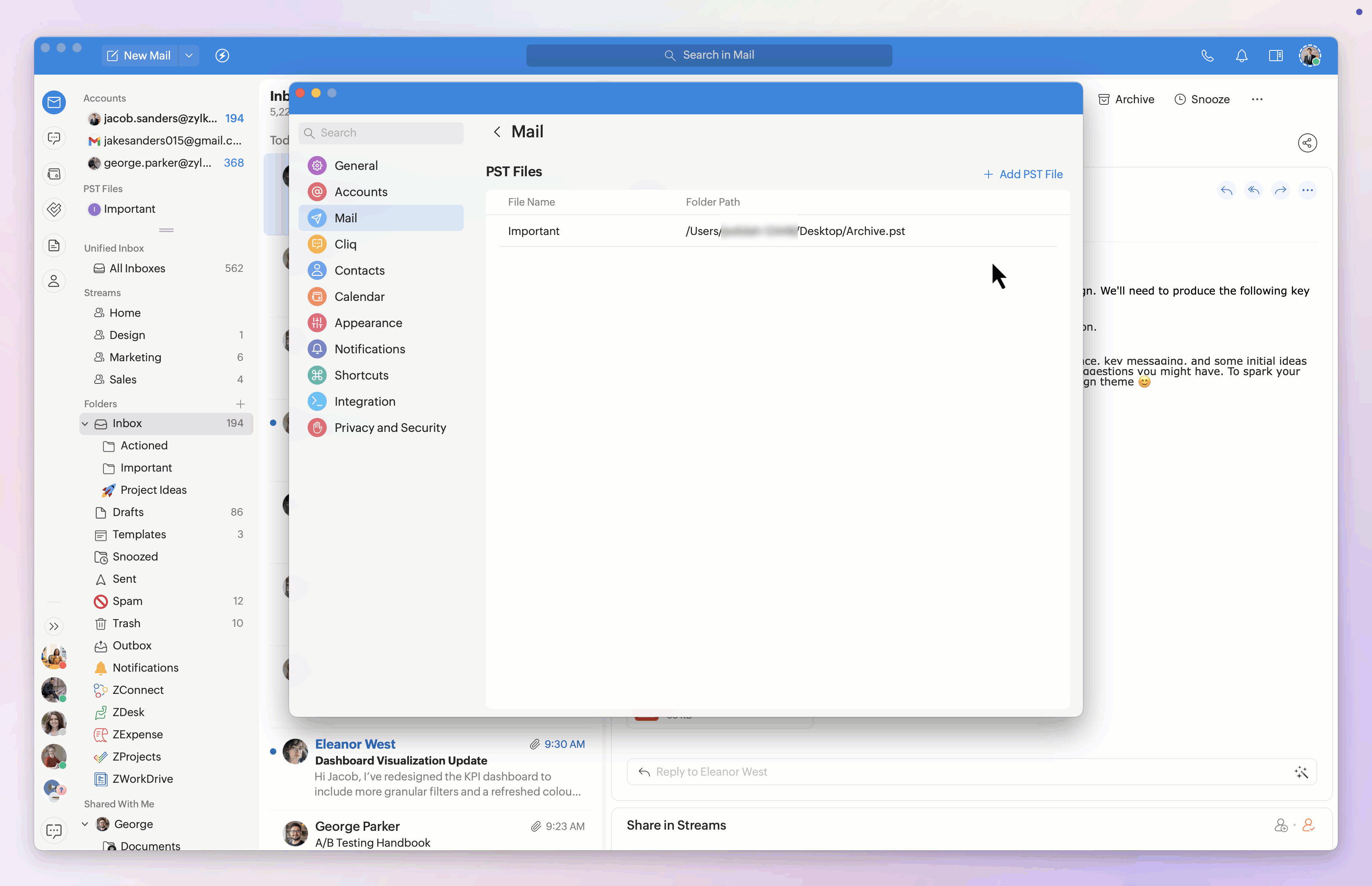 Note: This article explores mounting PST files in the Trident desktop app. Click here for the Zoho Mail web app's help documentation.If you're migrating from Outlook to Trident, you can easily access your locally stored Outlook email archives by mounting the PST files directly in Trident. Because the emails aren’t imported but only viewed, your storage space remains unaffected.