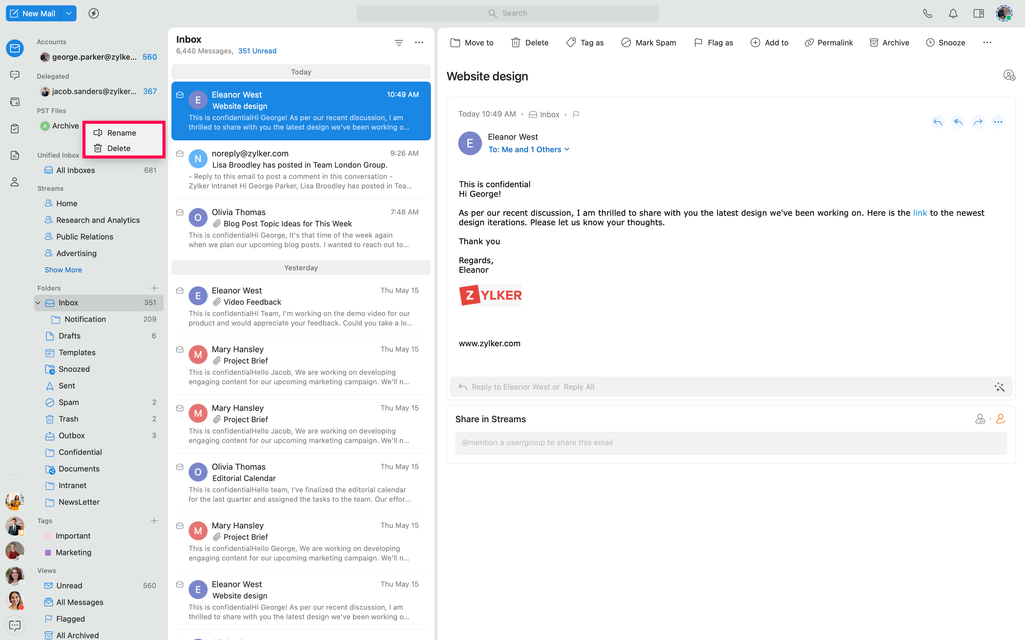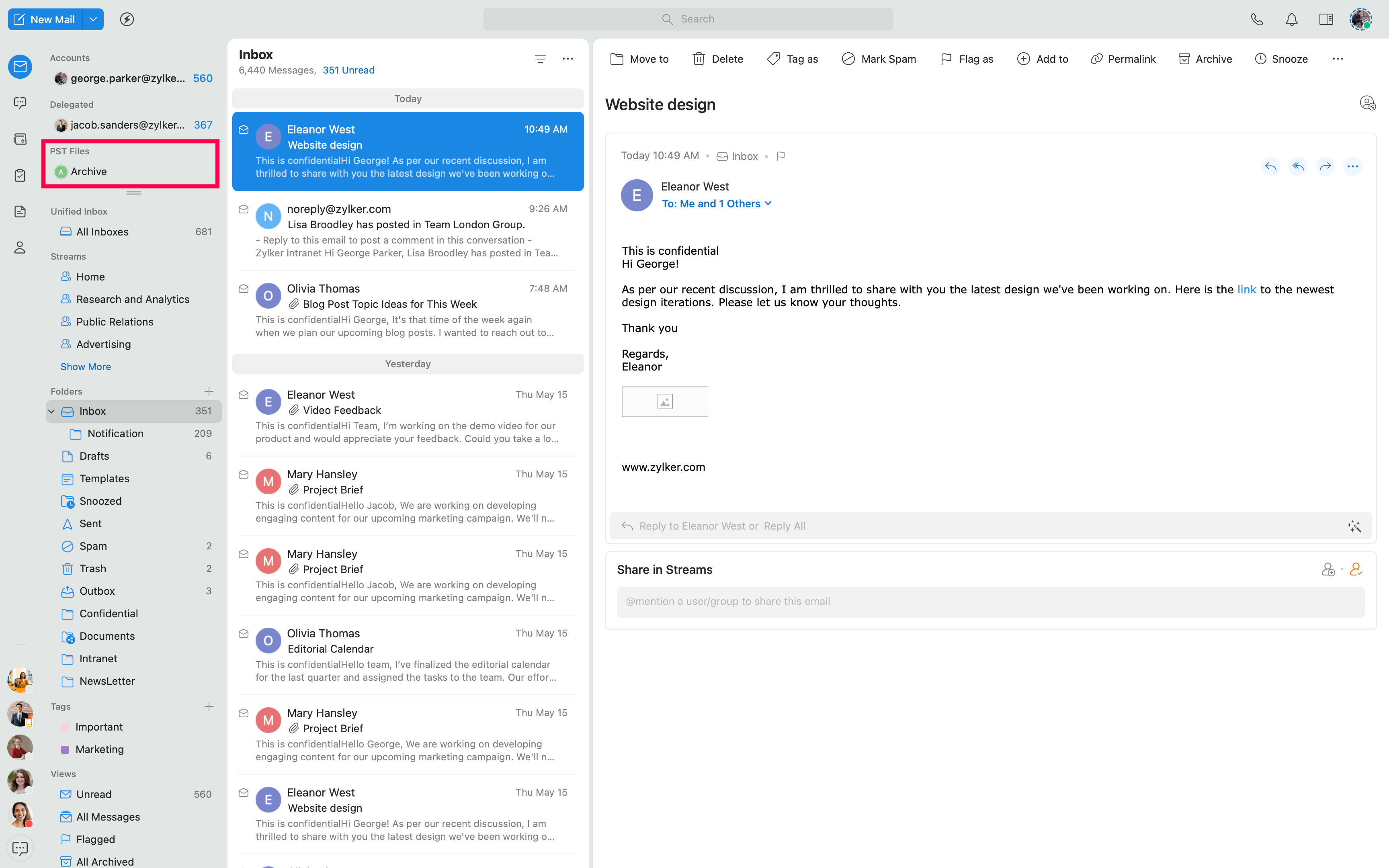 The mounted PST file is listed under the PST Files section in the left pane of the Mail module. On clicking a PST file, all of the email folders will be listed in the Folders section below, from where you can view the respective emails in the list and detail views.