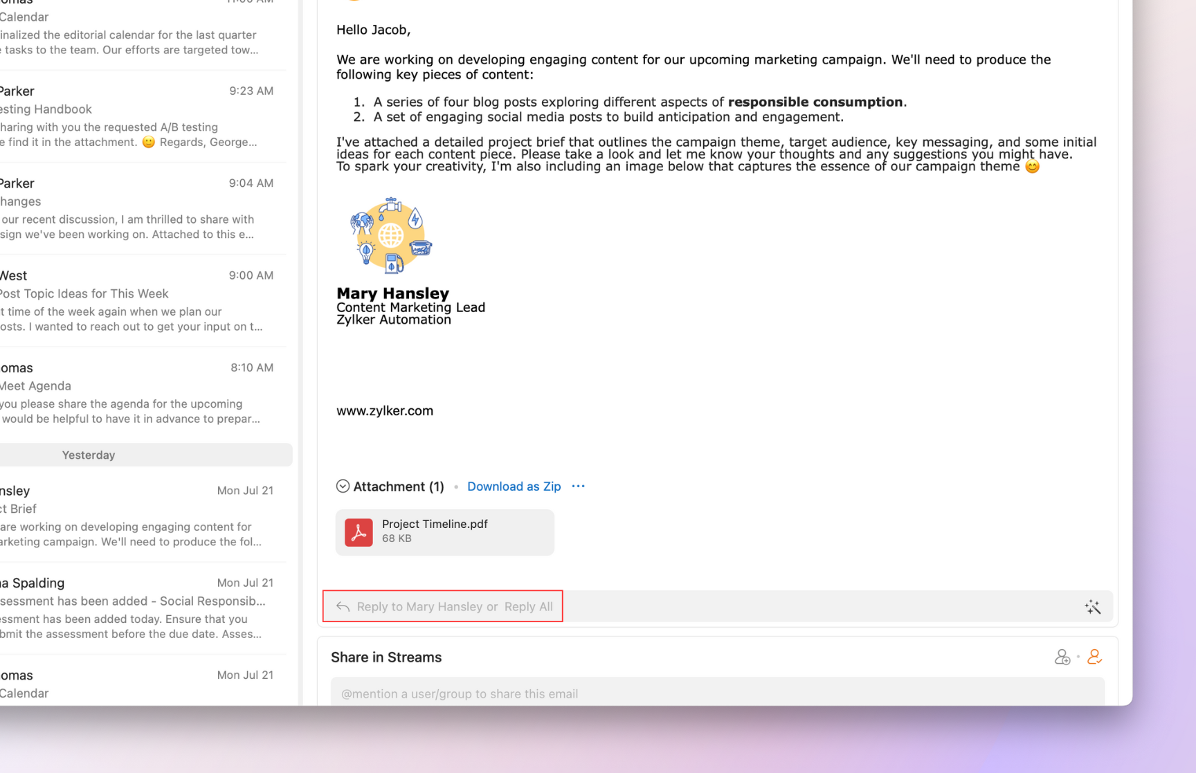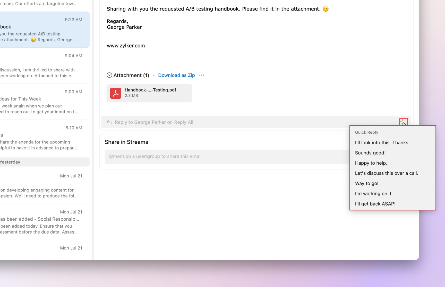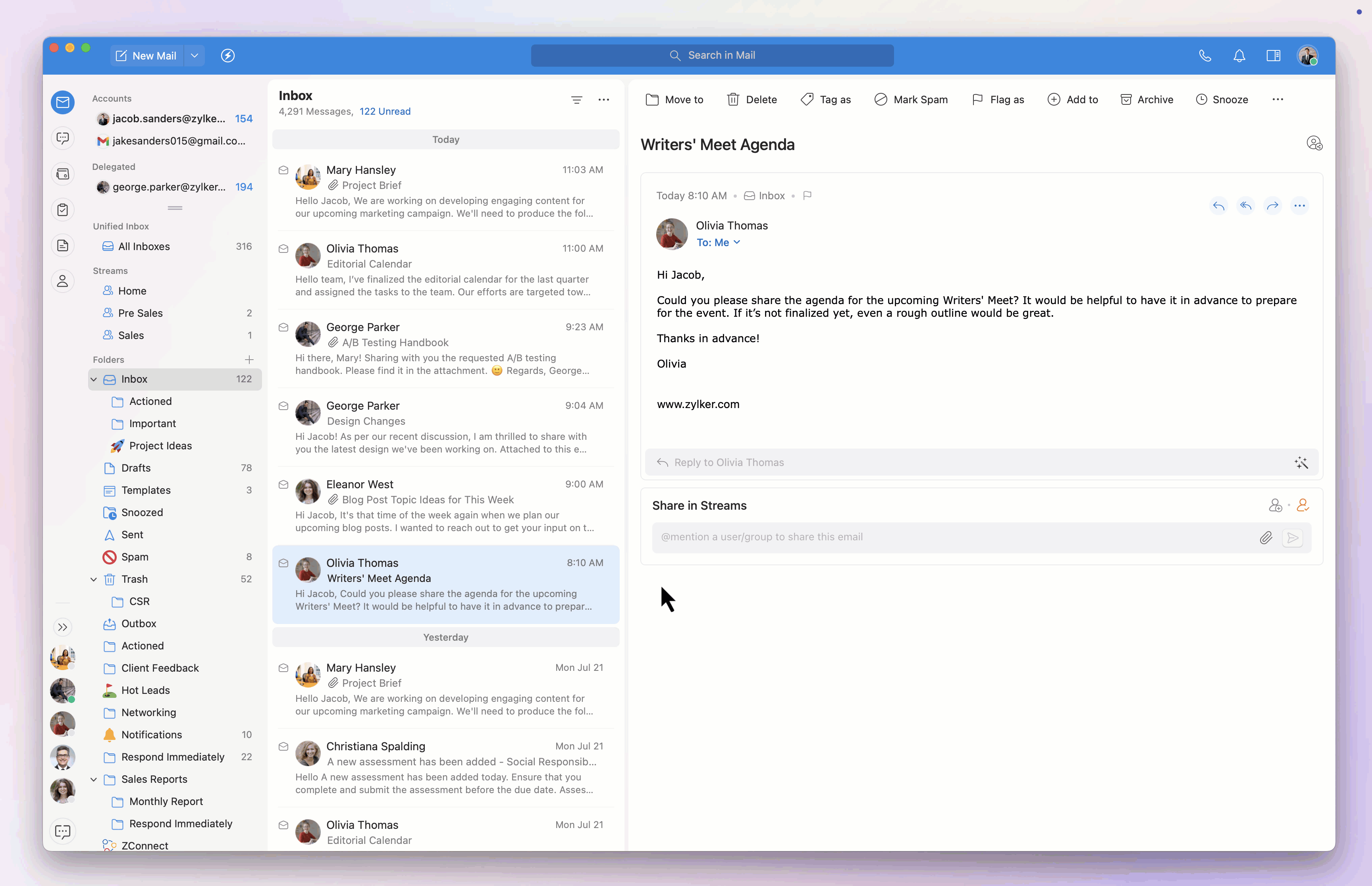 By sharing emails, you can easily handle email-related discussions and receive input from co-workers in the form of comments, avoiding multiple forwards and replies.