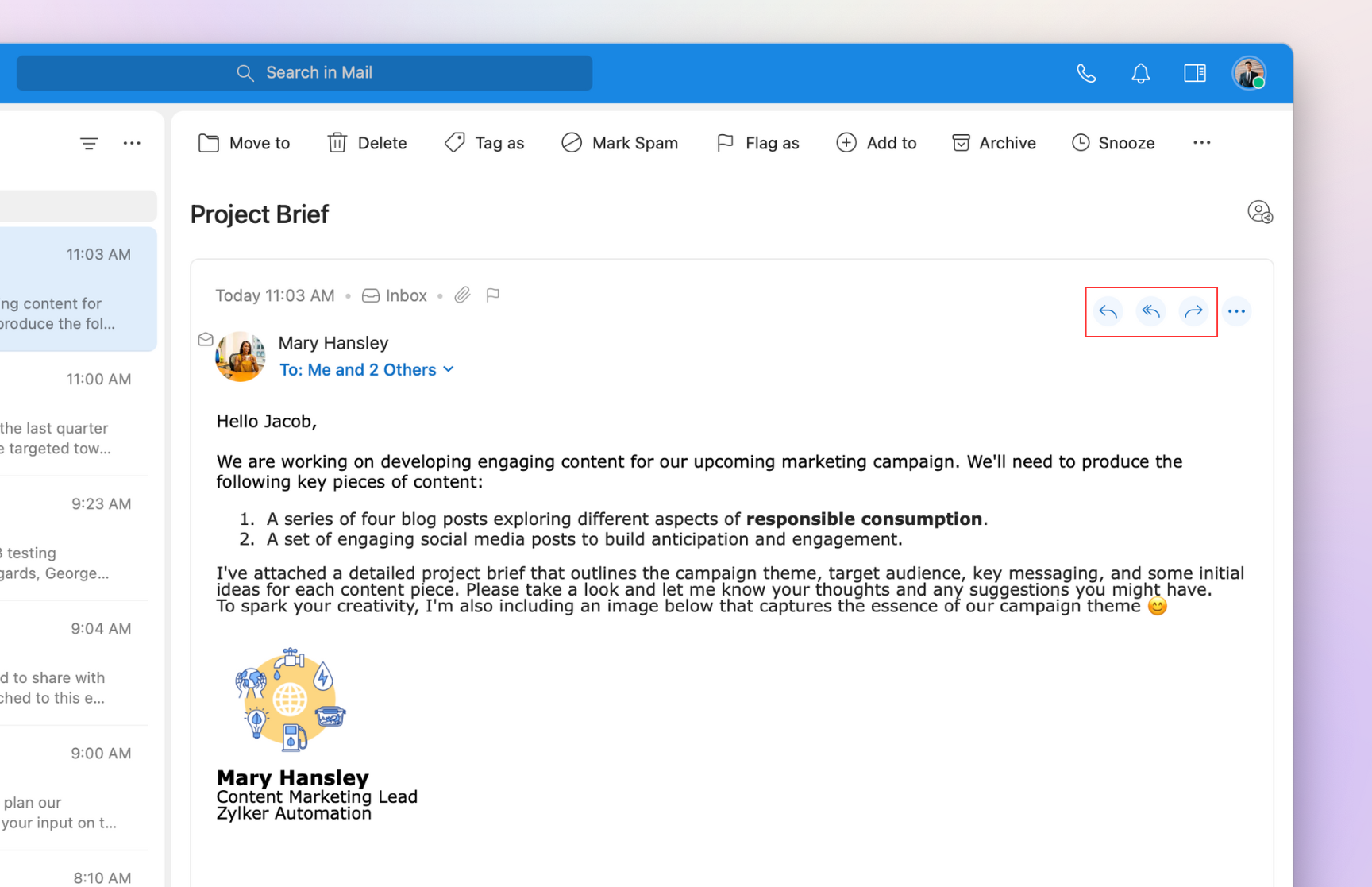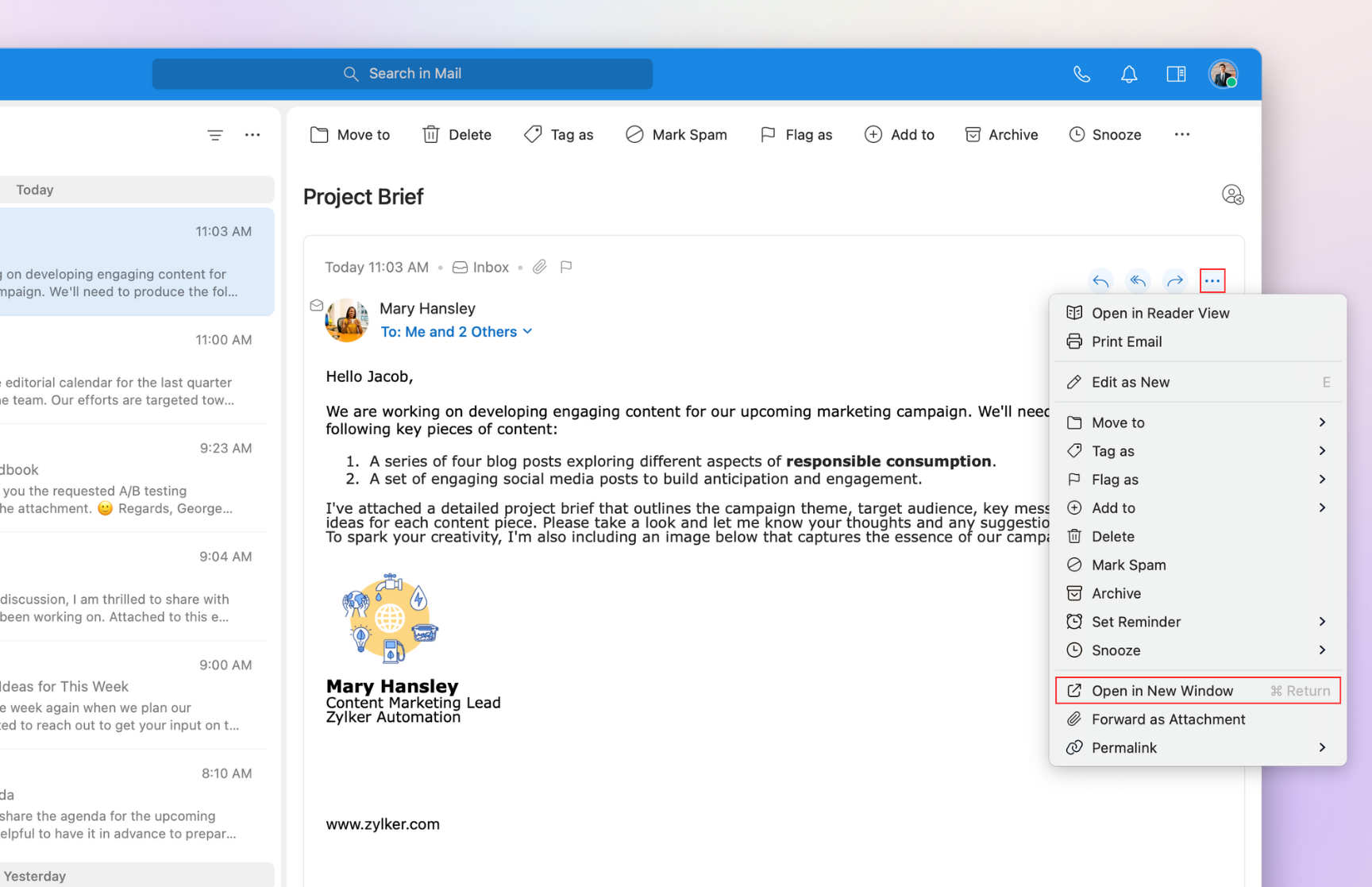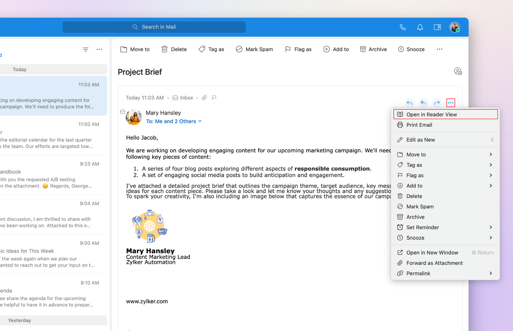 You can get an immersive email reading experience using the Reader View option. This will hide all email management options and present you with only the email content.