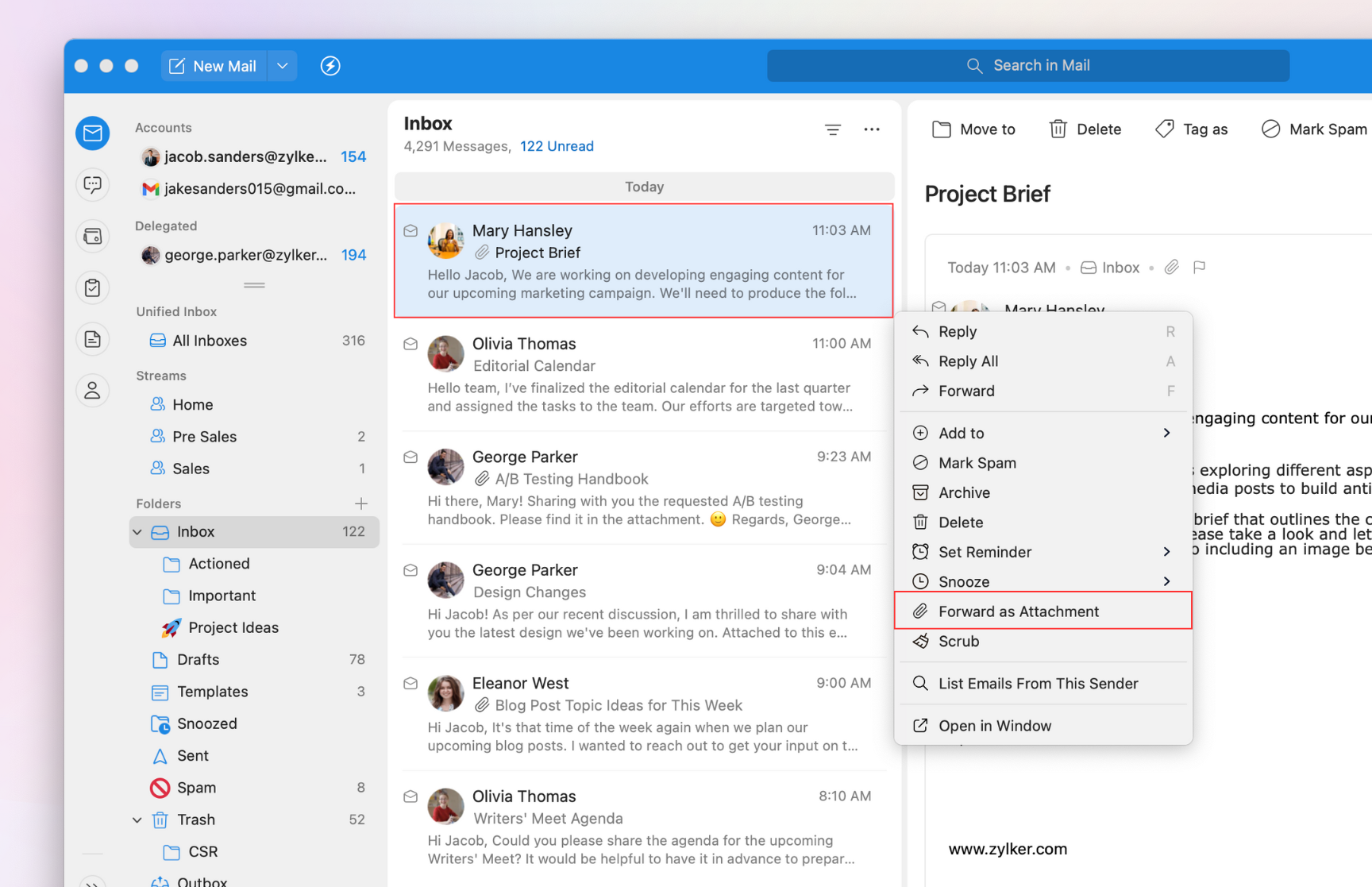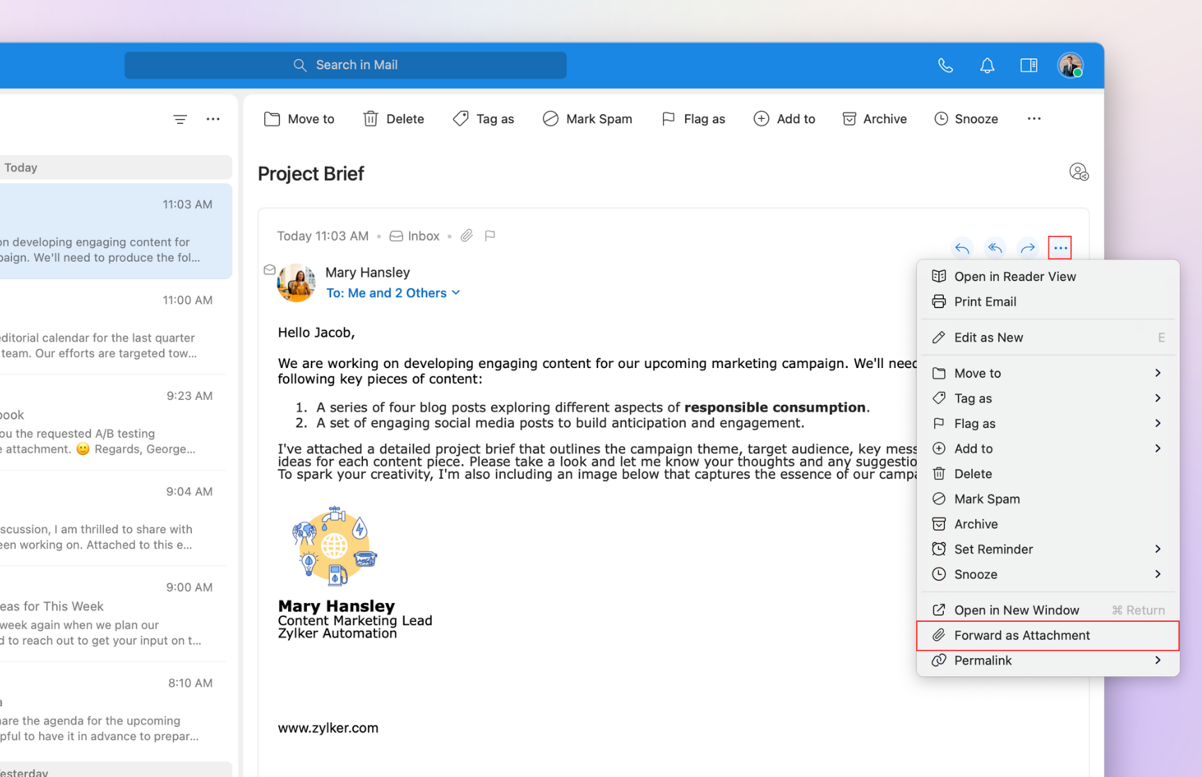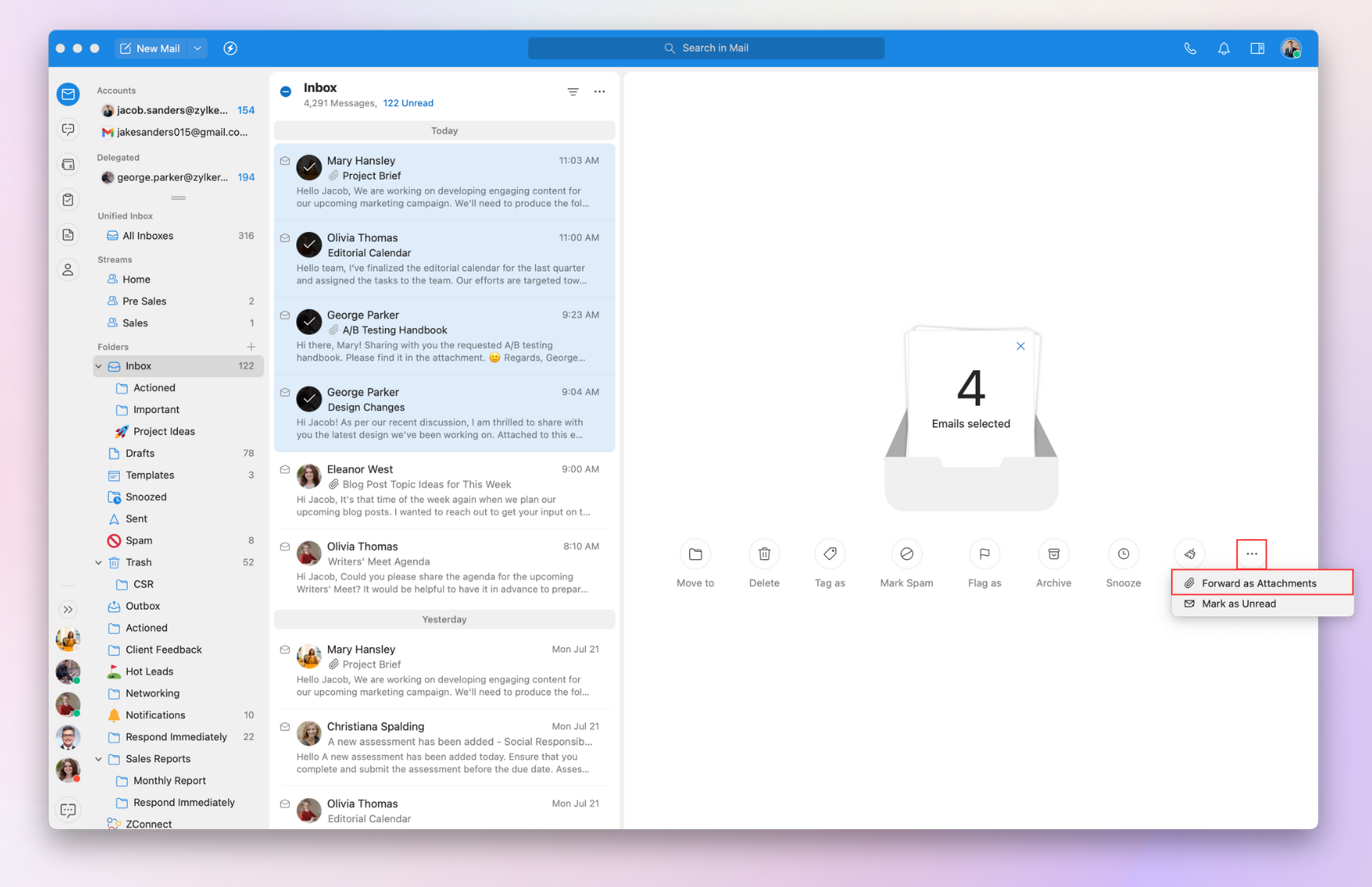 To forward multiple emails as attachments, multi-select emails from the list by clicking the sender's image or the hollow circle and selecting Forward as Attachment from the More icon in the detail view. You can also use the shortcut command ⌘ + A to multi-select up to 50 emails instantly.